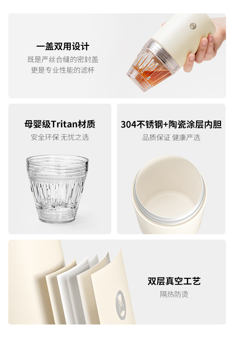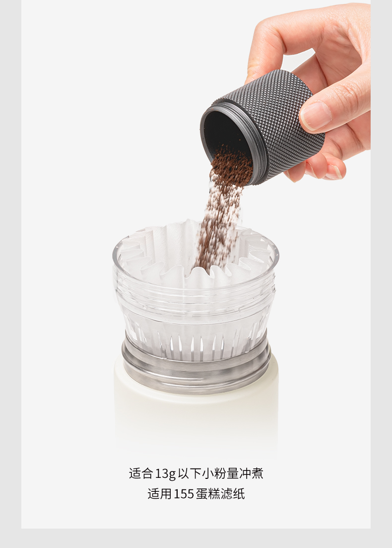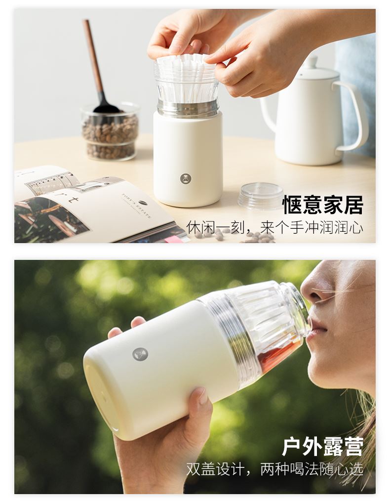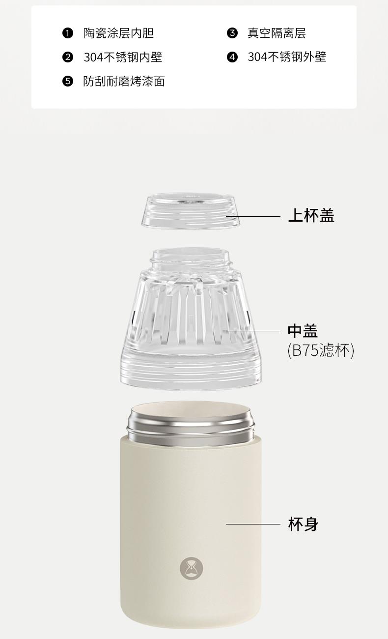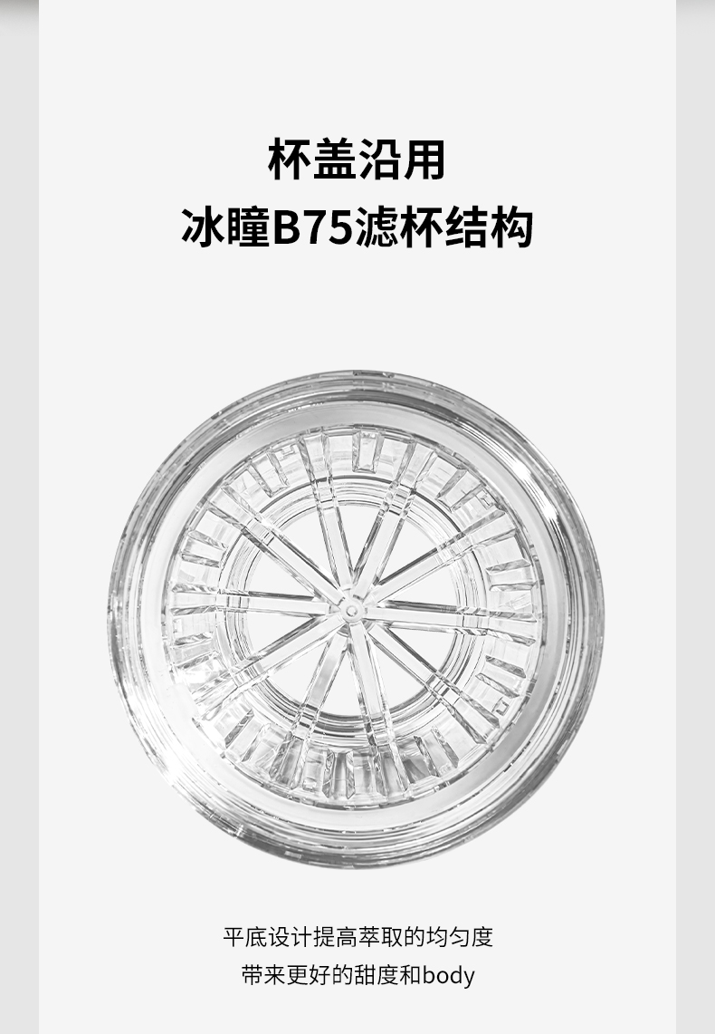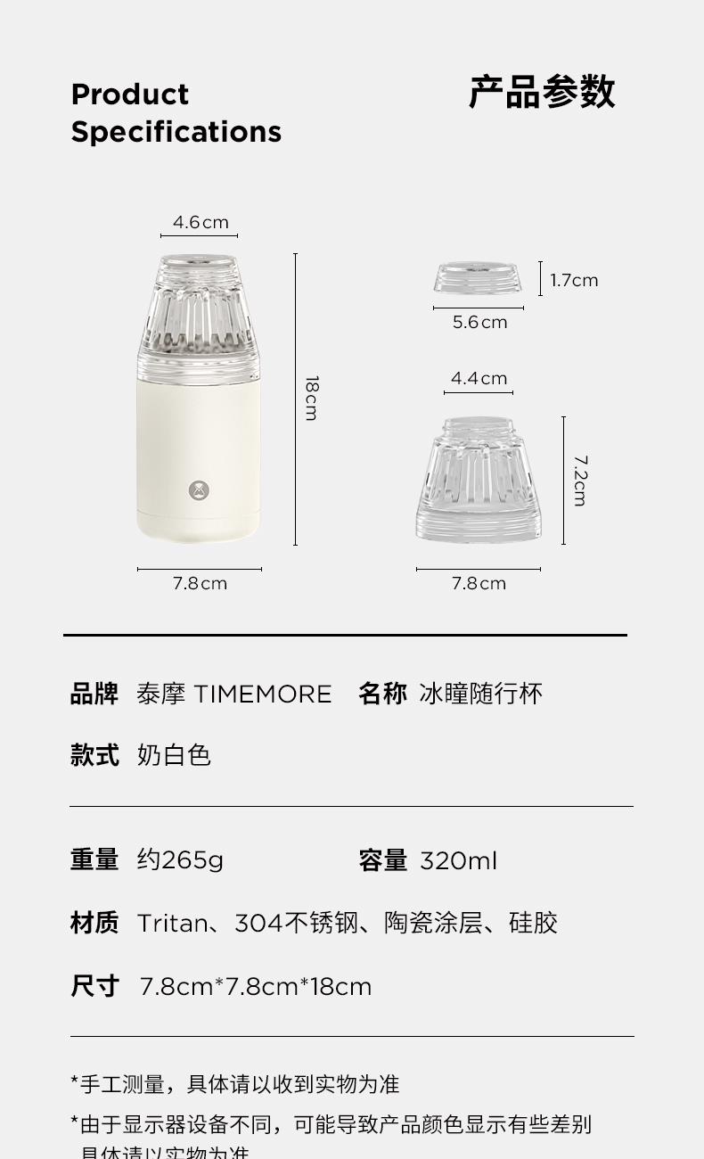 重量 约265g 容量 320ml 材质 Tritan、304不锈钢、陶瓷涂层、硅胶 尺寸 7.8cm*7.8cm*18cm 随行畅享 手冲无忧 轻轻一旋,杯盖秒变滤杯不仅是轻便易携的随行杯更是专业的手冲器具 一体化设计至简至美 尽显不凡 杯盖沿用冰瞳B75滤杯结构将滤杯与杯盖融为一体轻松萃取,乐享手冲