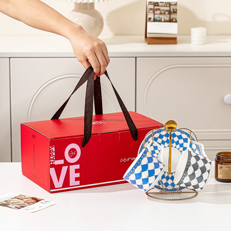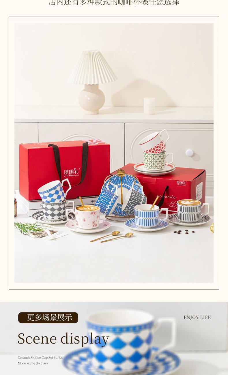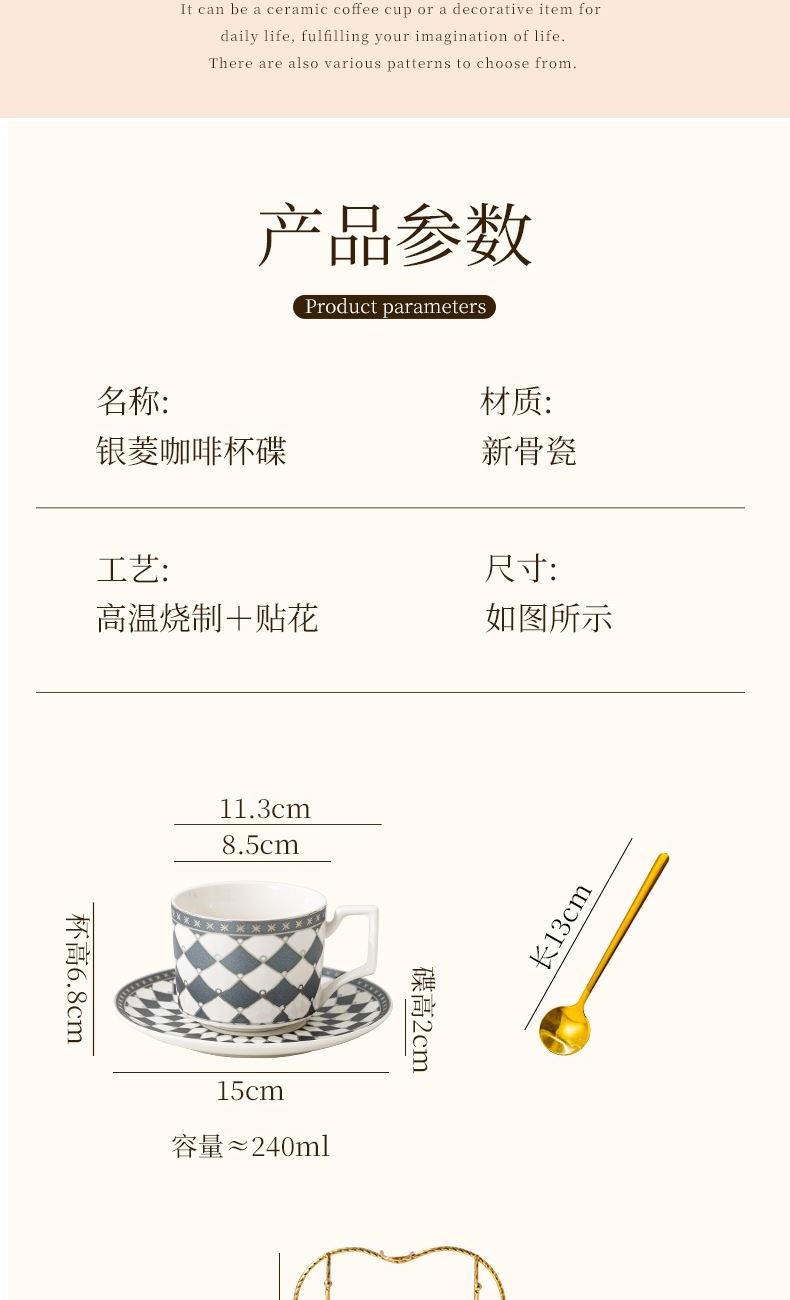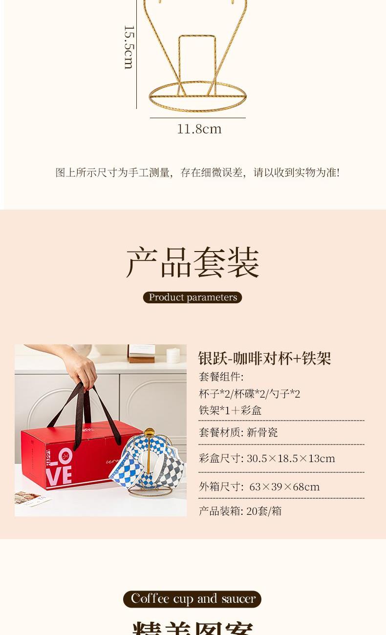 产品规格:咖啡杯=口径8.5cm,高度6.8cm,容量240ml;碟=直径15cm,高2cm;金勺=长度13cm;铁架=口径11.8cm,高度=15.5cm,彩盒尺寸:30.5*18.5*13cm