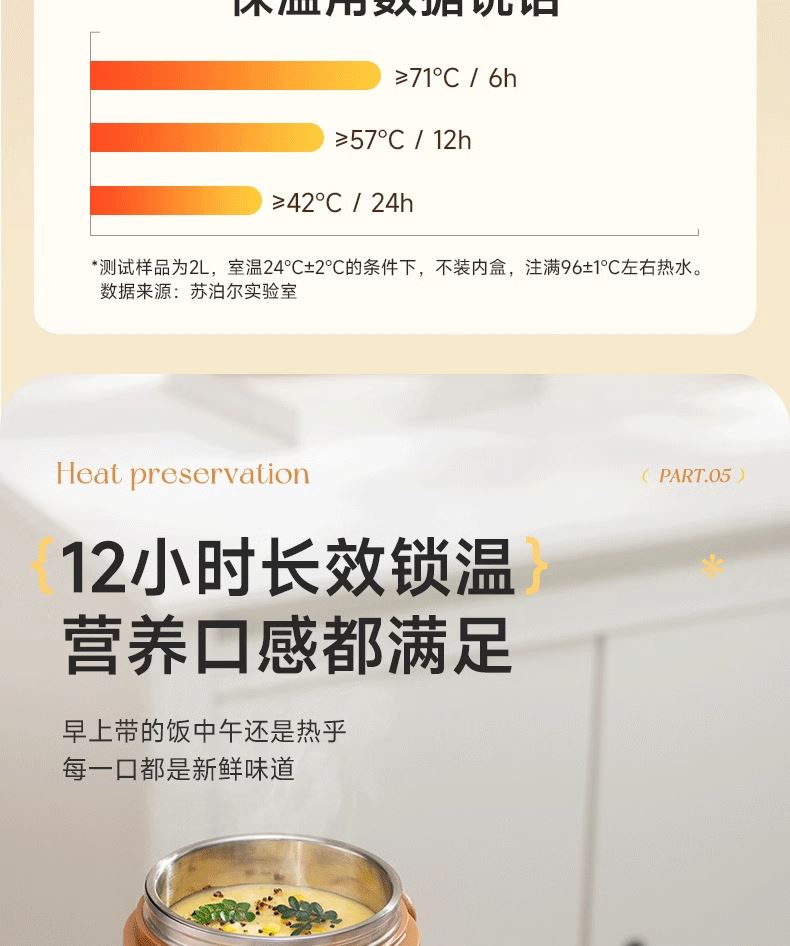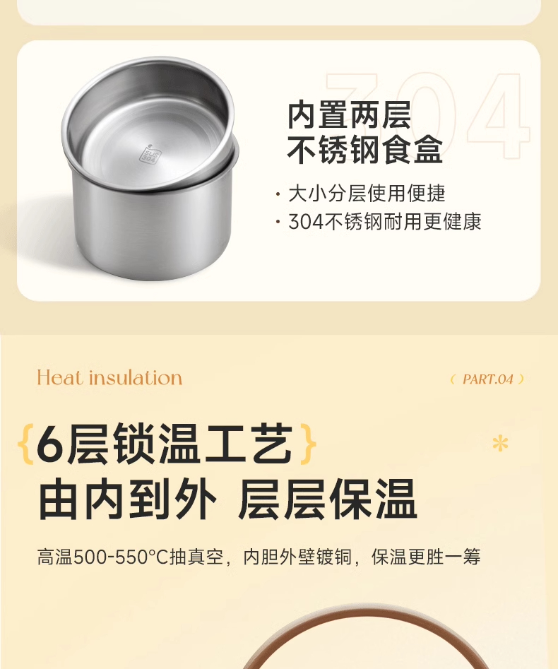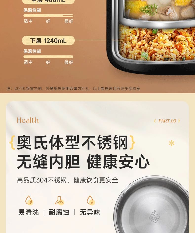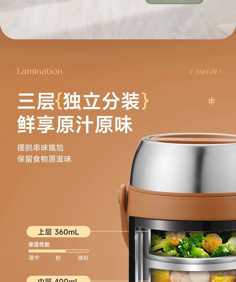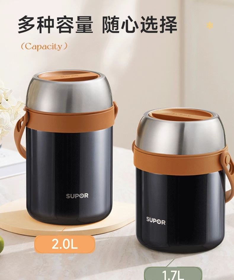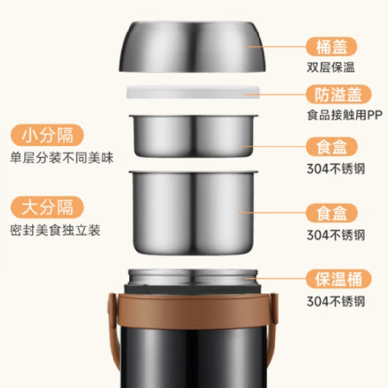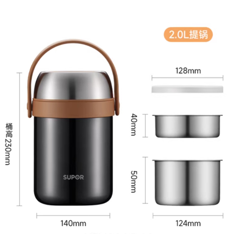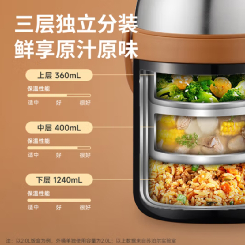 容量 2.0L 材质 304不锈钢 规格参数 产品说明 颜色:星辰黑 商品毛重:1.15kg 层数:3层 功能:真空保温,手提式 功能卖点 1、不锈钢内胆,保温保冷; 2、大容量,美味一次足够; 3、三层分隔不串味; 4、广口设计,清洗不操心。
