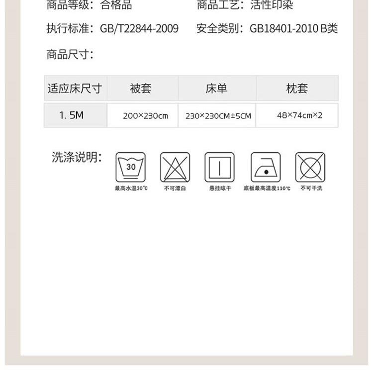 规格: 床单:230*230cm±5cm 被罩:200*230cm 枕套:48*74cmx2 面料:卡肤棉(聚酯纤维) 1.卡肤棉面料,采用新一代活性印染工艺,健康环保 2.棉质透气,吸湿亲肤舒适,轻薄透气,缩水率低