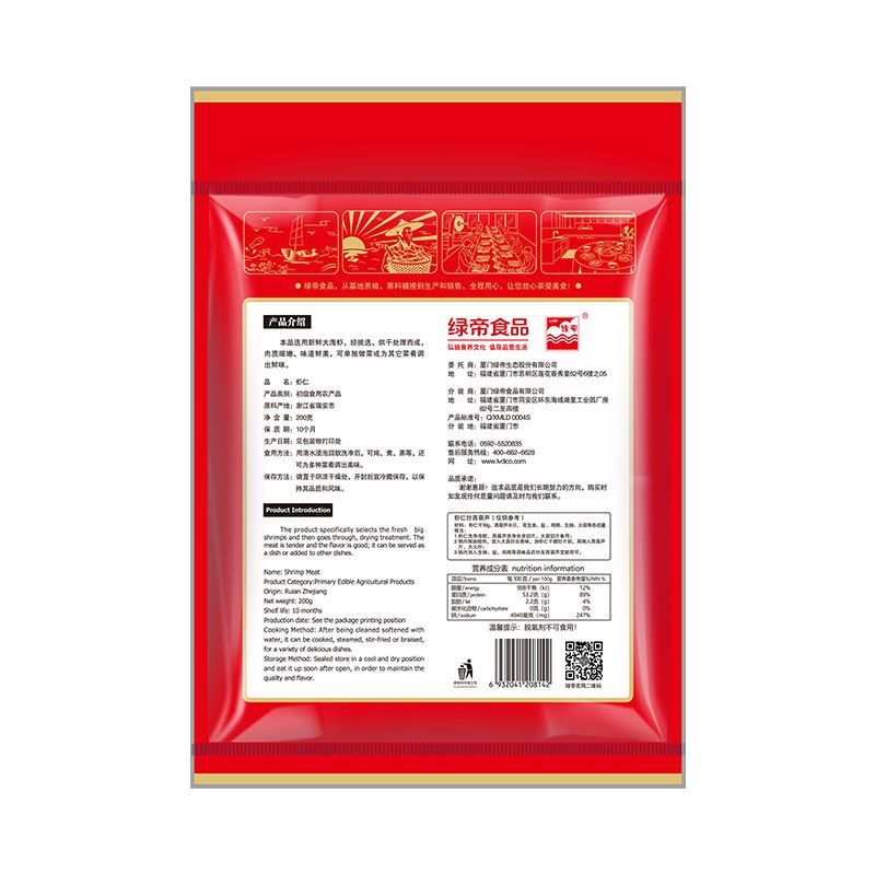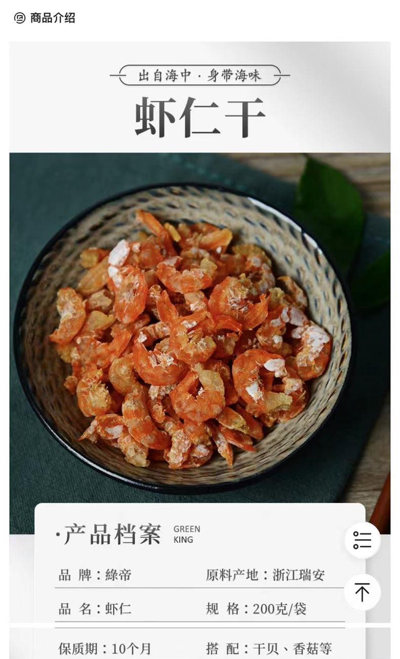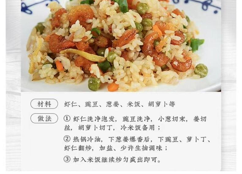 配料:虾仁 原料产地:浙江省瑞安市 净含量:200克 保质期:10个月 生产日期:见包装物打印处 食用方法:用清水浸泡回软洗净后,可炖、煮、蒸等,还可为多种菜肴调出美味。 本品选用新鲜大海虾,经挑选、烘干处理而成,肉质细嫩、味道鲜美,可单独做菜或为其它菜肴调出美味。