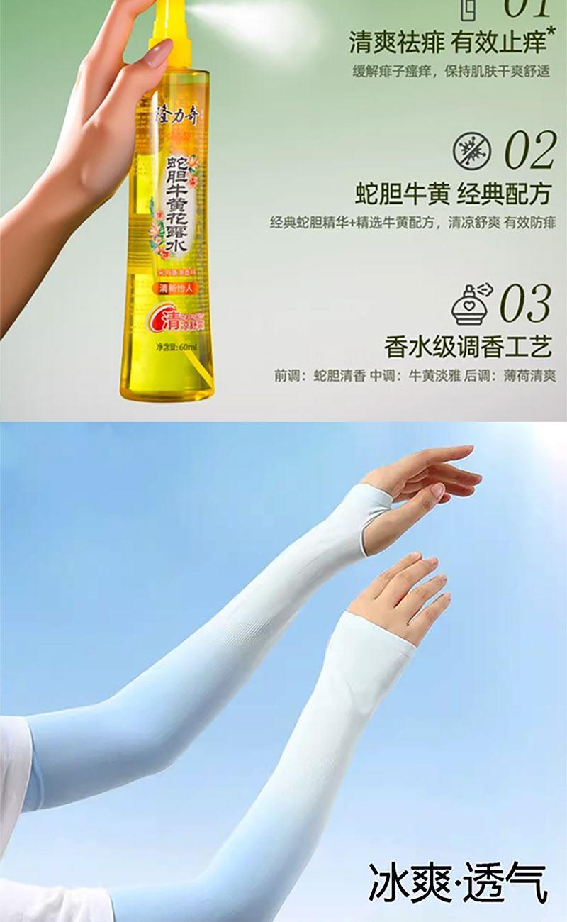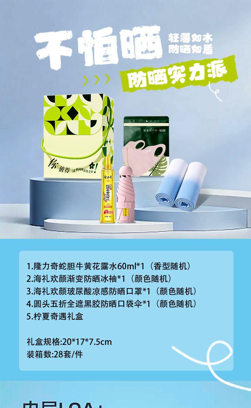 1.隆力奇蛇胆牛黄花露水60ml*1(香型随机) 2.海礼欢颜渐变防晒冰袖*1(颜色随机) 3.海礼欢颜玻尿酸凉感防晒口罩*1(颜色随机) 4.圆头五折全遮黑胶防晒口袋伞*1(颜色随机) 5.柠夏奇遇礼盒