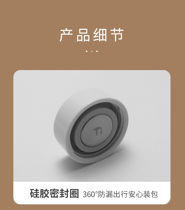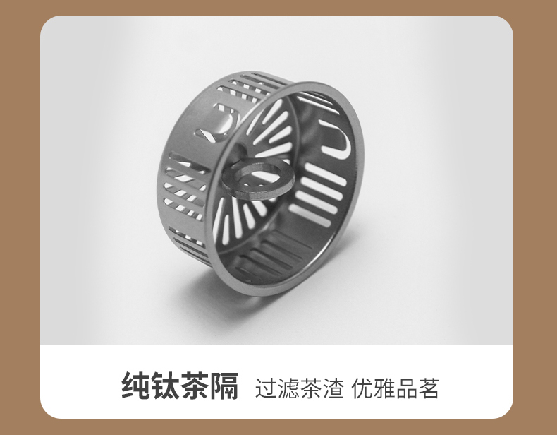 · 硅胶密封圈, 360°防漏,出行安心装包。 · 纯钛茶隔,过滤茶渣, 优雅品茗。 · 圆润杯口,光滑细腻, 触感舒适。 · 硅胶底垫,放置稳固, 防滑耐磨。
