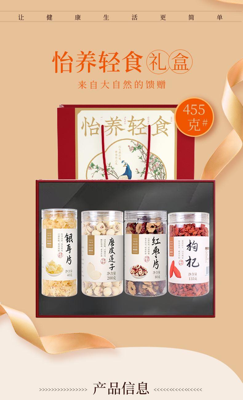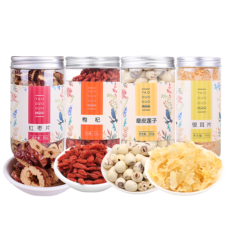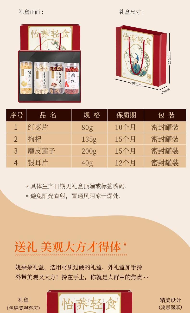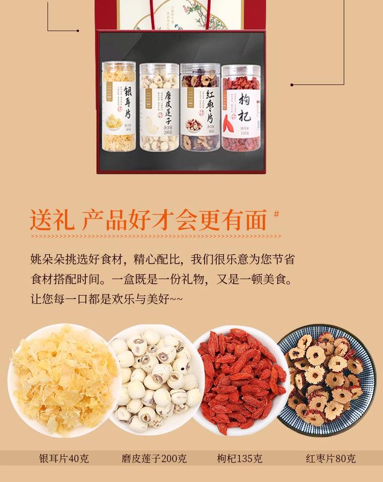 姚朵朵银耳片40克 磨皮莲子200克(罐装) 姚朵朵甲级枸杞135克 姚朵朵红枣片80克 包装盒-怡养轻食