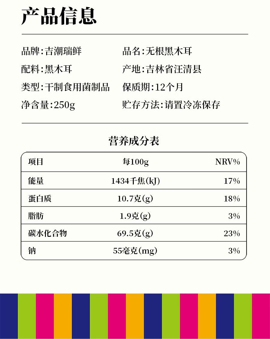 吉潮瑞鲜无根黑木耳250克*1袋 配料:黑木耳 产地:吉林省汪清县 类型:干制食用菌制品保质期:12个月 净含量:250g 贮存方法:请置冷冻保存