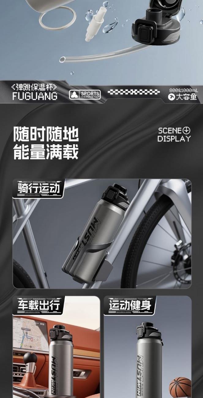 容量:800/1000ml 颜色:黑色灰本色 尺寸:82*238mm 材质:316L奥氏体不锈钢内胆、食品级PP,PC配件。 不怕热水烫嘴感温硅胶遇热变色。 食品级吸管设计柔软不上嘴,便携是手方便出行,硅胶耐磨底垫静音防滑设计。 包装:单瓦盒