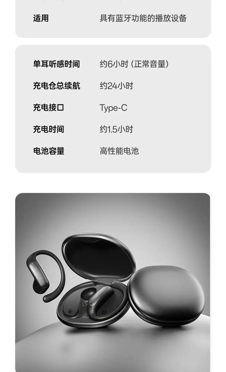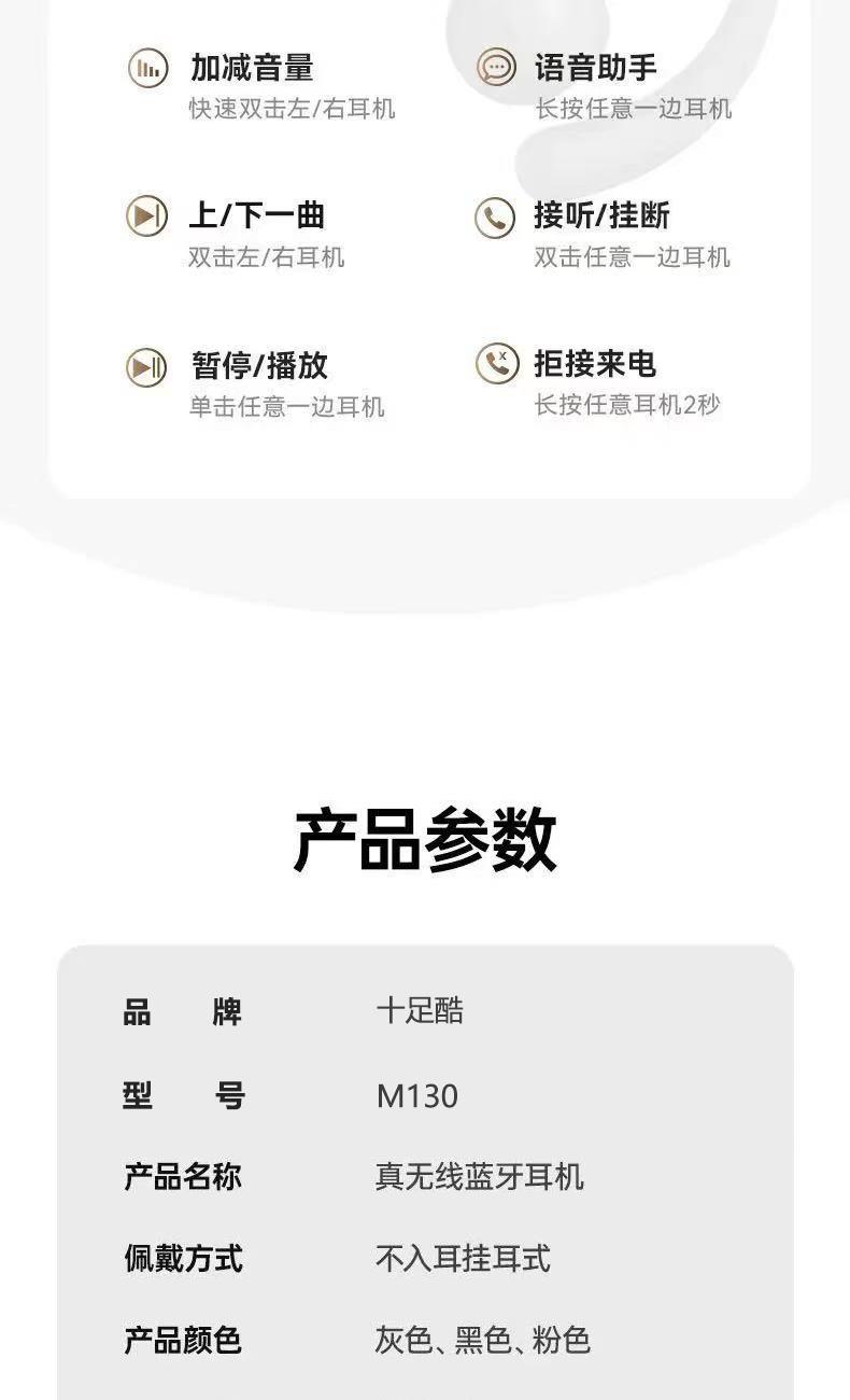 蓝牙:M130 蓝牙芯片:中科蓝讯5756C-2 蓝牙版本:BT5.4 连接距离:10M 裸机净重:40g 电池仓容量:250mah, 耳机容量:40mA 通话时长:约3H 音乐时长:约4H 充电仓尺寸:20**62*27mm 产品颜色:灰,粉 包装尺寸:138*109*35mm