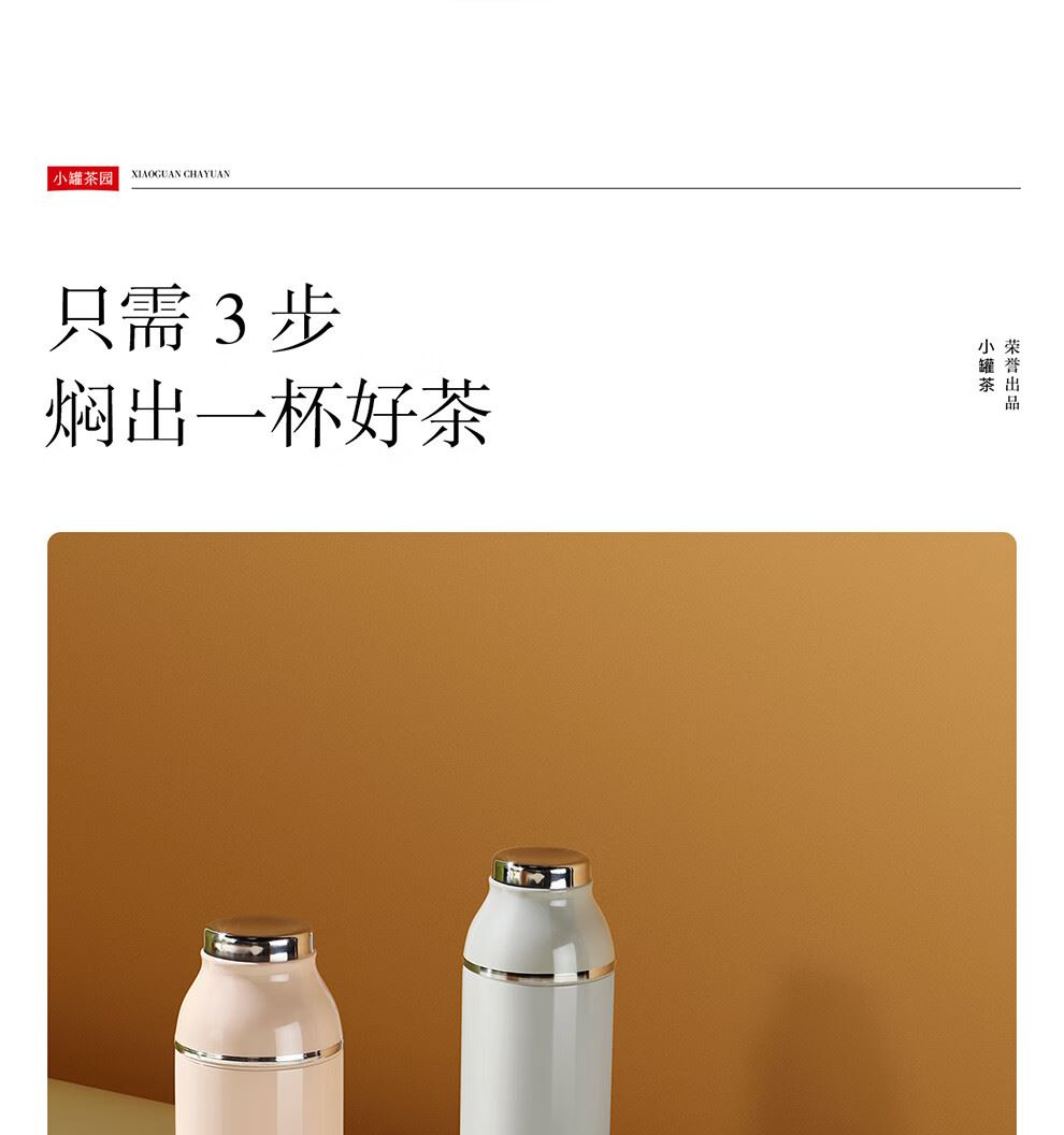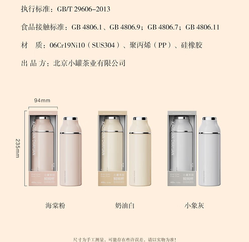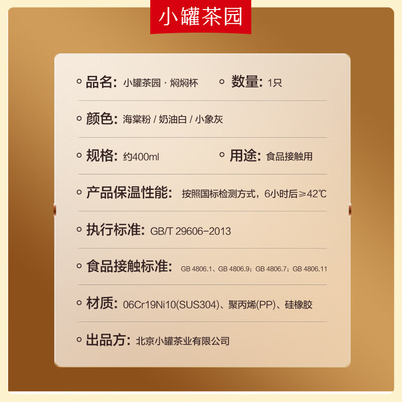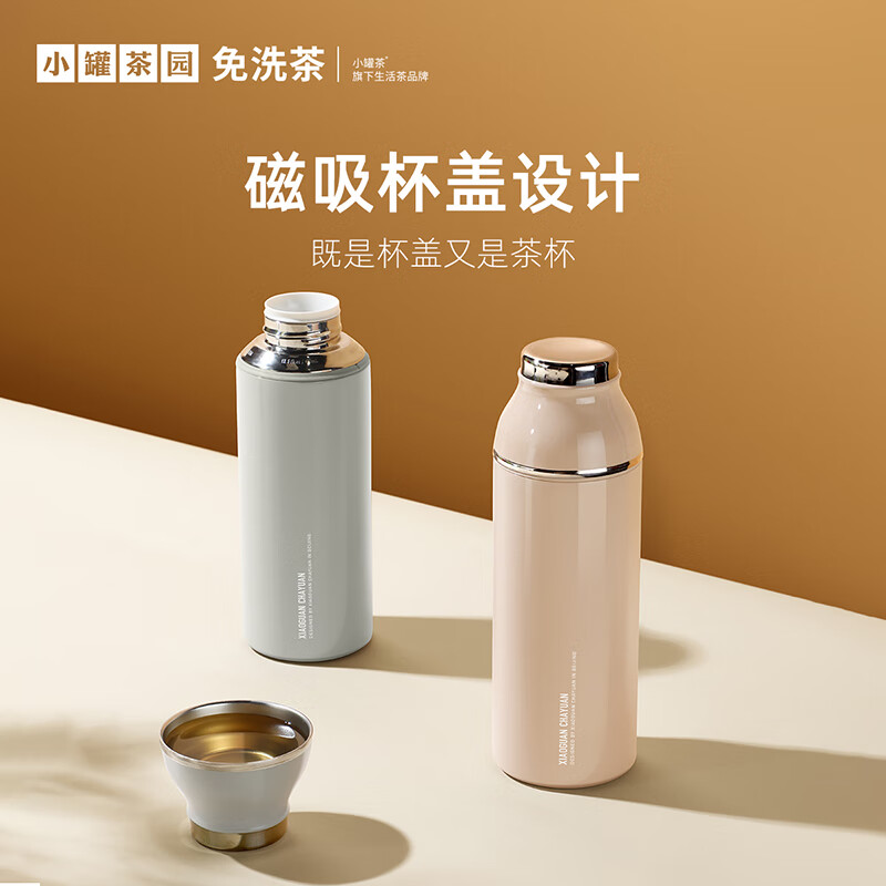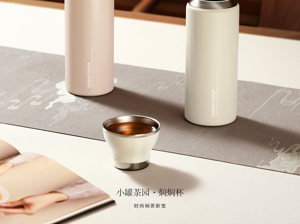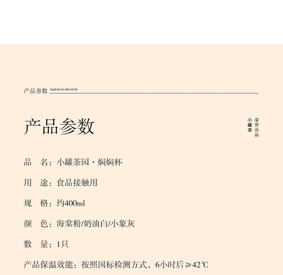 小罐茶旗下生活茶品pai | 小罐茶园 摩登焖杯 保温锁香 400ml容量 | 便捷焖泡 | 复古百搭 保温保冷 | 焖泡皆可 | 四季适用 烤漆工艺 时尚五色 百搭又吸睛 漆面均匀、色彩饱满,五色可选,整体气质复古摩登 夏季冷泡茶 冬季热焖茶 这一杯 四季适用 能焖香,会保温 每一口都是惊喜 经真空隔热层、镀铜层双重保温工艺,长效保温,轻轻松松焖好茶。 磁吸杯盖设计 既是杯盖又是茶杯 磁吸杯盖,开合干脆利落,既是杯盖又是茶盏;双层敞口造型,端茶不烫手,喝茶更自在。 超in细节加持 尽显不凡品位 可拆卸茶滤,轻松过滤茶渣,拆卸无需湿手。 静音杯底,杯底带硅橡胶圈,拿取放置防滑消音。 焖泡茶更香 喝茶有温度 户外/旅行/出差/居家,焖杯好茶慢慢喝。 品ming:小罐茶园·焖焖杯 用途:食品接触用 规格:约400ml 颜色:海棠粉/奶油自/小象灰(三色可选) 数量:1只 出品方:北京小罐茶业有限公司