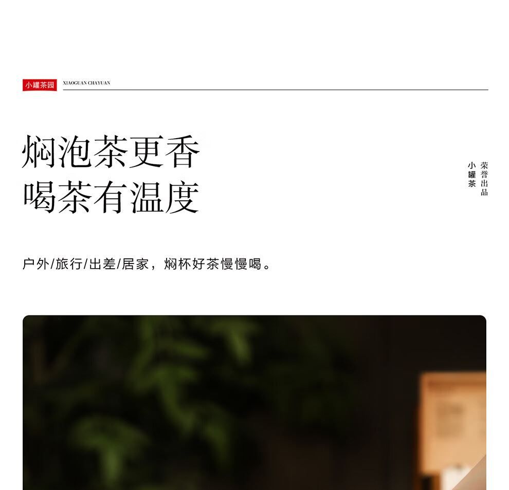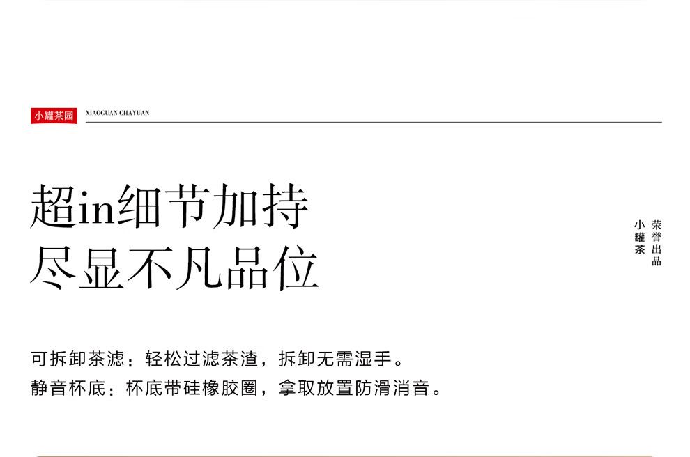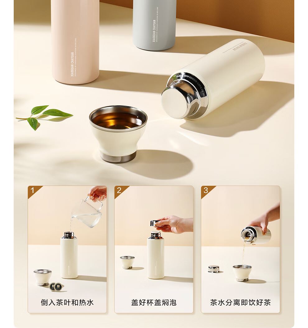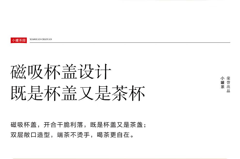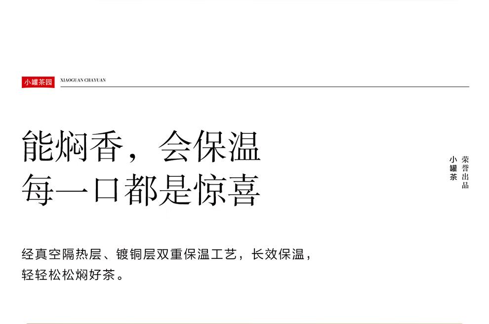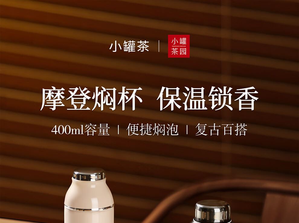 小罐茶旗下生活茶品pai | 小罐茶园 摩登焖杯 保温锁香 400ml容量 | 便捷焖泡 | 复古百搭 保温保冷 | 焖泡皆可 | 四季适用 烤漆工艺 时尚五色 百搭又吸睛 漆面均匀、色彩饱满,五色可选,整体气质复古摩登 夏季冷泡茶 冬季热焖茶 这一杯 四季适用 能焖香,会保温 每一口都是惊喜 经真空隔热层、镀铜层双重保温工艺,长效保温,轻轻松松焖好茶。 磁吸杯盖设计 既是杯盖又是茶杯 磁吸杯盖,开合干脆利落,既是杯盖又是茶盏;双层敞口造型,端茶不烫手,喝茶更自在。 超in细节加持 尽显不凡品位 可拆卸茶滤,轻松过滤茶渣,拆卸无需湿手。 静音杯底,杯底带硅橡胶圈,拿取放置防滑消音。 焖泡茶更香 喝茶有温度 户外/旅行/出差/居家,焖杯好茶慢慢喝。 品ming:小罐茶园·焖焖杯 用途:食品接触用 规格:约400ml 颜色:海棠粉/奶油自/小象灰(三色可选) 数量:1只 出品方:北京小罐茶业有限公司