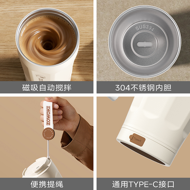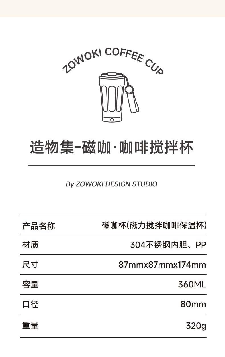 容量:360ml | 净重:320g | 口径:80mm 304不锈钢内胆,食品级材质,使用健康放心。 保温保冷,四季可用。 磁力搅拌无需手动。一键按压搅拌,解放双手。 便携提绳设计,出行更方便。