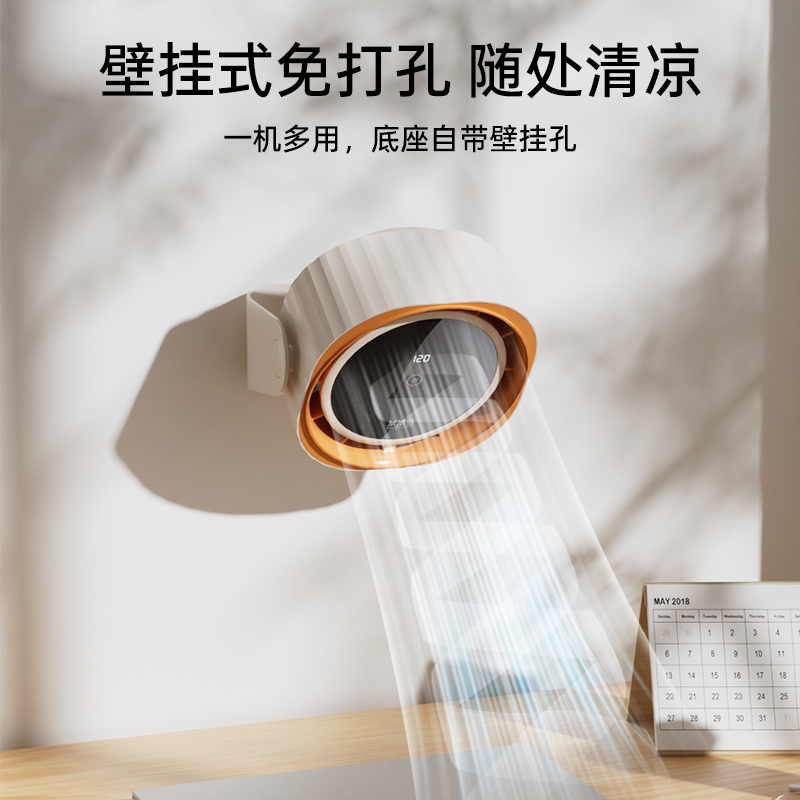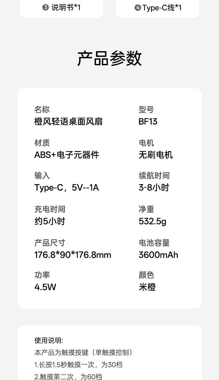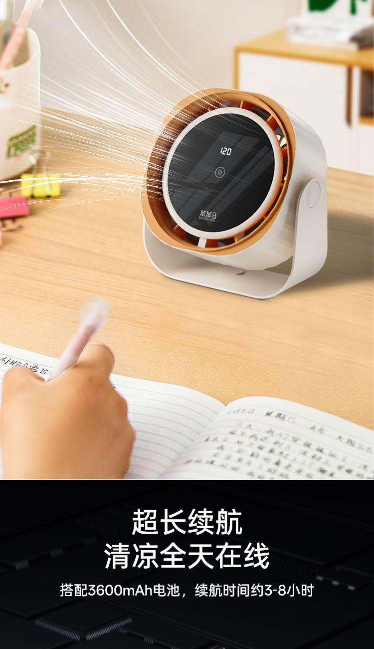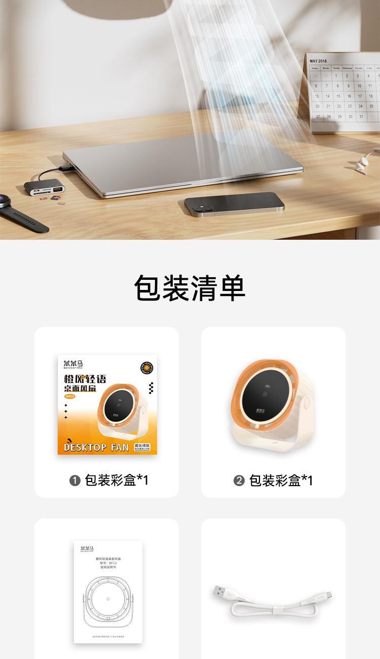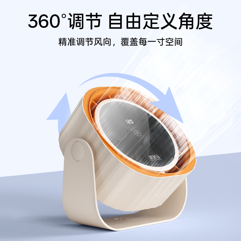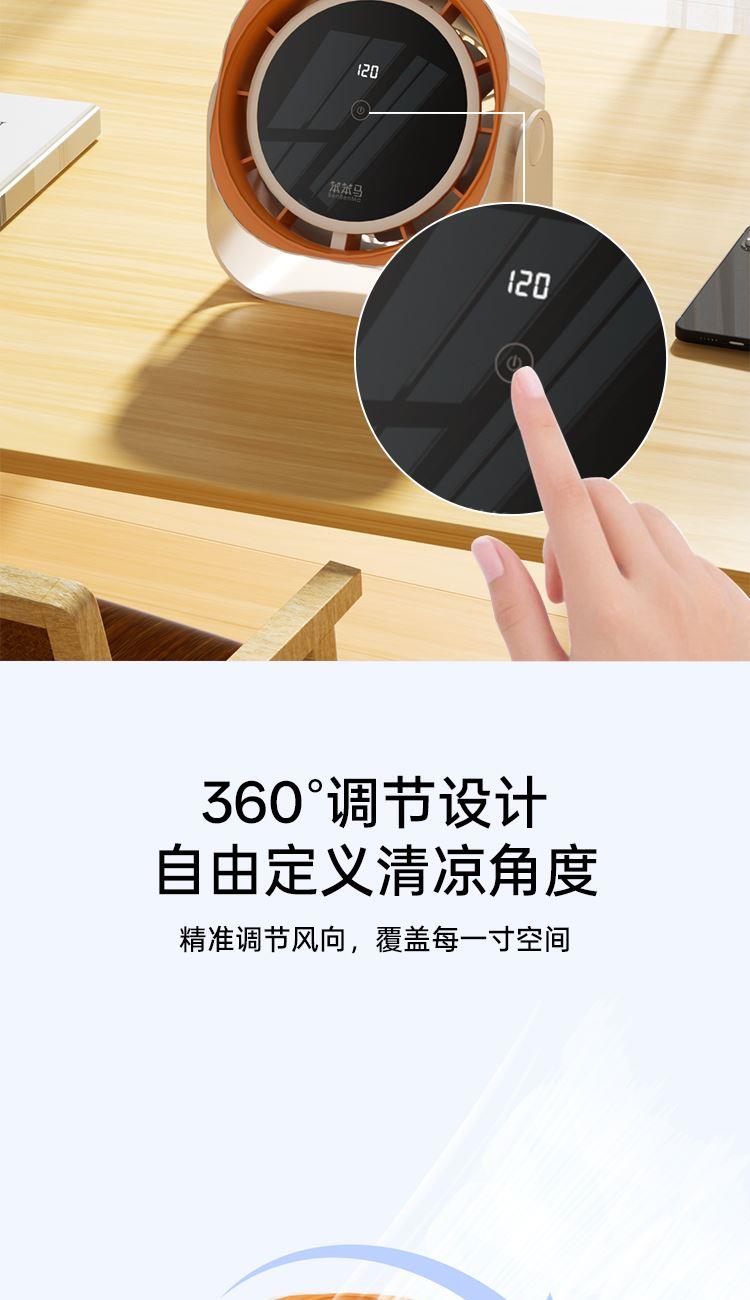 电池容量:3600mAh 产品尺寸:176.8*90*176.8MM 包装尺寸:181*94*182.6mm外箱尺寸:563*393*566mm产品重量: 净重532.5g 电机:无刷电机 功率:4.5W 续航时间:约3-8h充电时间:约5h颜色:米橙 材质:ABS+电子元器件 5寸扇叶,风力强劲,触摸开关 静音无刷电机,搭配3600mAh电池,超长续航,360度可调节,可桌面可壁挂使用 120档可调风力满足不同需求,高清数显档位和电量一目了然,多场景使用