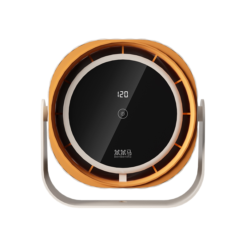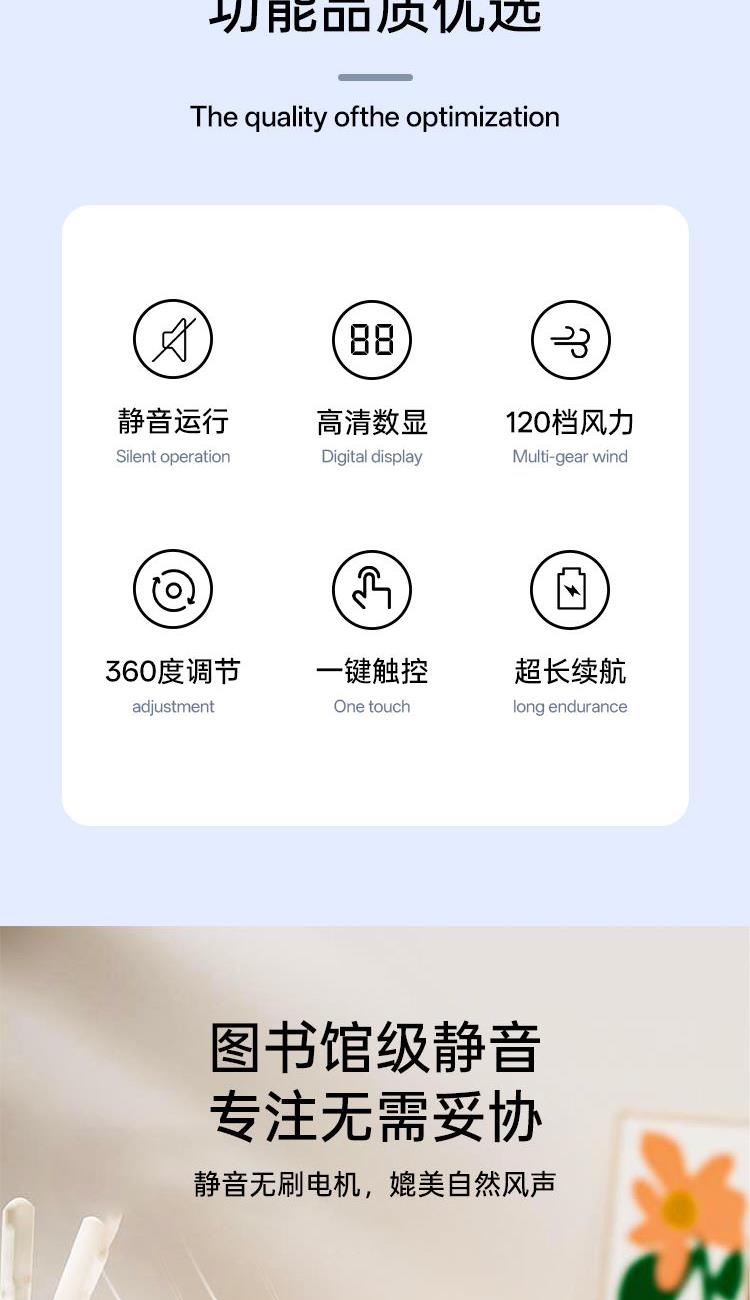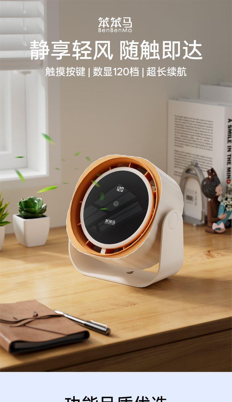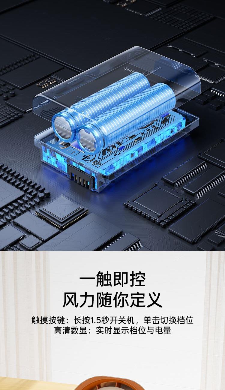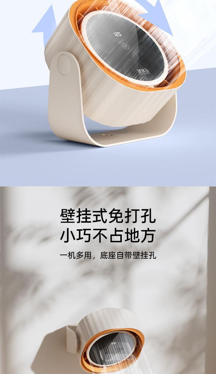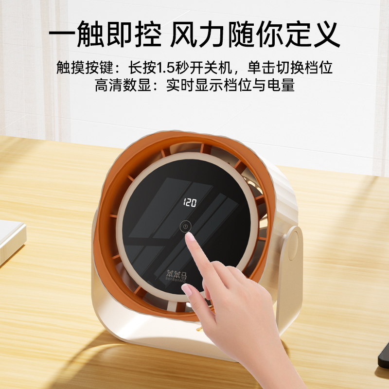 电池容量:3600mAh 产品尺寸:176.8*90*176.8MM 包装尺寸:181*94*182.6mm外箱尺寸:563*393*566mm产品重量: 净重532.5g 电机:无刷电机 功率:4.5W 续航时间:约3-8h充电时间:约5h颜色:米橙 材质:ABS+电子元器件 5寸扇叶,风力强劲,触摸开关 静音无刷电机,搭配3600mAh电池,超长续航,360度可调节,可桌面可壁挂使用 120档可调风力满足不同需求,高清数显档位和电量一目了然,多场景使用