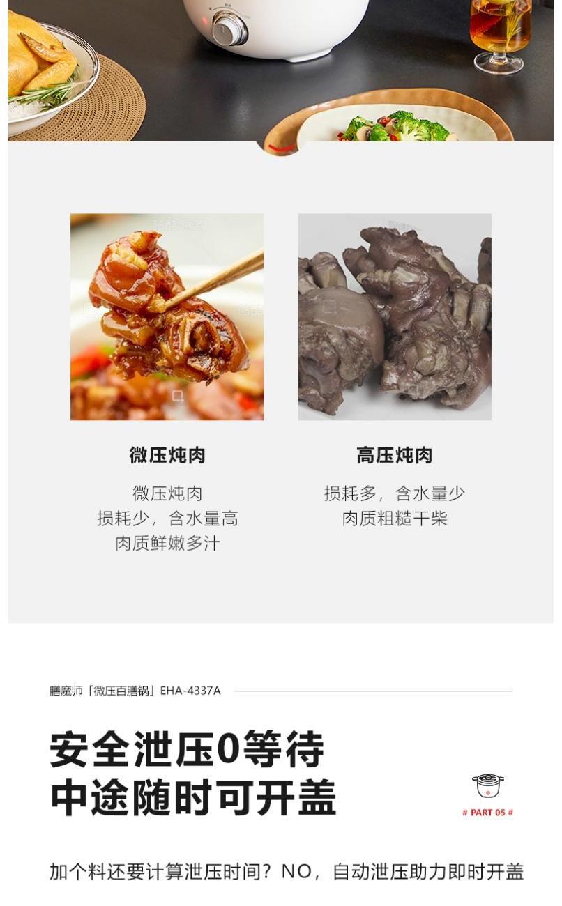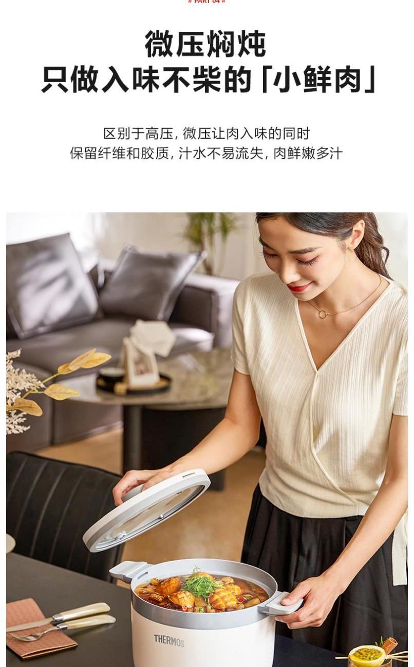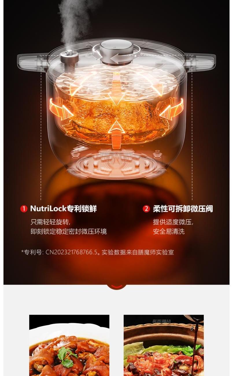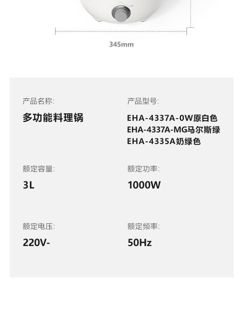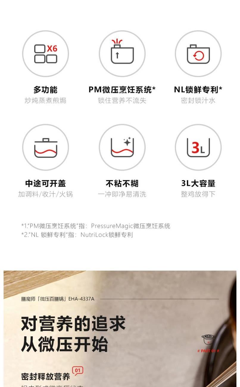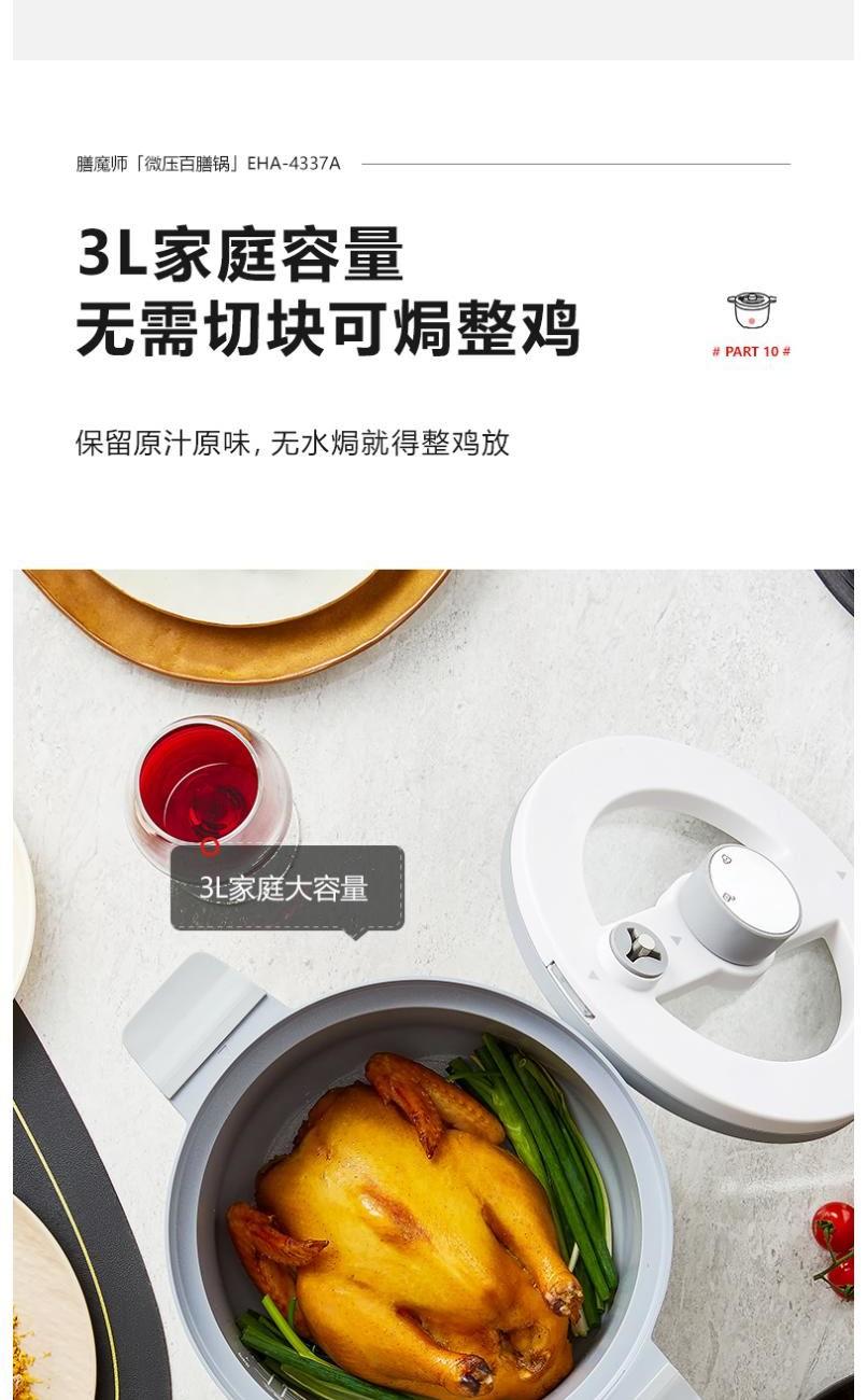 额定电压:220v~ 额定功率: 1000W 额定频率:50HzZ 产品尺寸:338*254*221mm 产品容量:3L 功能档位:关,小火,大火 1、微压更安全,更快 2、可视设计一目了然 3、压铸铝一次成型锅体无死角 4、陶瓷不粘涂层,更健康 5、微压,可无水炖鸡 6、首款带电的微压锅