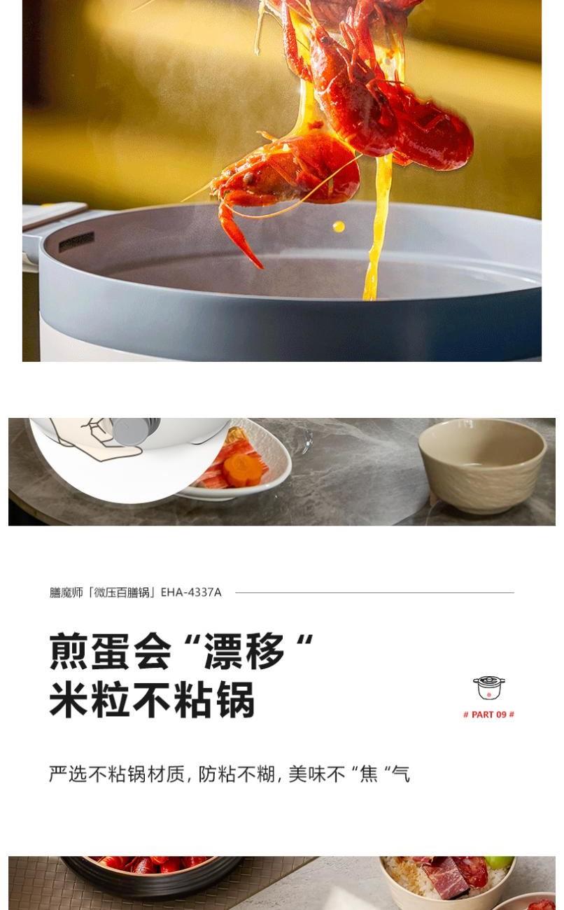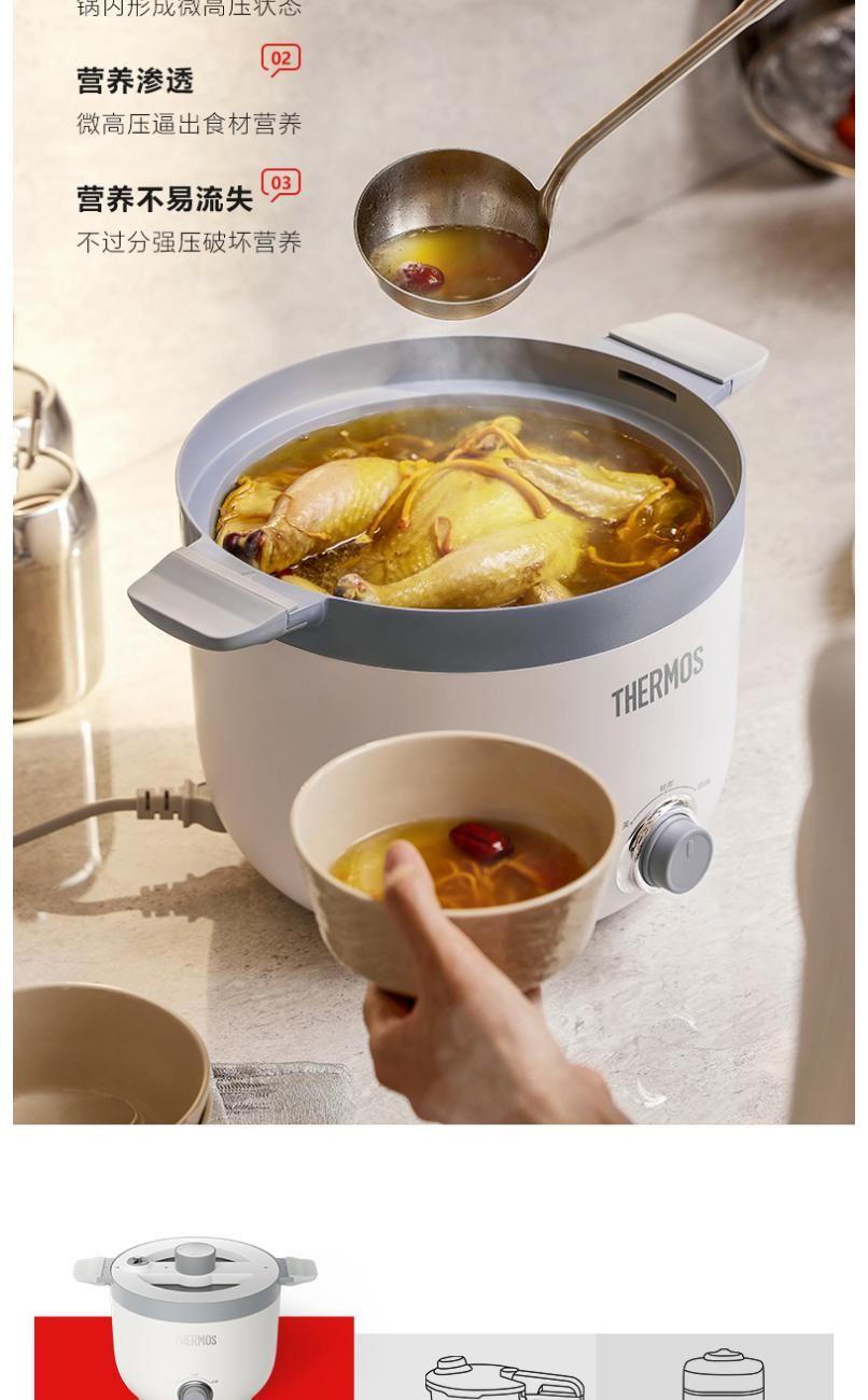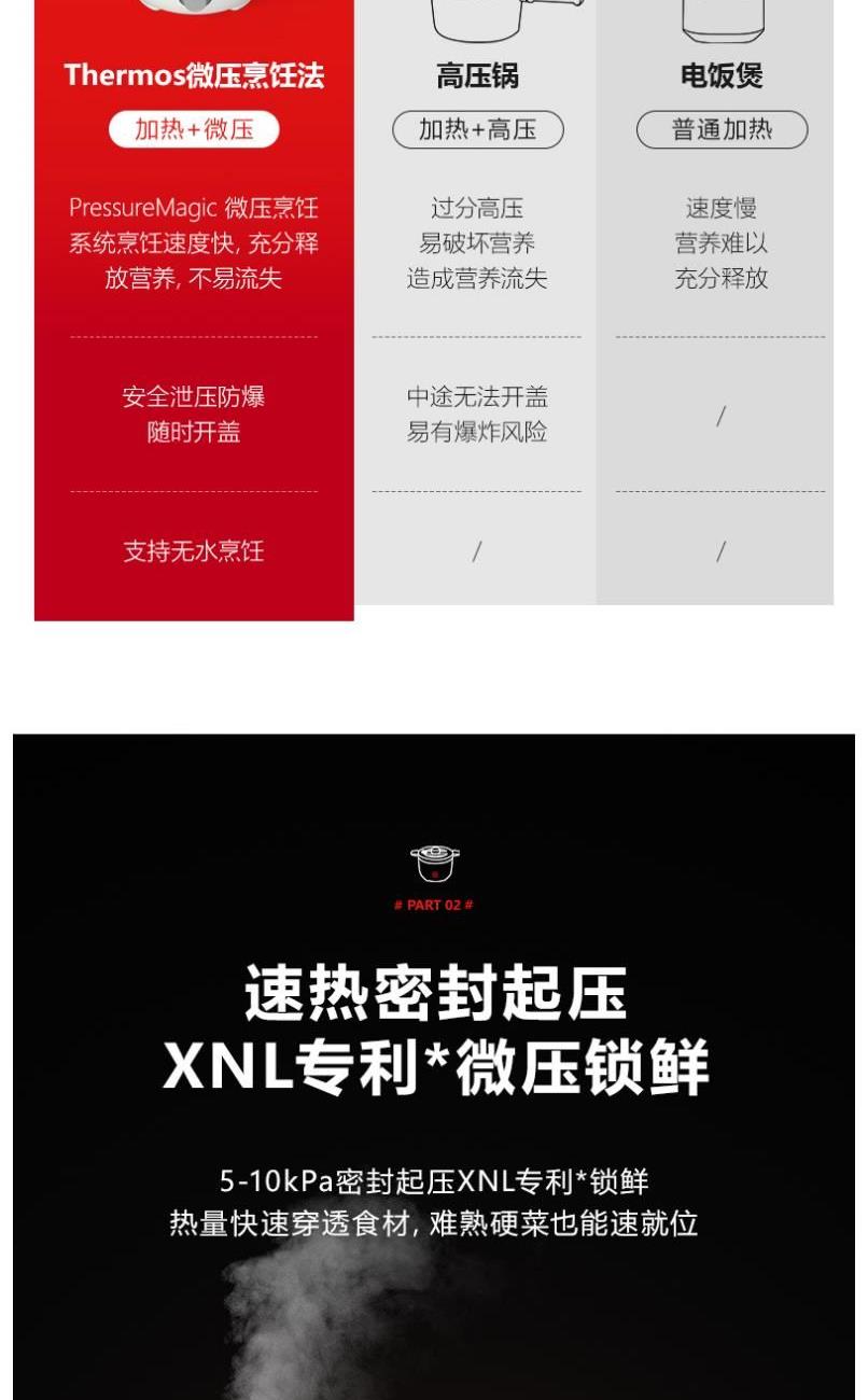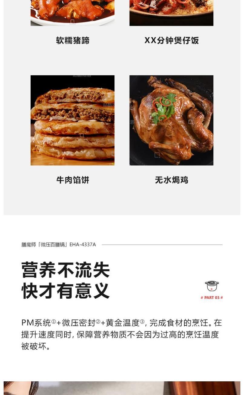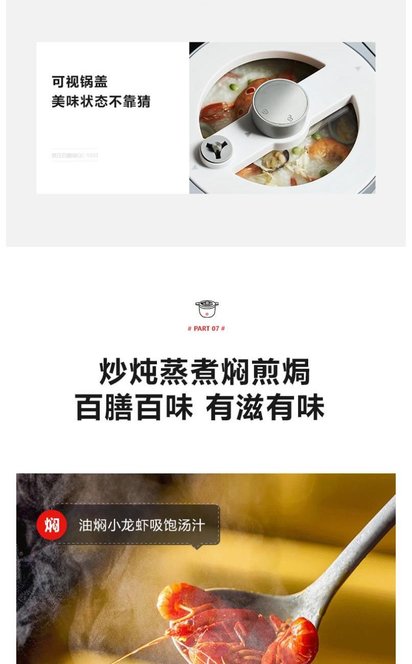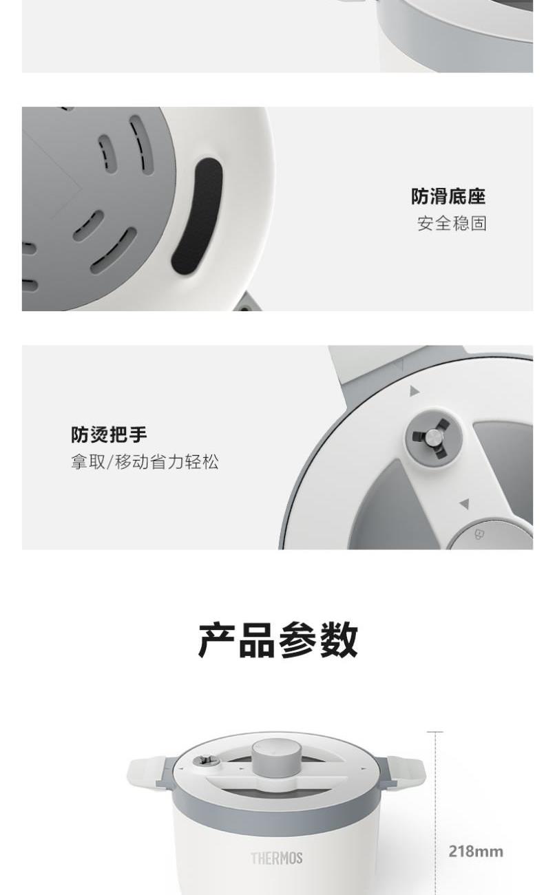 额定电压:220v~ 额定功率: 1000W 额定频率:50HzZ 产品尺寸:338*254*221mm 产品容量:3L 功能档位:关,小火,大火 1、微压更安全,更快 2、可视设计一目了然 3、压铸铝一次成型锅体无死角 4、陶瓷不粘涂层,更健康 5、微压,可无水炖鸡 6、首款带电的微压锅
