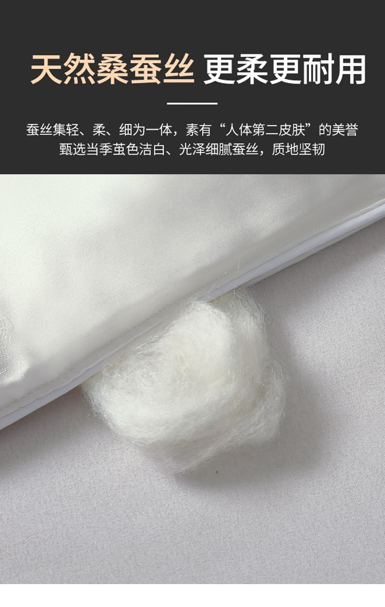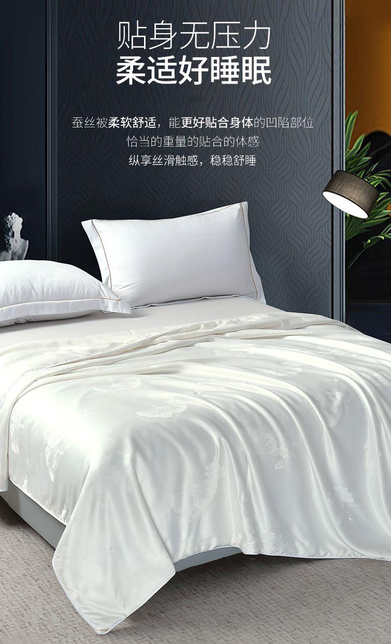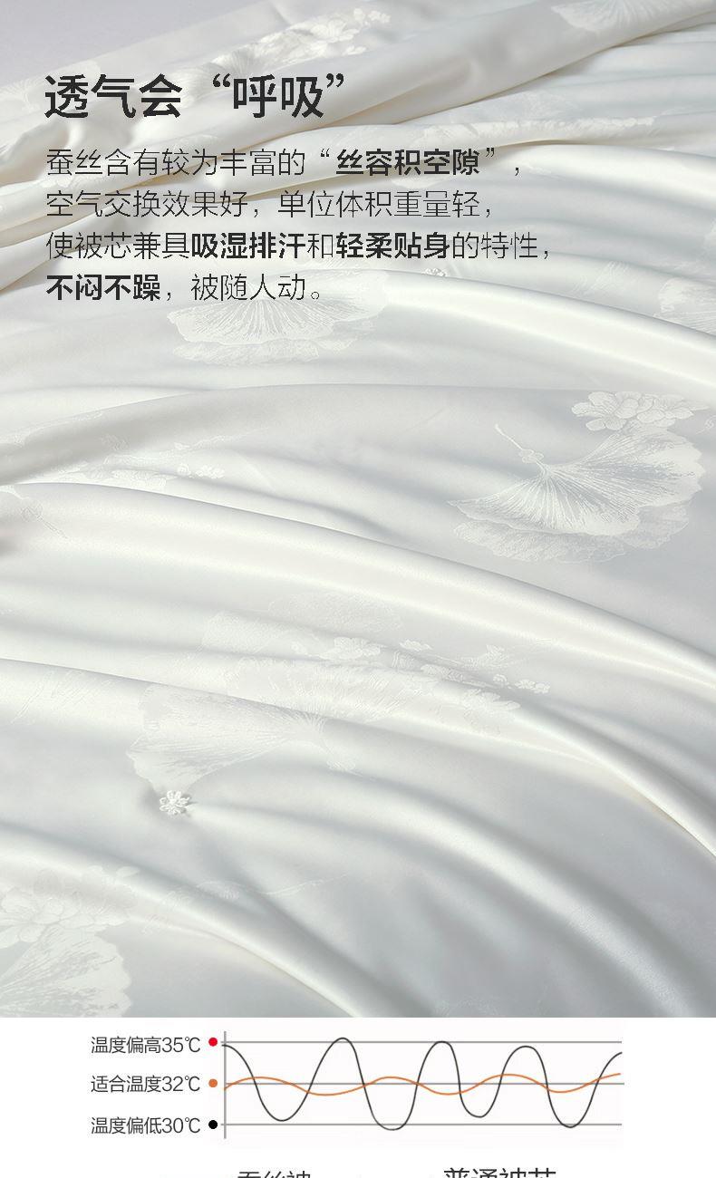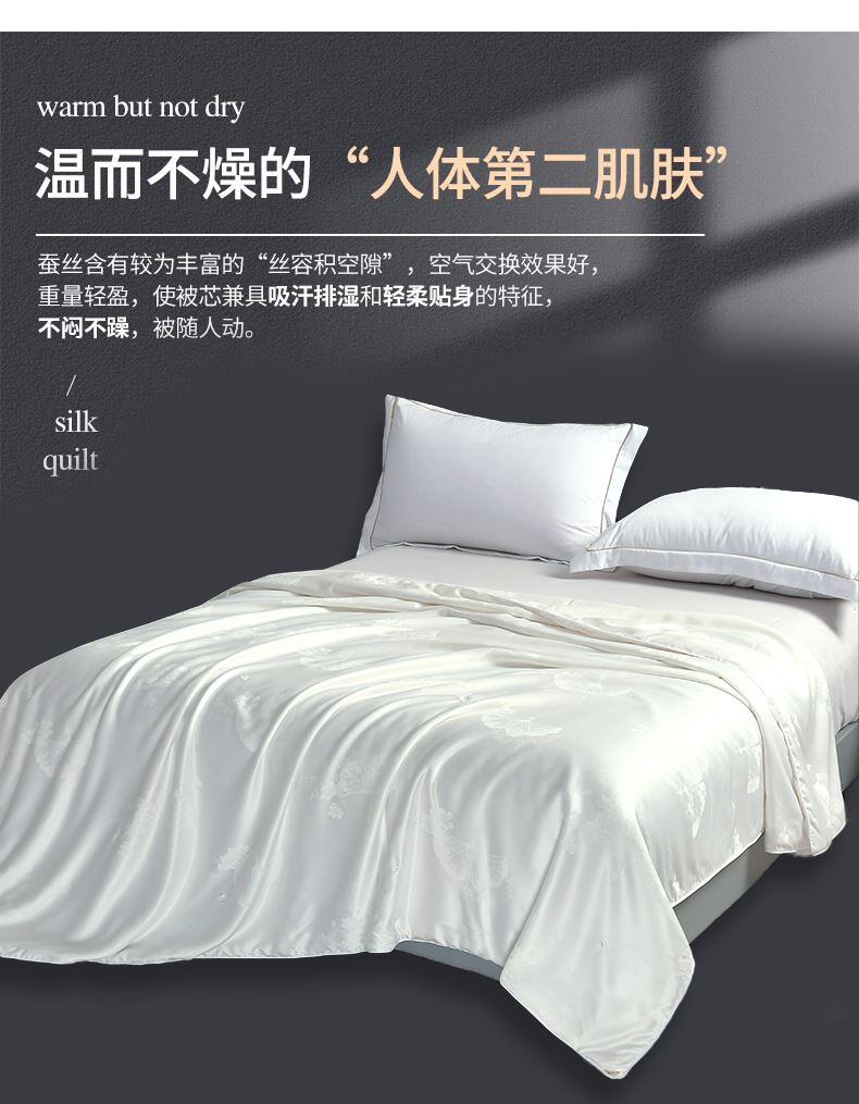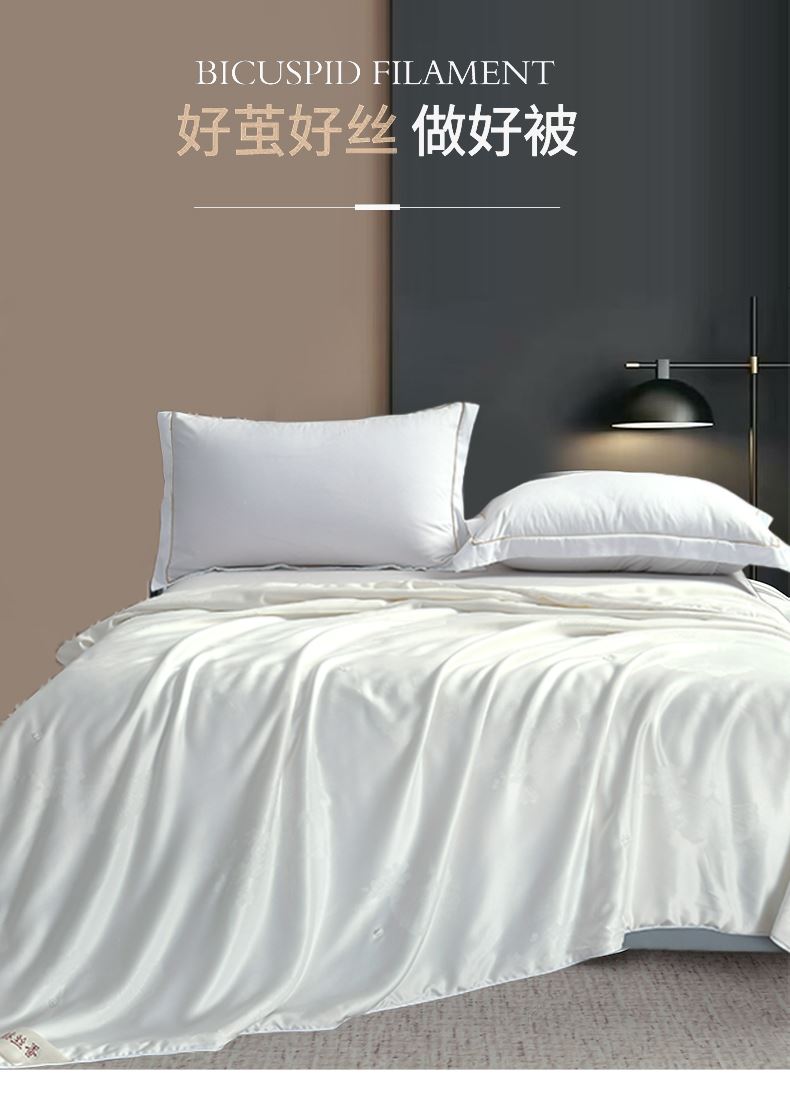 规格:200*230cm 面料:贡缎提花 填充:蚕丝(中长丝) 克重:1500g 执行标准:GB/T22796-2021 安全类别:GB18401-2010 B类 1.贡缎提花面料具有出色的透气吸湿性,轻薄会呼吸,助你安然入睡 2.从树中提取的木浆原液,采用溶剂纺丝技术,成品于天丝面料,柔滑、垂感好、轻薄、飘逸、柔滑凉爽、垂感好,夏季使用更清凉。