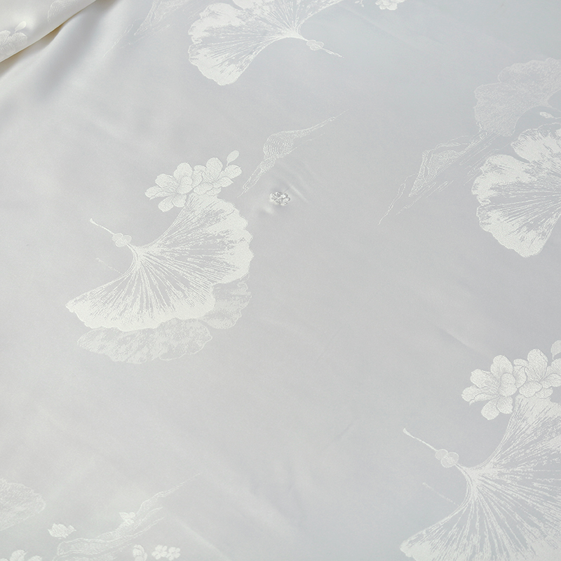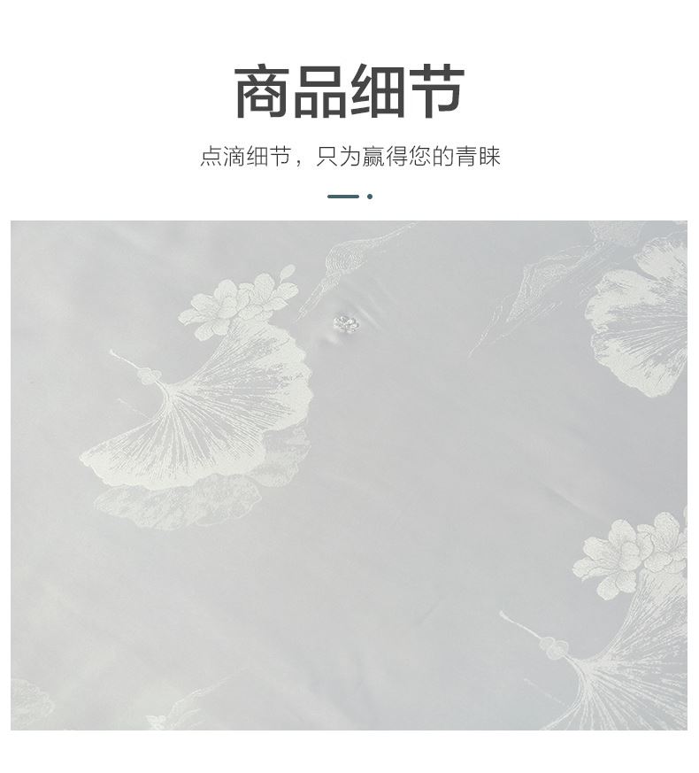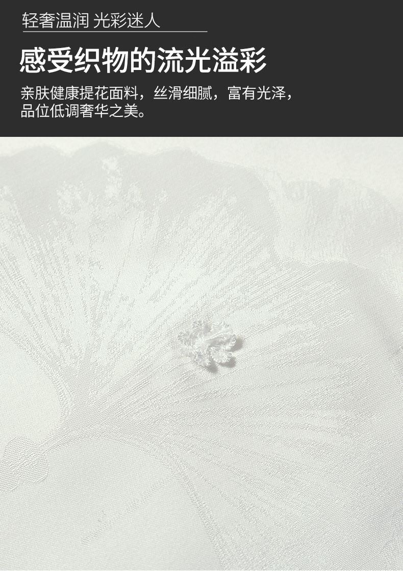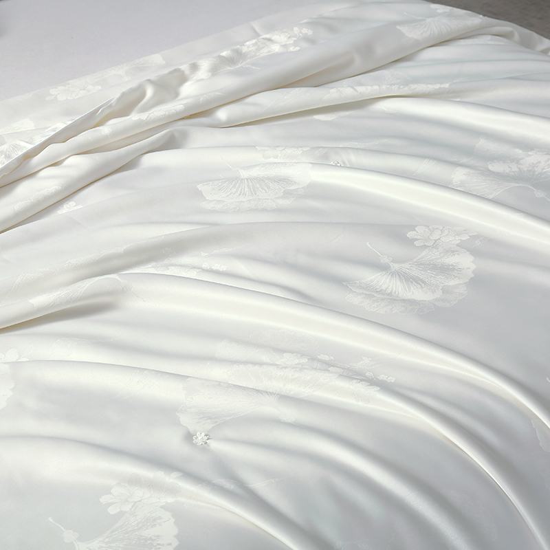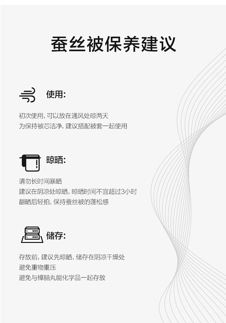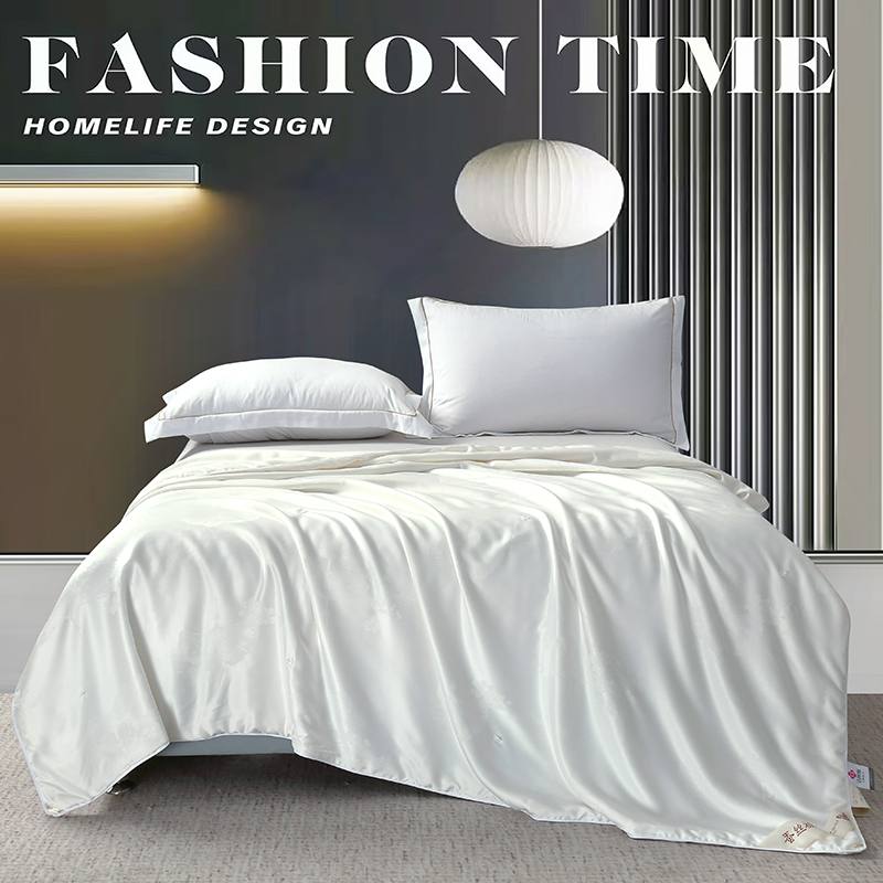 规格:200*230cm 面料:贡缎提花 填充:蚕丝(中长丝) 克重:1500g 执行标准:GB/T22796-2021 安全类别:GB18401-2010 B类 1.贡缎提花面料具有出色的透气吸湿性,轻薄会呼吸,助你安然入睡 2.从树中提取的木浆原液,采用溶剂纺丝技术,成品于天丝面料,柔滑、垂感好、轻薄、飘逸、柔滑凉爽、垂感好,夏季使用更清凉。