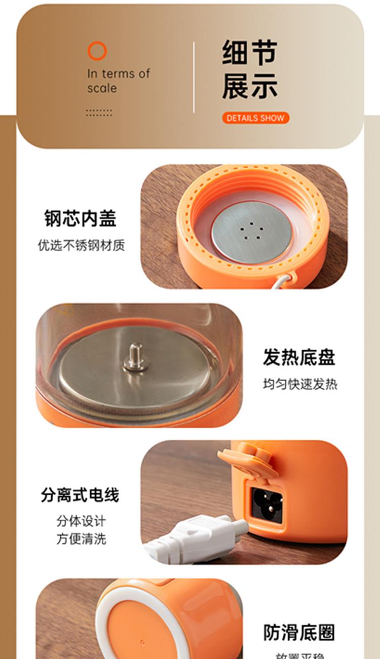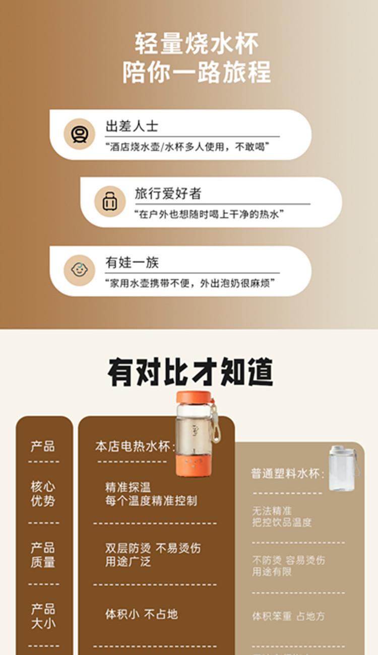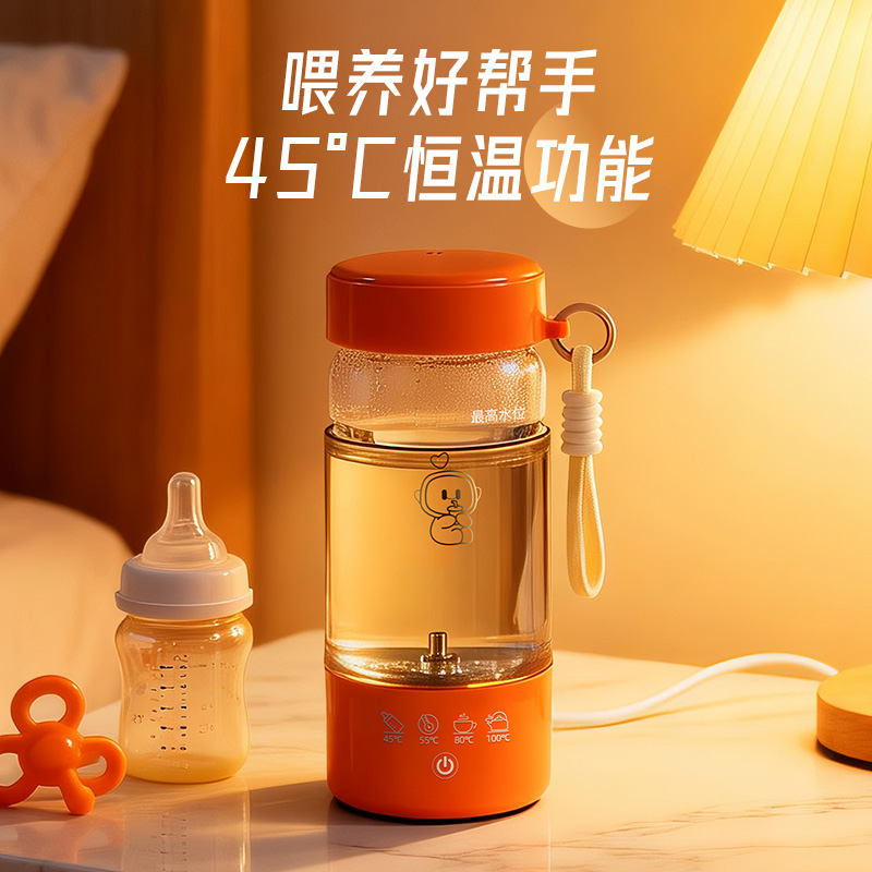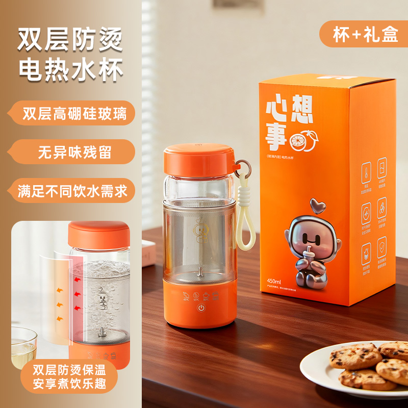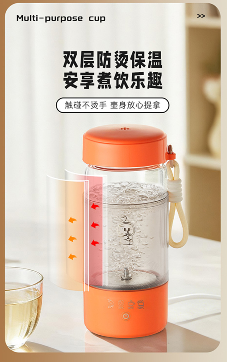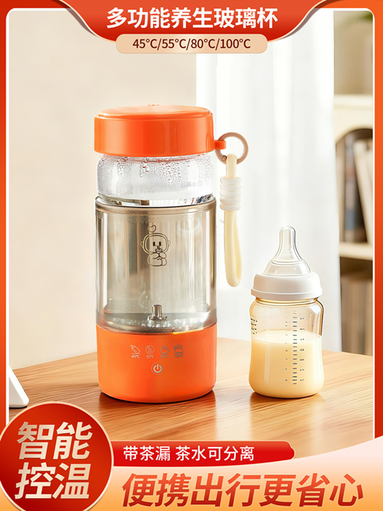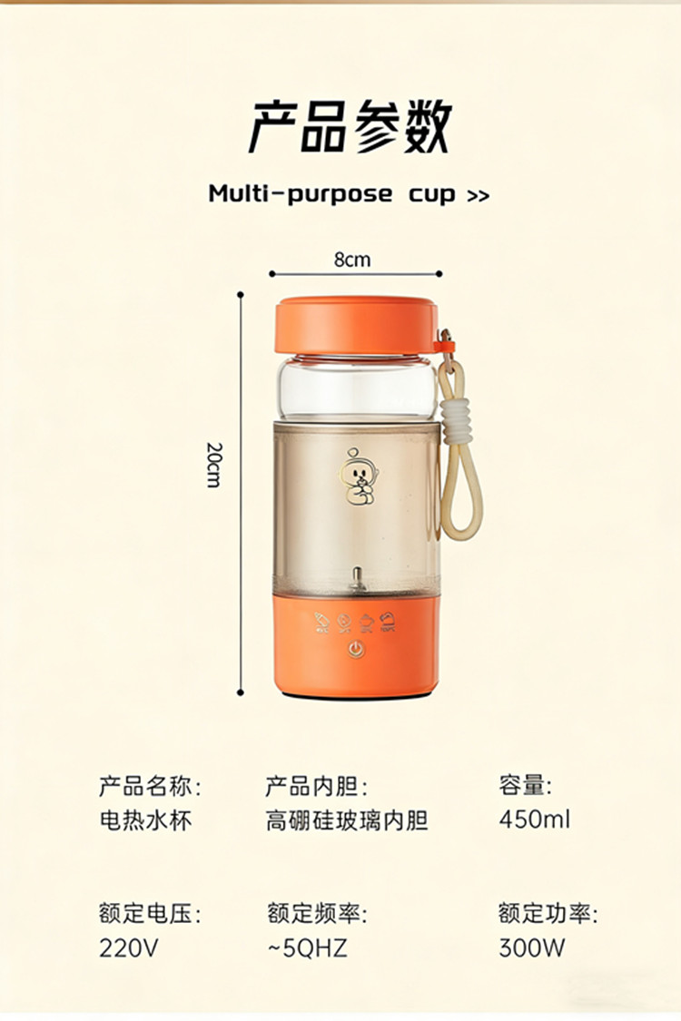 额定功率:300W 颜色:白色、橙色 主机容量:450ML 规格:电热水杯 产品款式:标配水杯单杯 包装清单:彩盒包装+水杯+电线 特色功能 1、450ML大容量,食品级304不锈钢发热盘,整杯0涂层。硅胶防水槽,安全水位标识。 2、双层中空高硼硅玻璃设计,抗酸耐碱,保温/防烫/降噪。 3、300W快速烧水,8分钟热水即享100℃,自动保温8小时。 4、复合型透气膜防爆盖,防漏安全保护关盖烧水,泄压透气,便携烧水更安全。 5、触摸控制4档温度数控调节,一键切换(热水壶/恒温杯/水杯)45/55/80/100℃ 6、IP专属定制,便携式随身装包,密封不漏,轻松携带。
