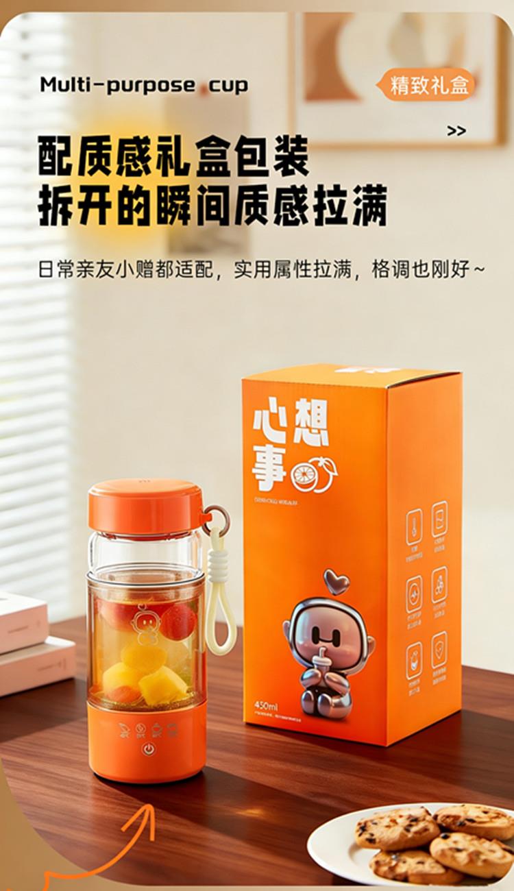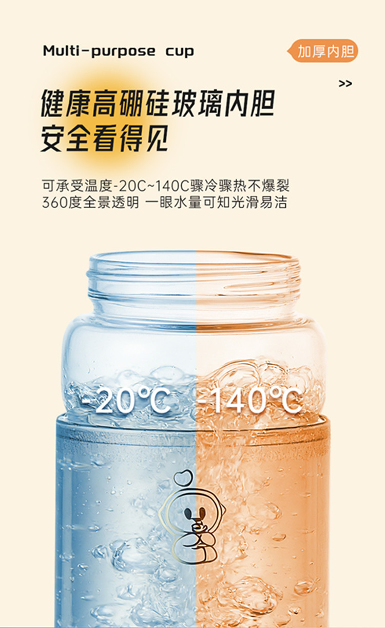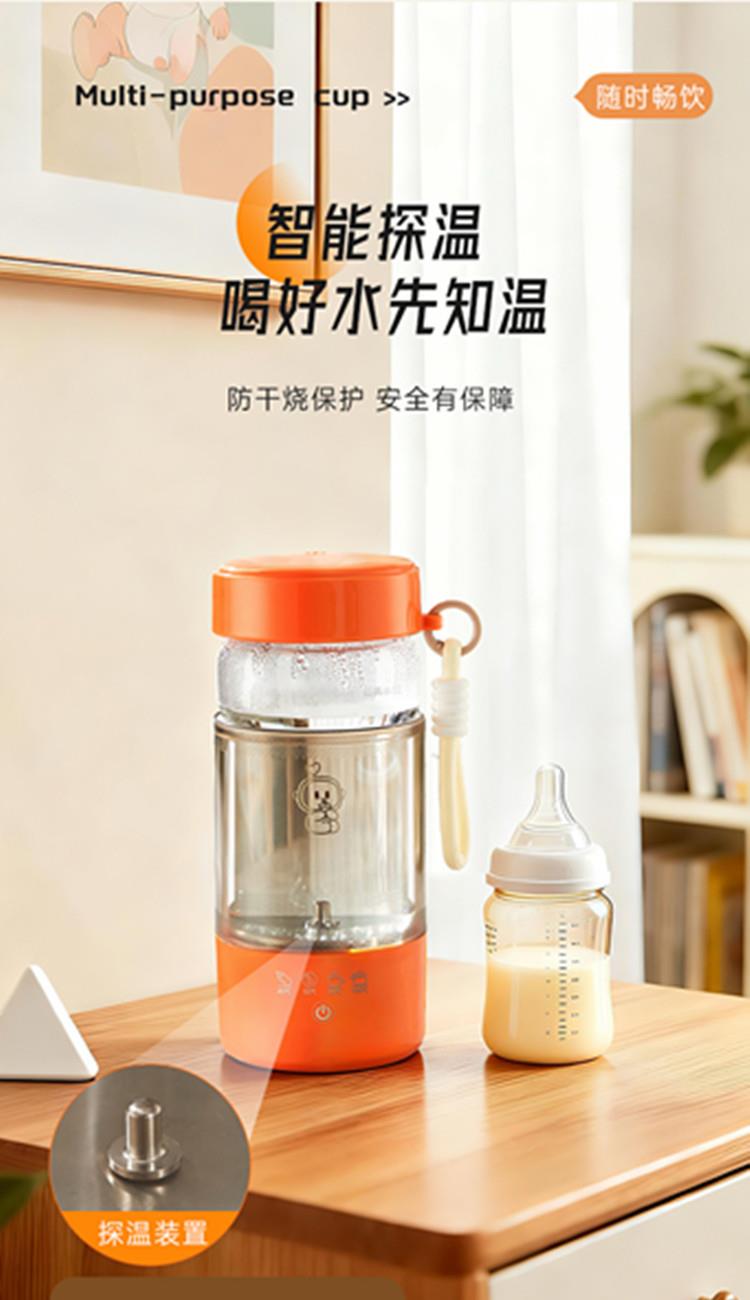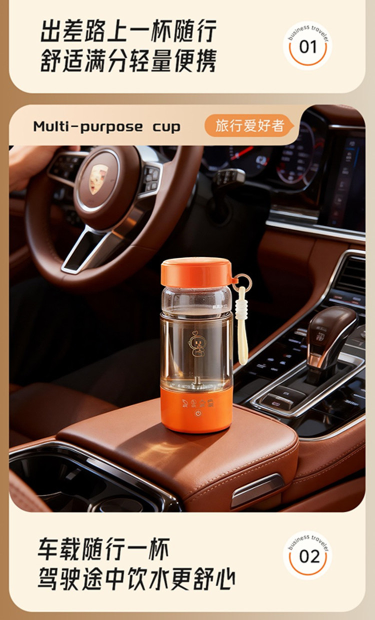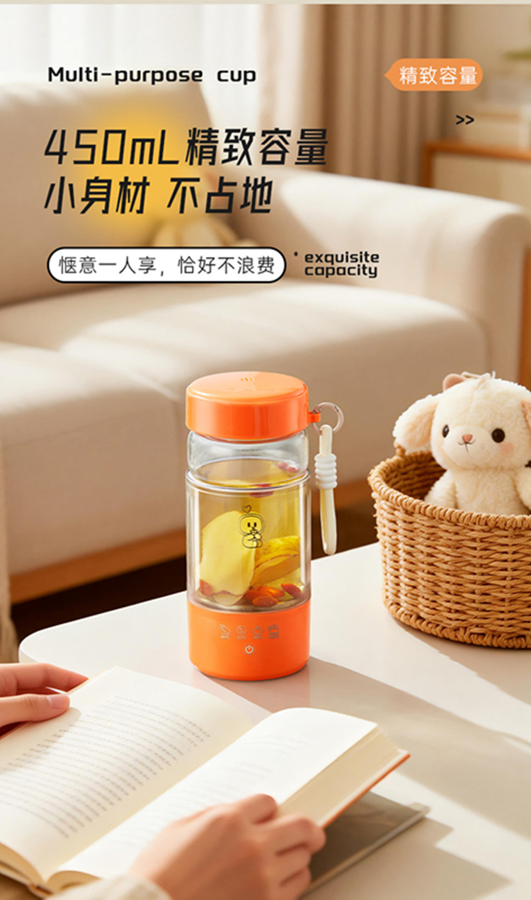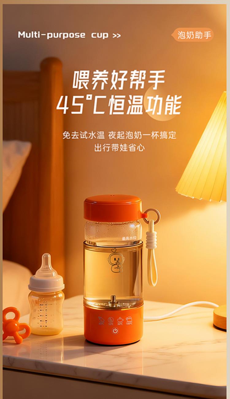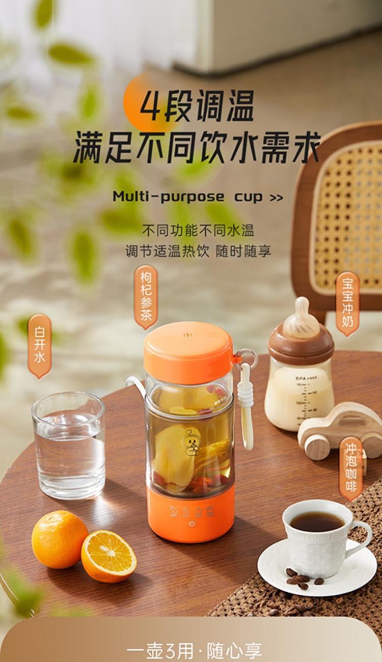 额定功率:300W 颜色:白色、橙色 主机容量:450ML 规格:电热水杯 产品款式:标配水杯单杯 包装清单:彩盒包装+水杯+电线 特色功能 1、450ML大容量,食品级304不锈钢发热盘,整杯0涂层。硅胶防水槽,安全水位标识。 2、双层中空高硼硅玻璃设计,抗酸耐碱,保温/防烫/降噪。 3、300W快速烧水,8分钟热水即享100℃,自动保温8小时。 4、复合型透气膜防爆盖,防漏安全保护关盖烧水,泄压透气,便携烧水更安全。 5、触摸控制4档温度数控调节,一键切换(热水壶/恒温杯/水杯)45/55/80/100℃ 6、IP专属定制,便携式随身装包,密封不漏,轻松携带。