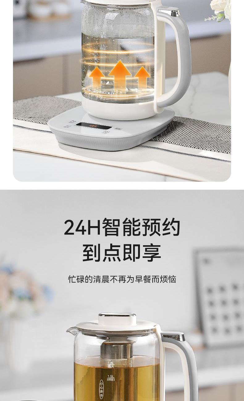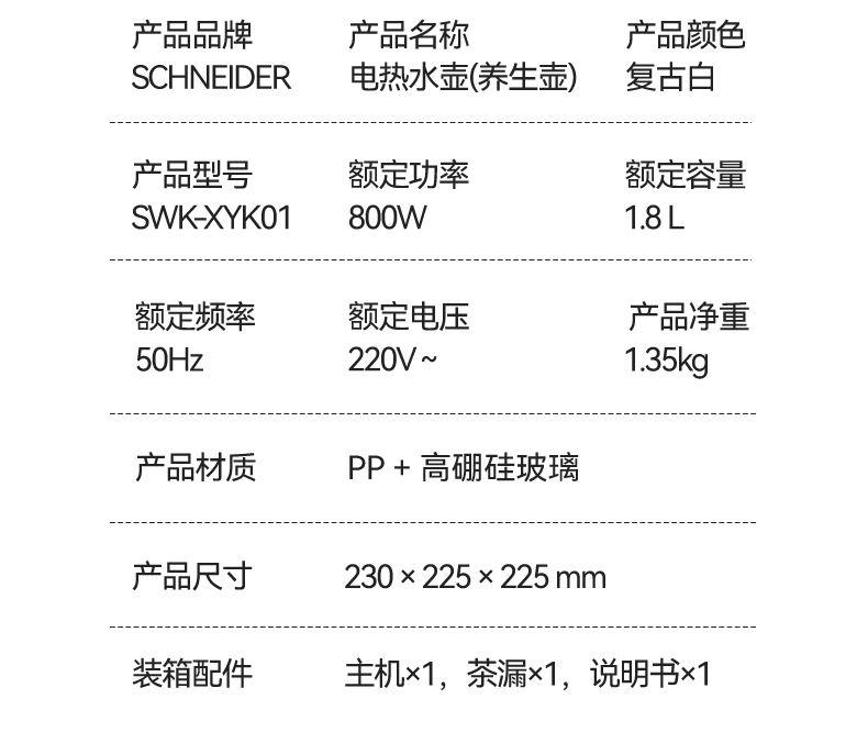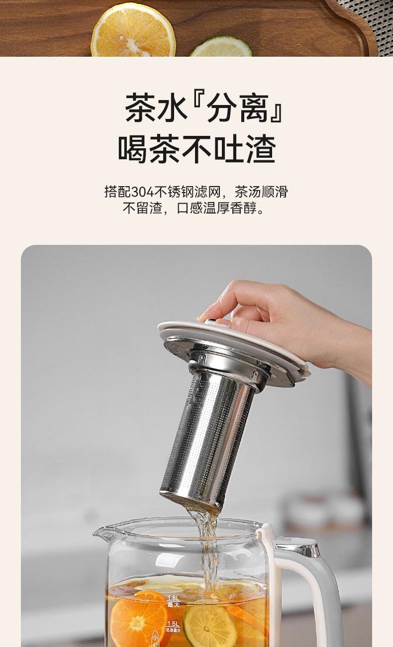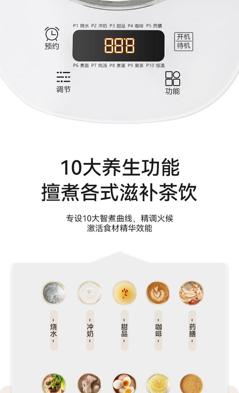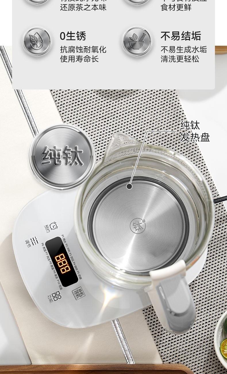 产品颜色:米白 产品材质:PP+纯钛底盘+高硼硅玻璃 额定电压:220V 额定频率:50Hz 额定功率:800w 额定容量:1.8L 单台净重:1.35kg 单台毛重:1.60kg 产品尺寸:230*225*255mm 彩盒尺寸:250x205x280mm 外箱尺寸:520*430*585mm 产品清单: 主机*1/电源线*1/说明书*1 十大养生程序,一键直达,轻松涵盖日常滋补 纯钛金属发热盘,0重金属0涂层,健康炖煮更养生 1.8L大容量,满足全家煮茶需求,朋友聚会也能从容应对 800W强劲功率,快速沸腾,节省时间,无需长久等待 食品级健康材质,壶体高硼硅玻璃,无惧高温,安心享用每一餐 贴心实用设计,高精度滤网,轻松实现茶水分离 功能面板清晰明了,操作简单