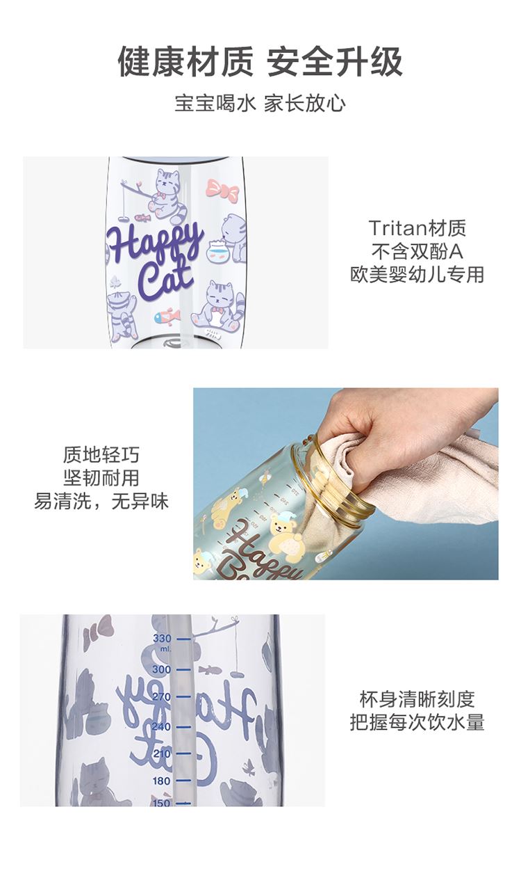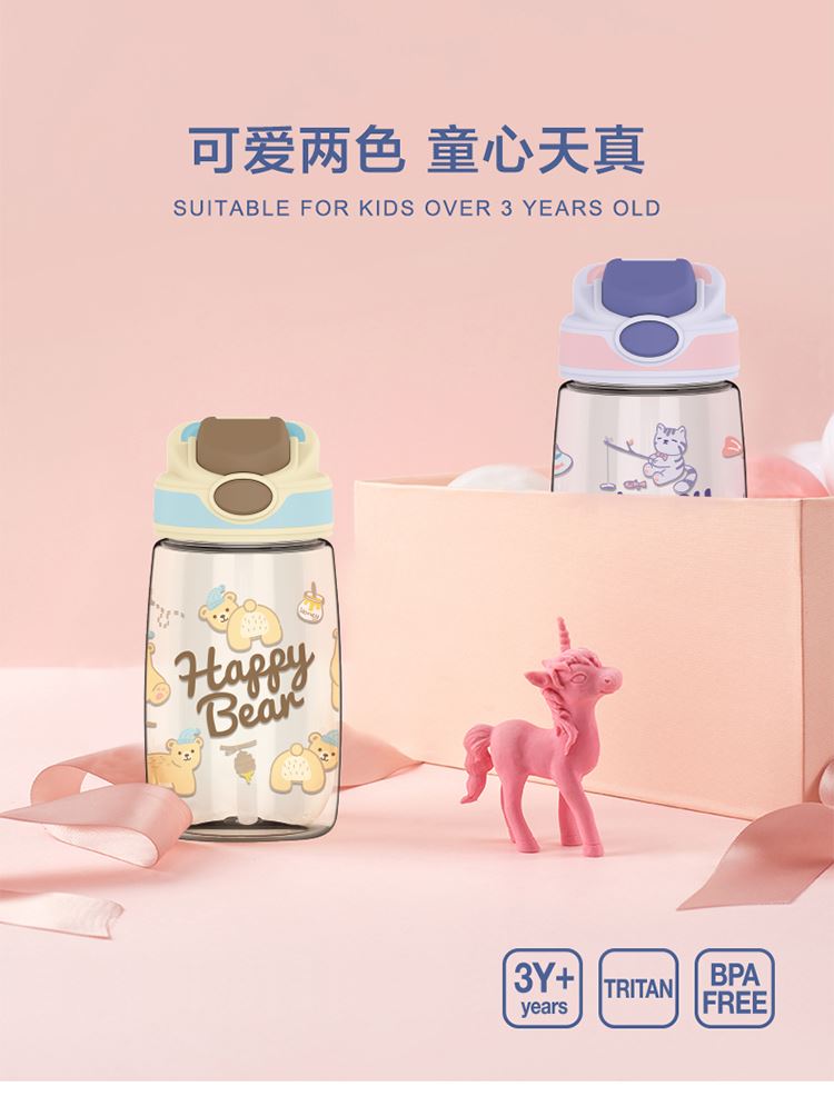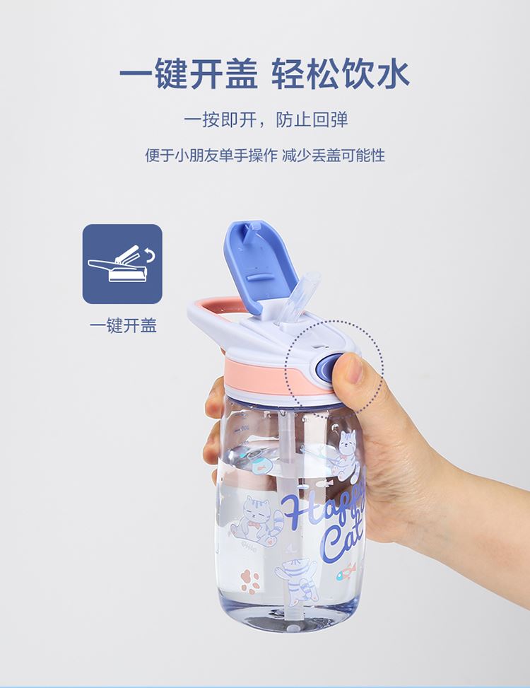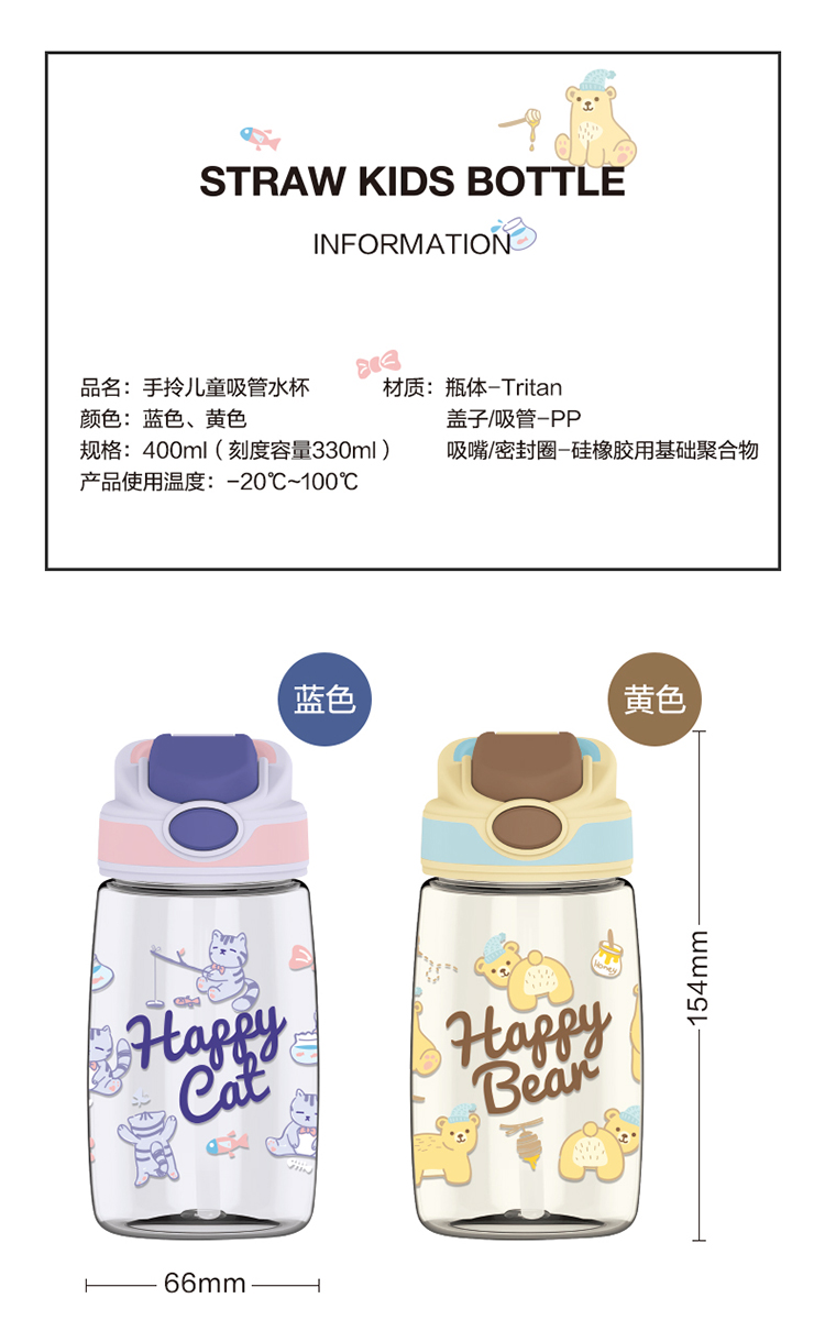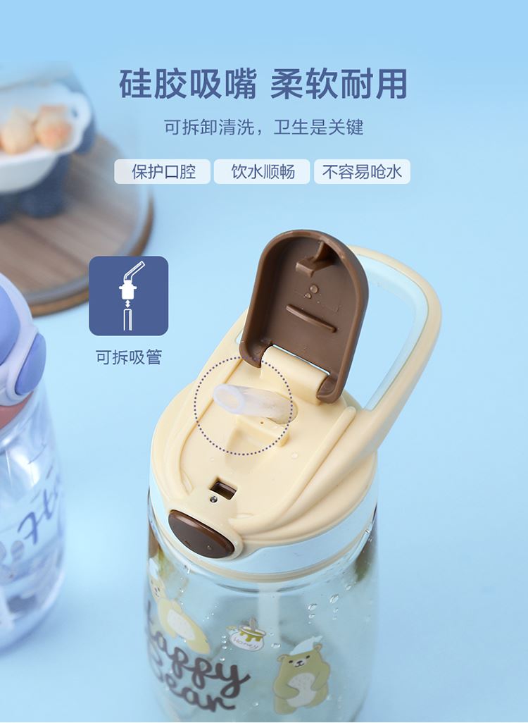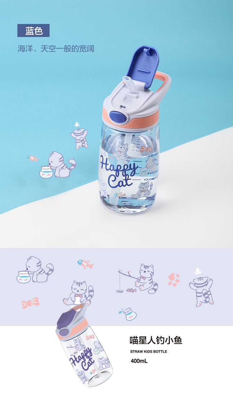 材质:瓶体-Tritan 盖子/吸管-PP 吸嘴-硅胶 毫升:400ml 产品颜色:蓝 一键式开盖设计,便于小朋友操作 吸管杯,方便喝水 可拆卸吸管,便于清洗组装 便携式提手,方便户外携带 可爱的卡通设计迎合小朋友的喜好