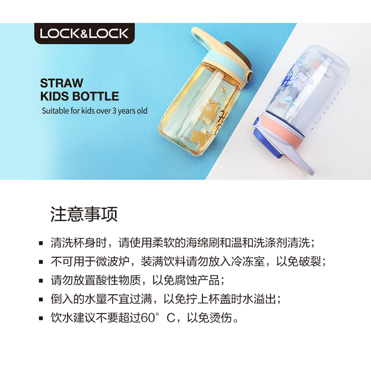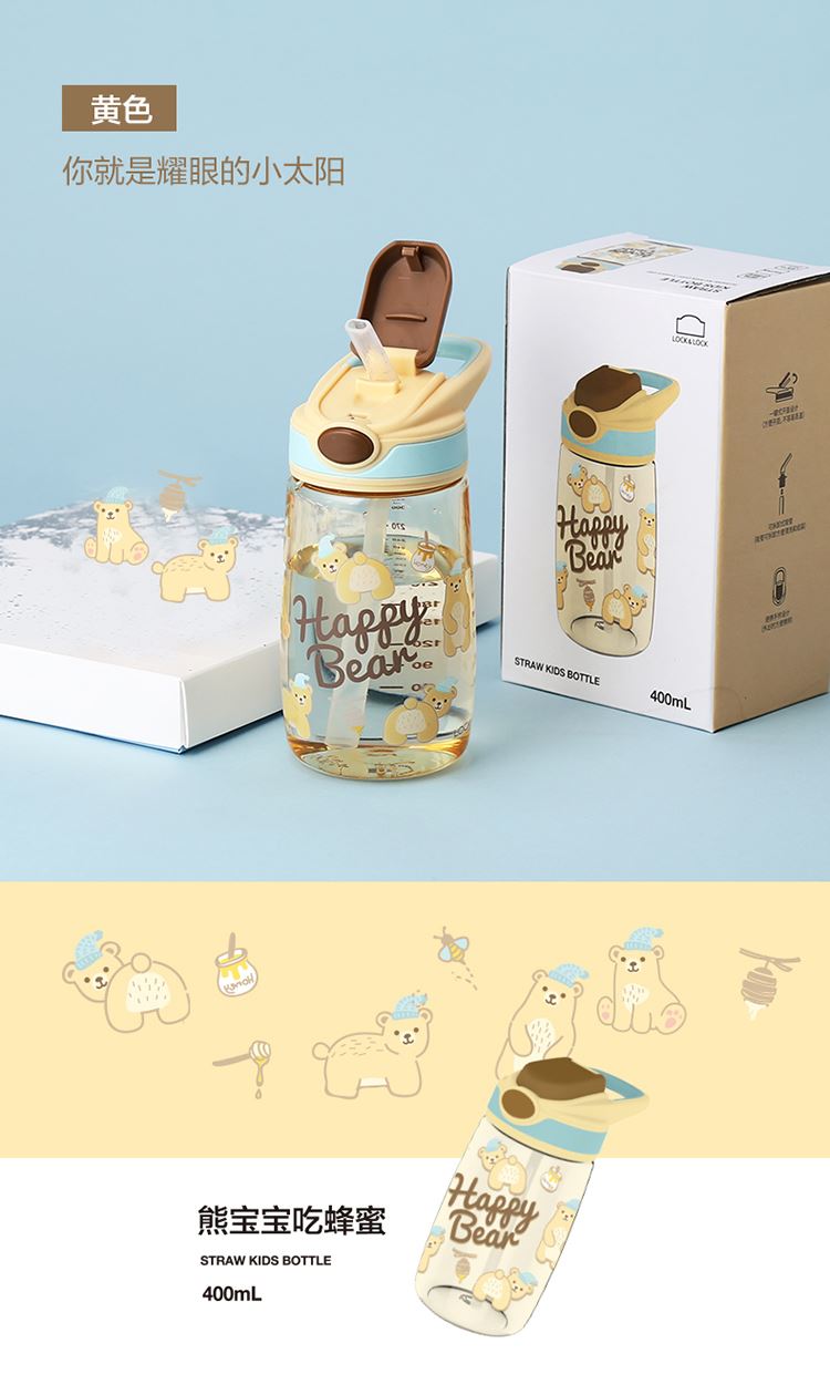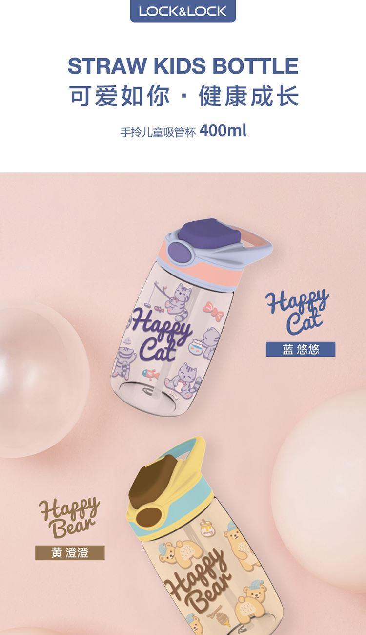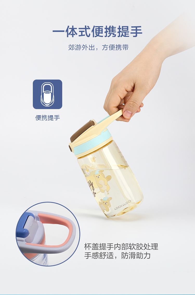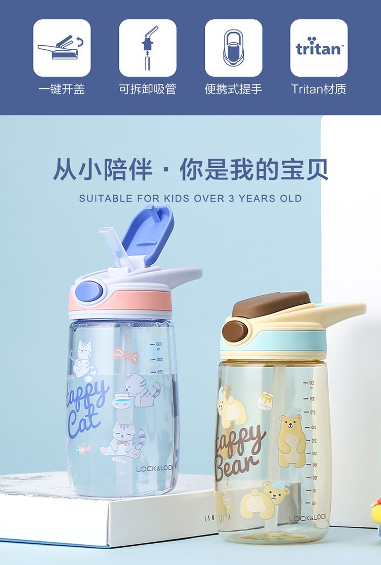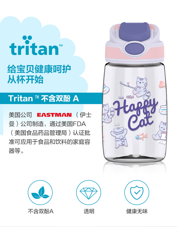 材质:瓶体-Tritan 盖子/吸管-PP 吸嘴-硅胶 毫升:400ml 产品颜色:蓝 一键式开盖设计,便于小朋友操作 吸管杯,方便喝水 可拆卸吸管,便于清洗组装 便携式提手,方便户外携带 可爱的卡通设计迎合小朋友的喜好