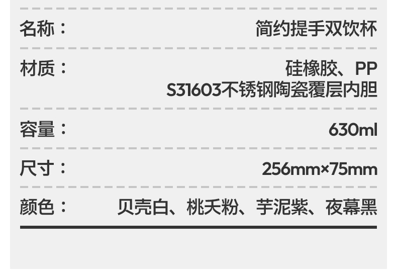 型号:VO-JY63SY 颜色:石墨黑,柔光白,深空灰 容量:600ml 尺寸:230*85mm 材质:316L不锈钢/pp材质/硅橡胶