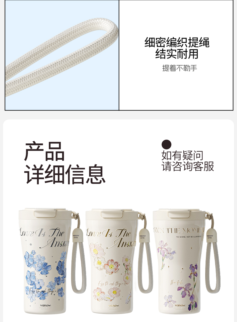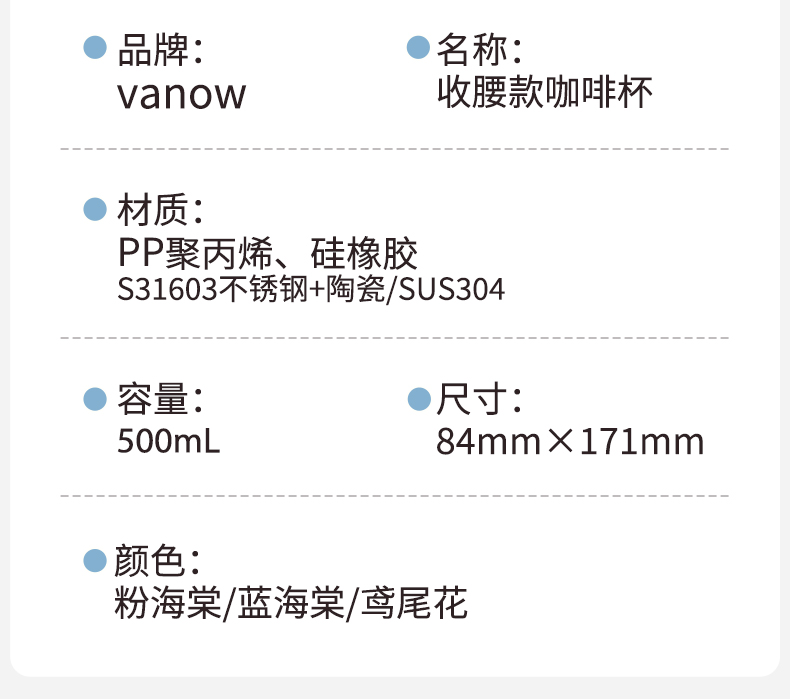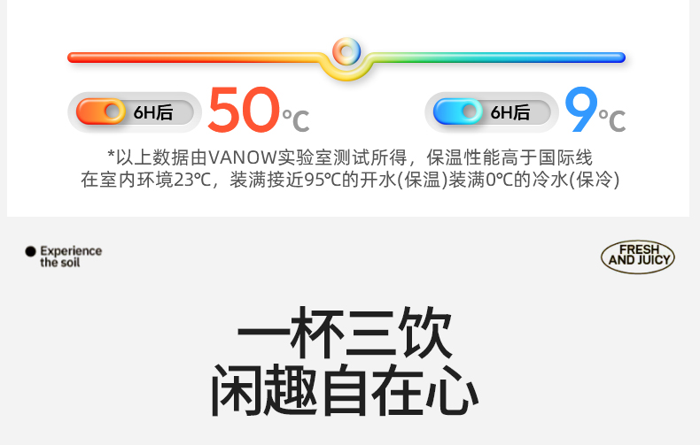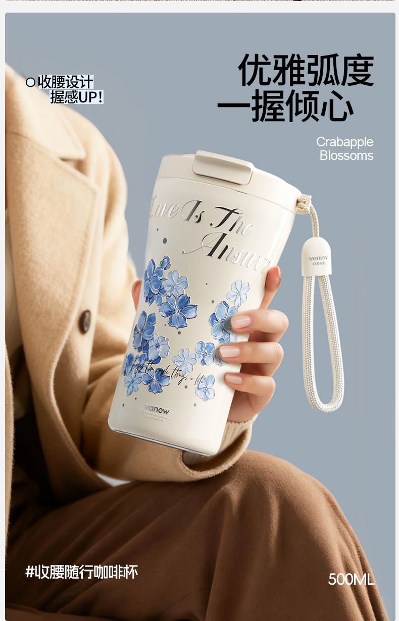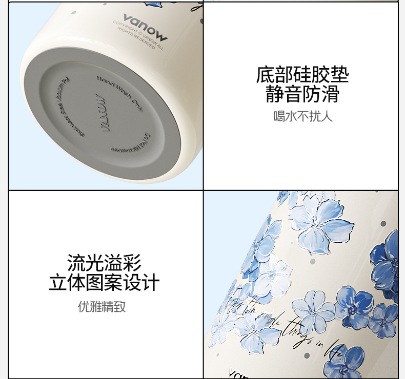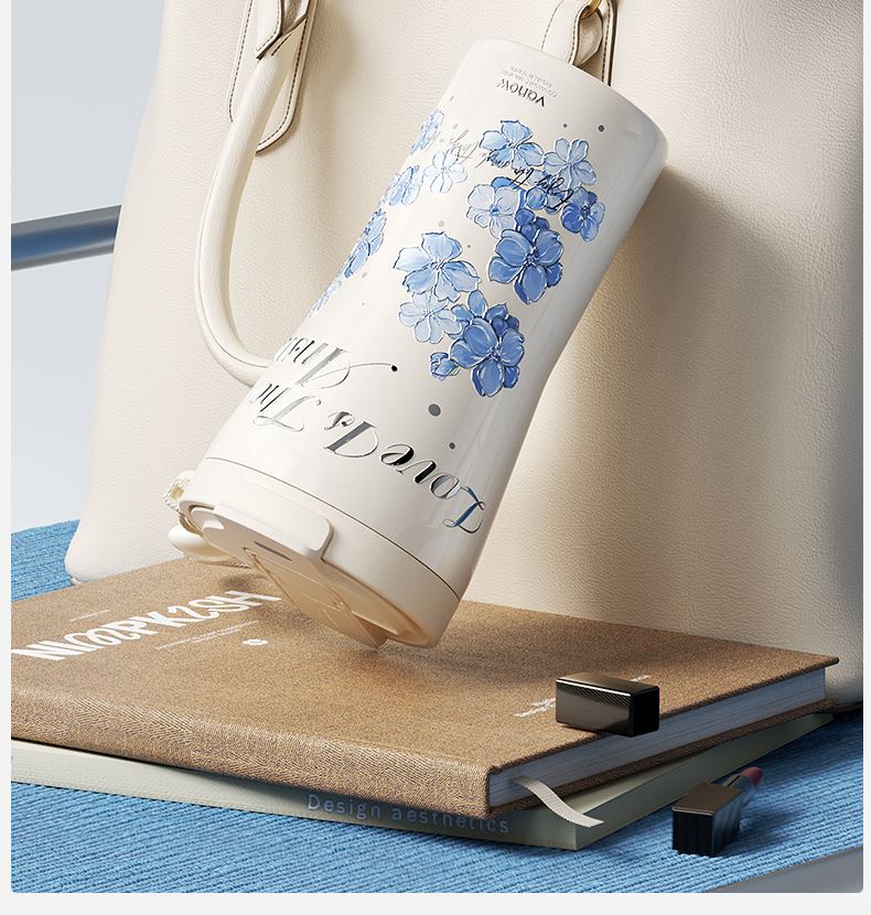 型号:VO-FHT50KF、VO-HT50KF、VO-YW50KF VO-FHT50KF-C、VO-HT50KF-C、VO-YW50KF-C 颜色:粉海棠、海棠花、鸢尾 容量:500ml 材质:326不锈钢/陶瓷、pp聚丙烯、硅橡胶 尺寸:95mm*155mm 1.多层保温守护,锁住四季温度 2.一杯三饮,闲趣自在心 3.优雅弧度,一握倾心 4.一提即走,便携新定义 5.倒置也安心,摆脱湿包烦恼