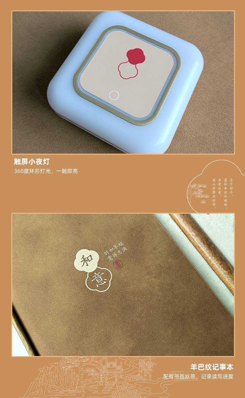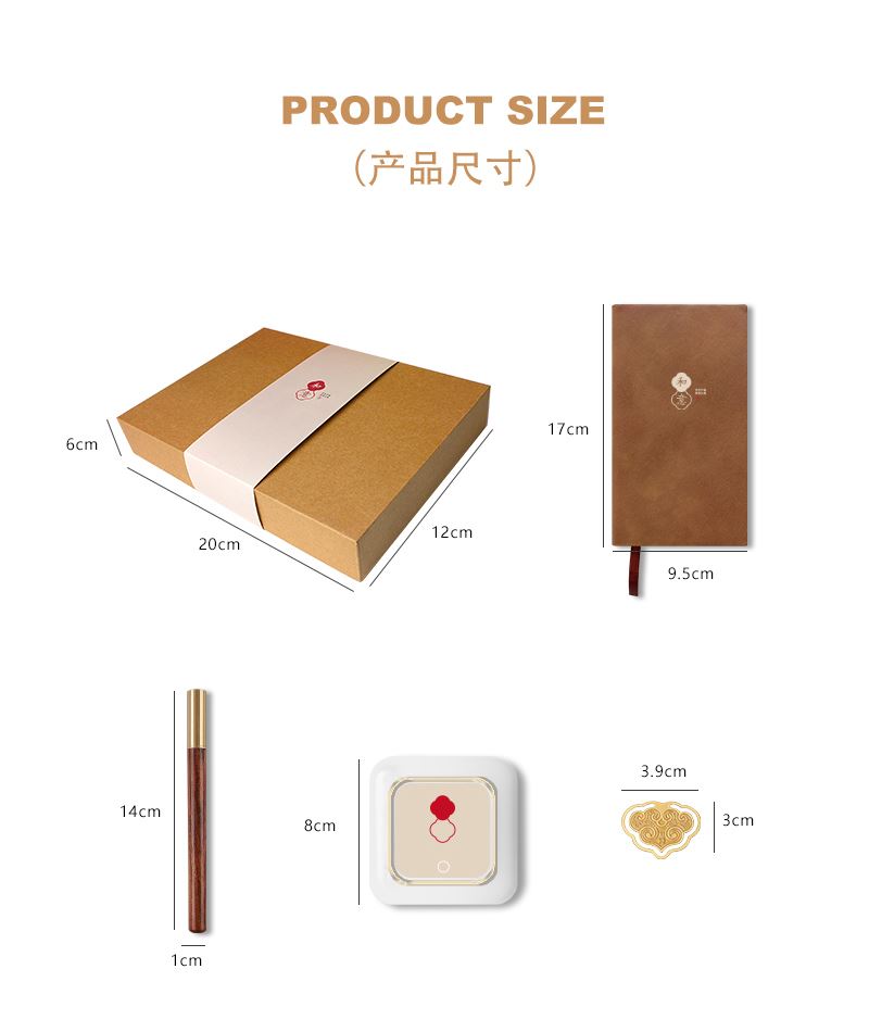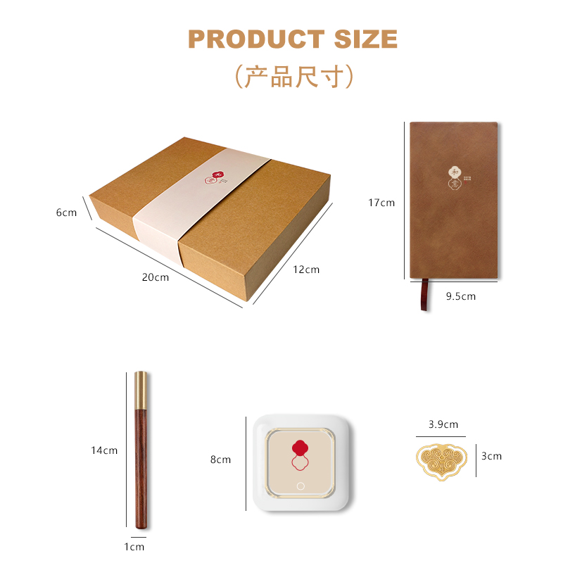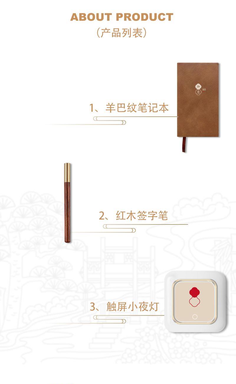 ❶ 触屏夜灯 材质:优质ABS 功能:触屏开关 光源:暖黄光 规格:8*8*3cm ❷ 磨砂羊巴软裱笔记本 A6: 9.5*17.3 cm 封面:羊巴纹 内芯:80克米黄纸100张 ❸ 红木签字笔 0.05cm笔芯 材质:黄铜、红木 ❹ 黄铜书签 纯正黄铜结合微雕工艺 ❺ 手提袋 尺寸: 25.5*22*4.8cm