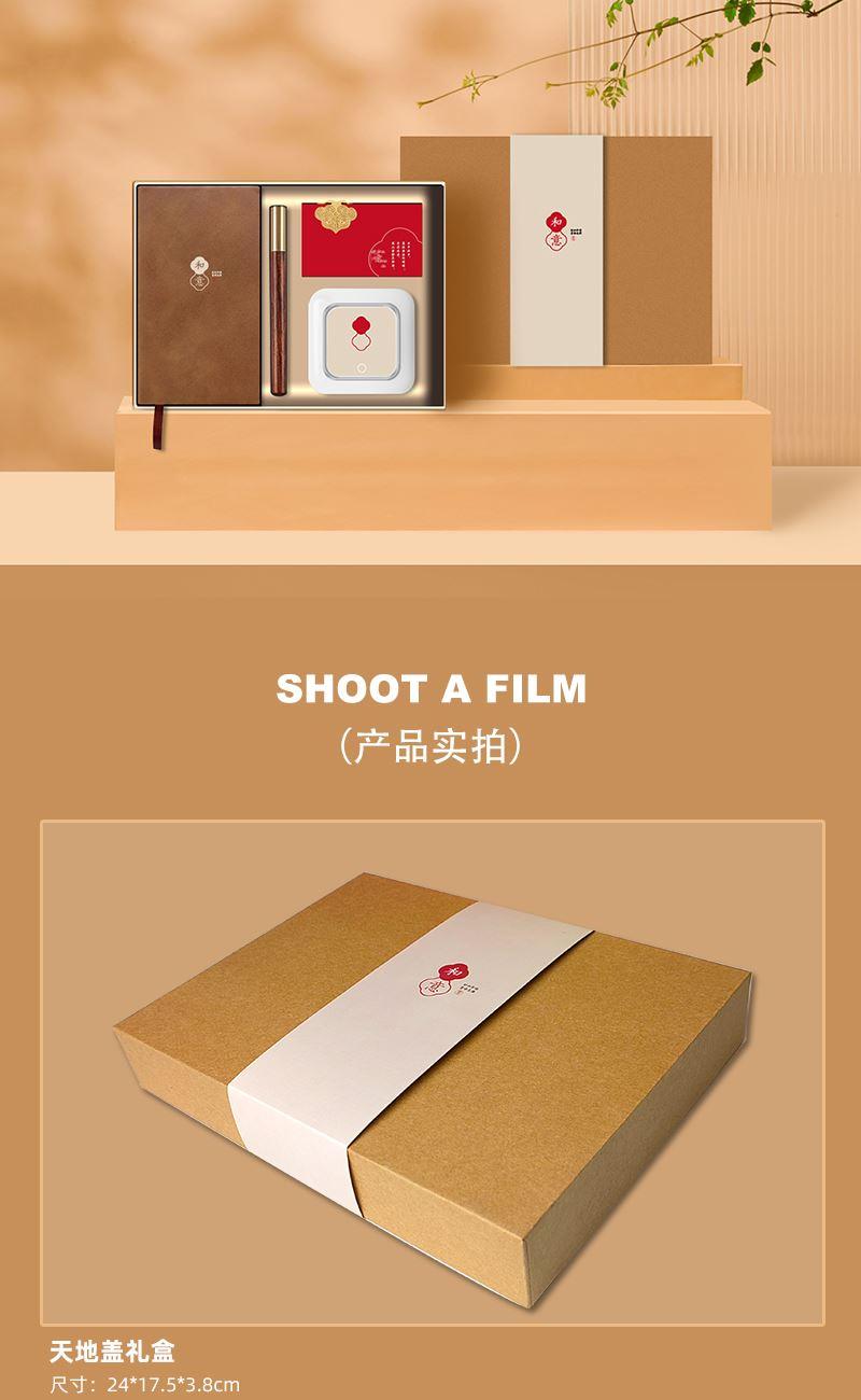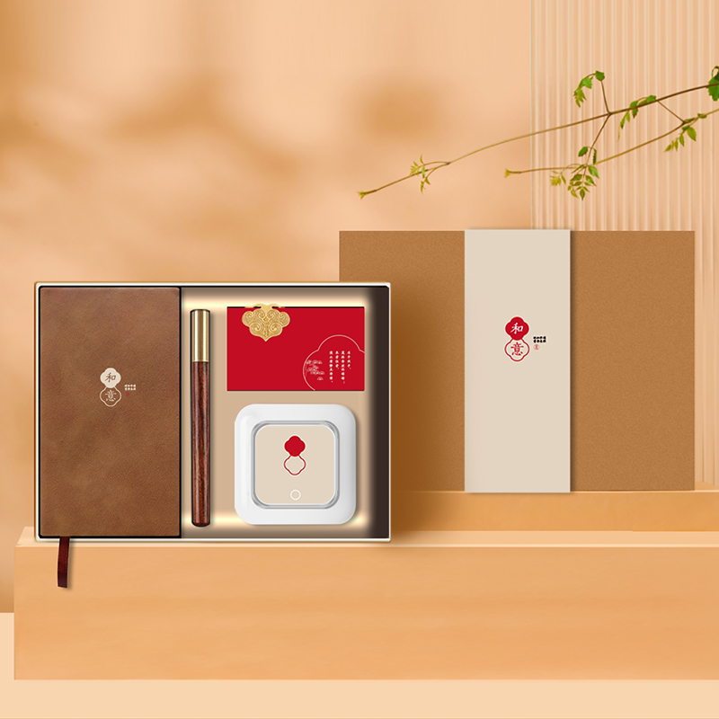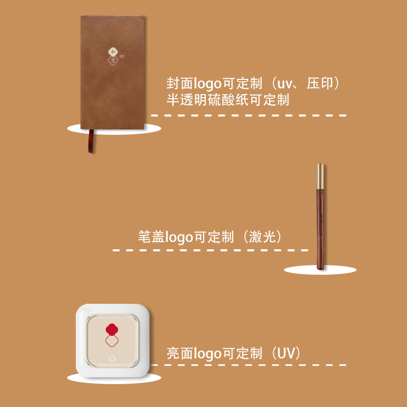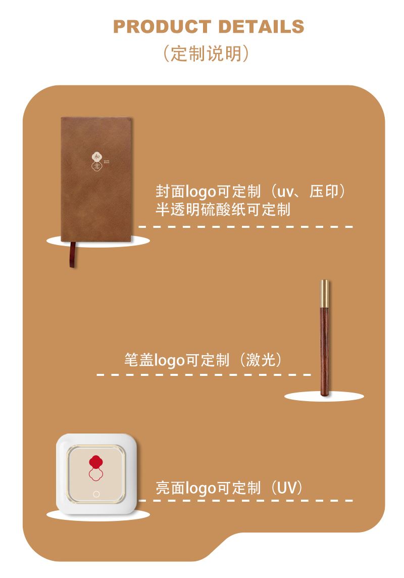 ❶ 触屏夜灯 材质:优质ABS 功能:触屏开关 光源:暖黄光 规格:8*8*3cm ❷ 磨砂羊巴软裱笔记本 A6: 9.5*17.3 cm 封面:羊巴纹 内芯:80克米黄纸100张 ❸ 红木签字笔 0.05cm笔芯 材质:黄铜、红木 ❹ 黄铜书签 纯正黄铜结合微雕工艺 ❺ 手提袋 尺寸: 25.5*22*4.8cm