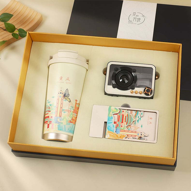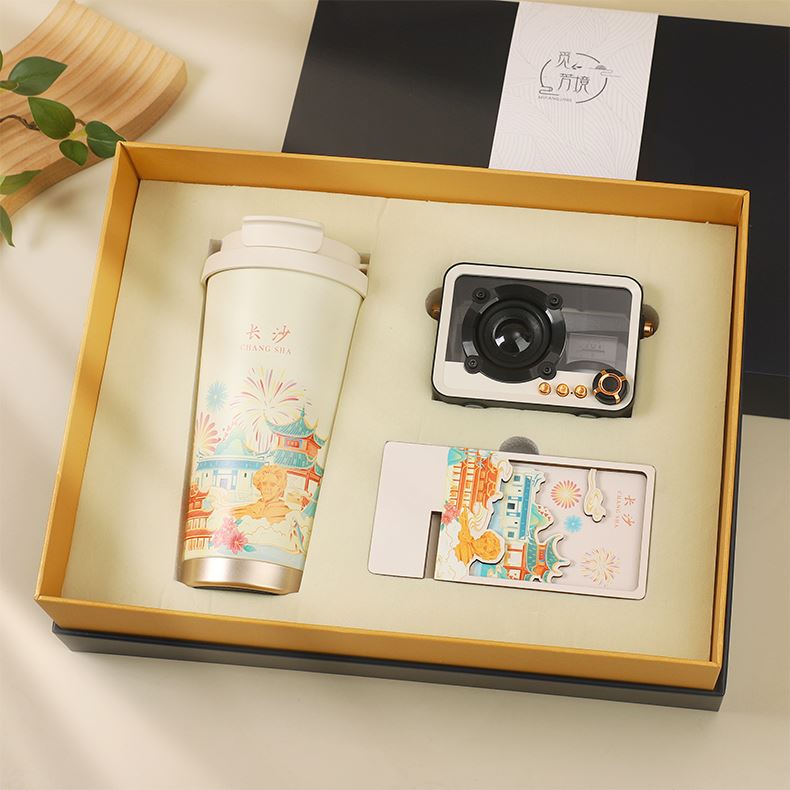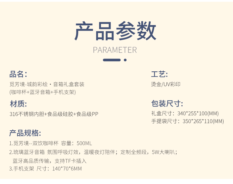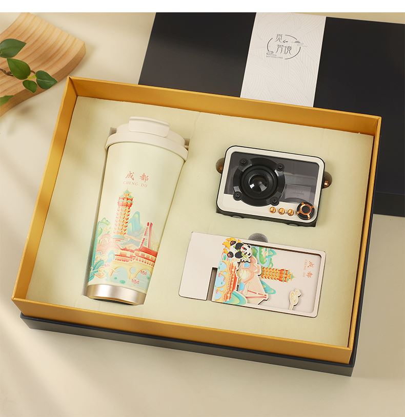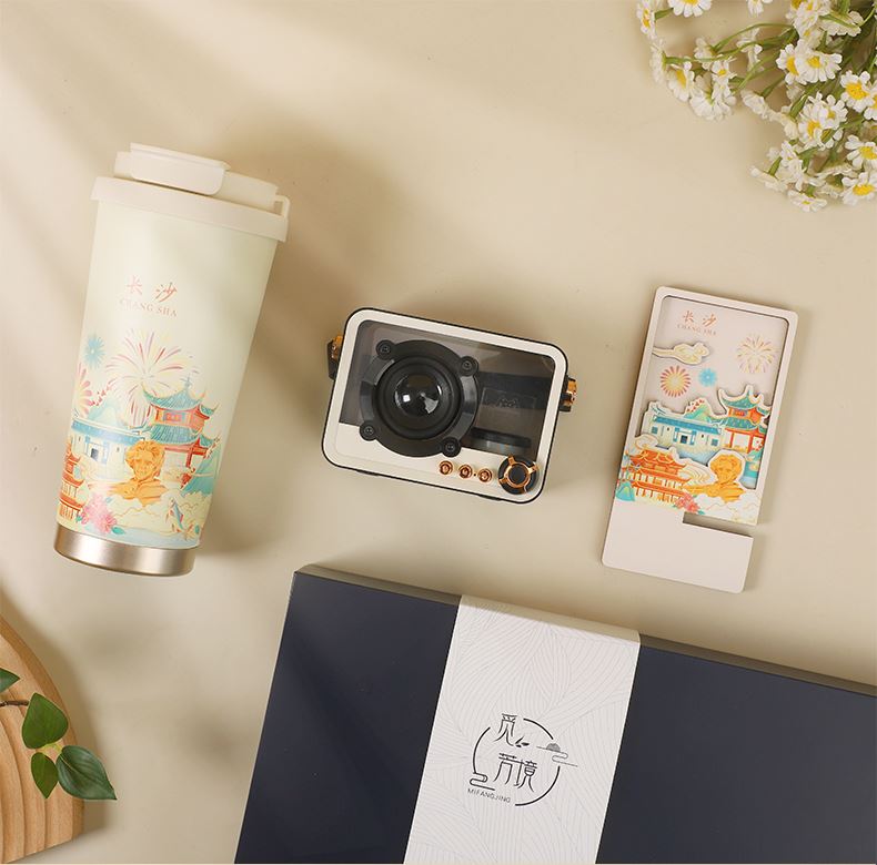 城市文创系列:成都、武汉、长沙、合肥、重庆、西安 1.觅芳境--双饮咖啡杯 容量:500ml 内胆:316 外壳:304 杯盖:食品级PP 吸管:食品级硅胶 吸嘴:食品级PP 密封圈:食品级硅胶 2.琉璃蓝牙音箱 蓝牙5.2方案,5W功率,续航6小时; 自由选择蓝牙 / TWS对联 / 插卡 / 等播放模式 3.手机支架 140*70*6MM 礼盒尺寸:340*255*100(MM) 手提袋尺寸:350*265*110(MM)