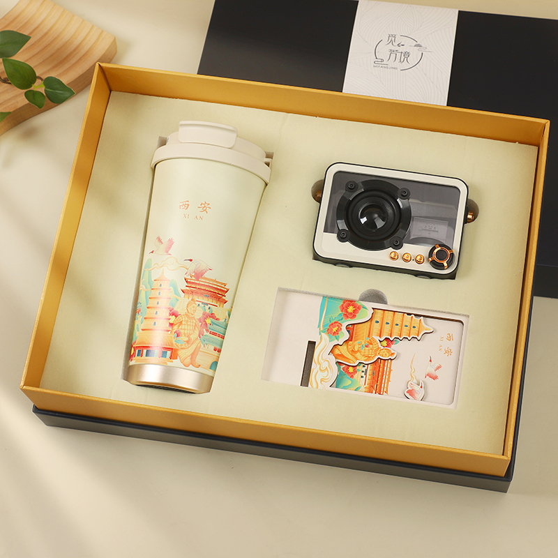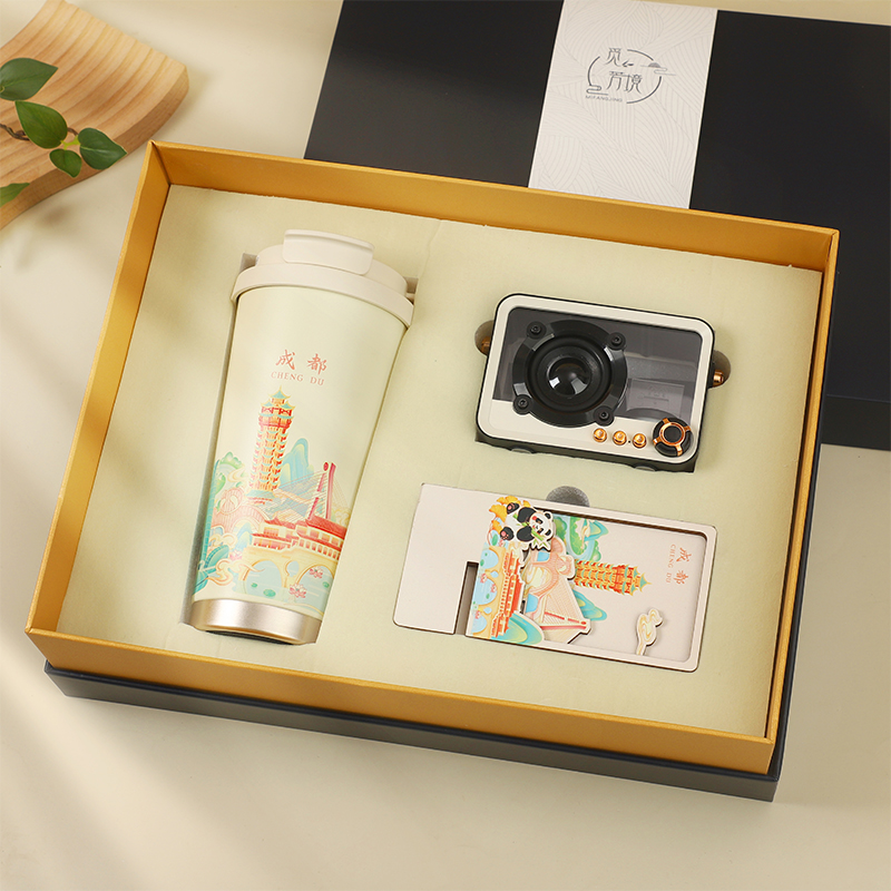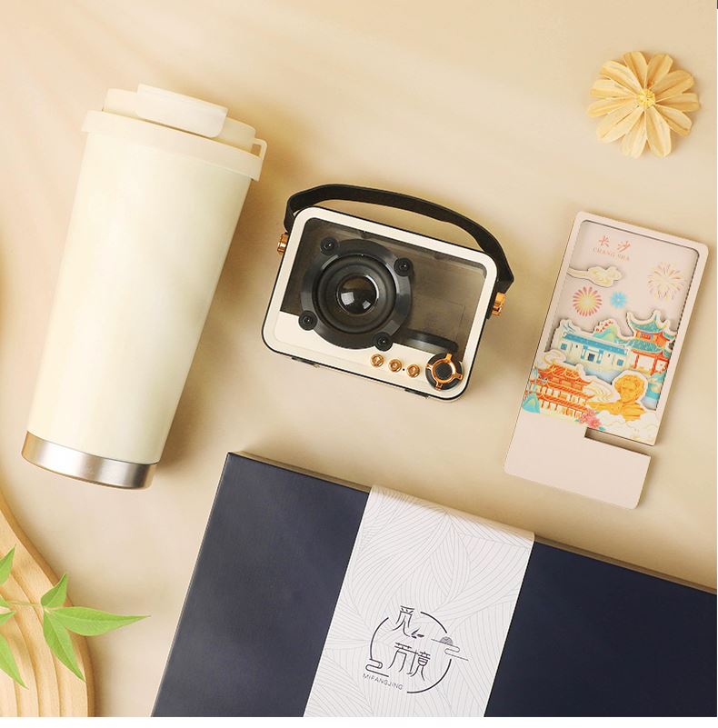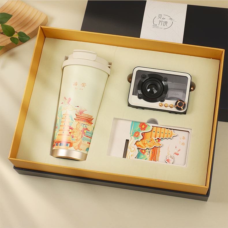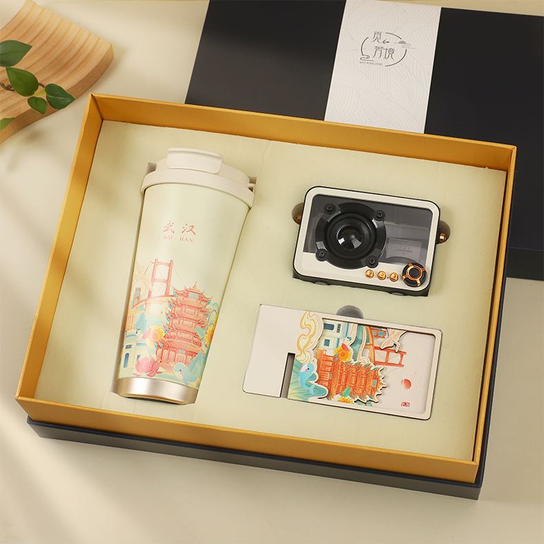城市文创系列:成都、武汉、长沙、合肥、重庆、西安 1.觅芳境--双饮咖啡杯 容量:500ml 内胆:316 外壳:304 杯盖:食品级PP 吸管:食品级硅胶 吸嘴:食品级PP 密封圈:食品级硅胶 2.琉璃蓝牙音箱 蓝牙5.2方案,5W功率,续航6小时; 自由选择蓝牙 / TWS对联 / 插卡 / 等播放模式 3.手机支架 140*70*6MM 礼盒尺寸:340*255*100(MM) 手提袋尺寸:350*265*110(MM)