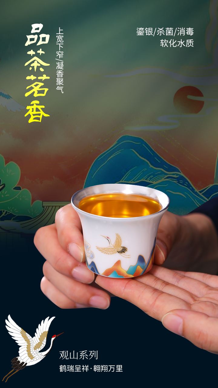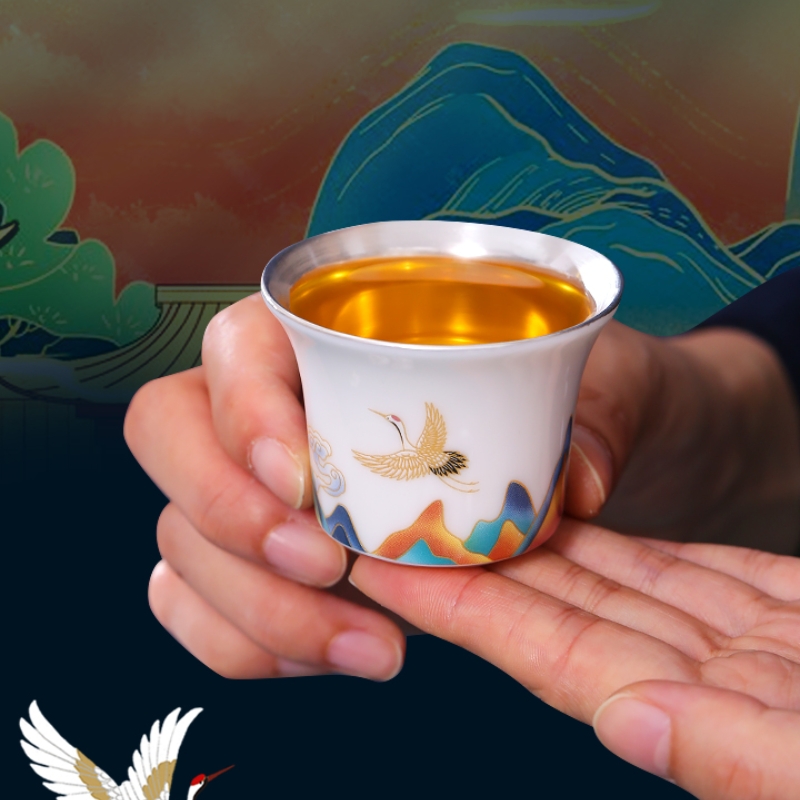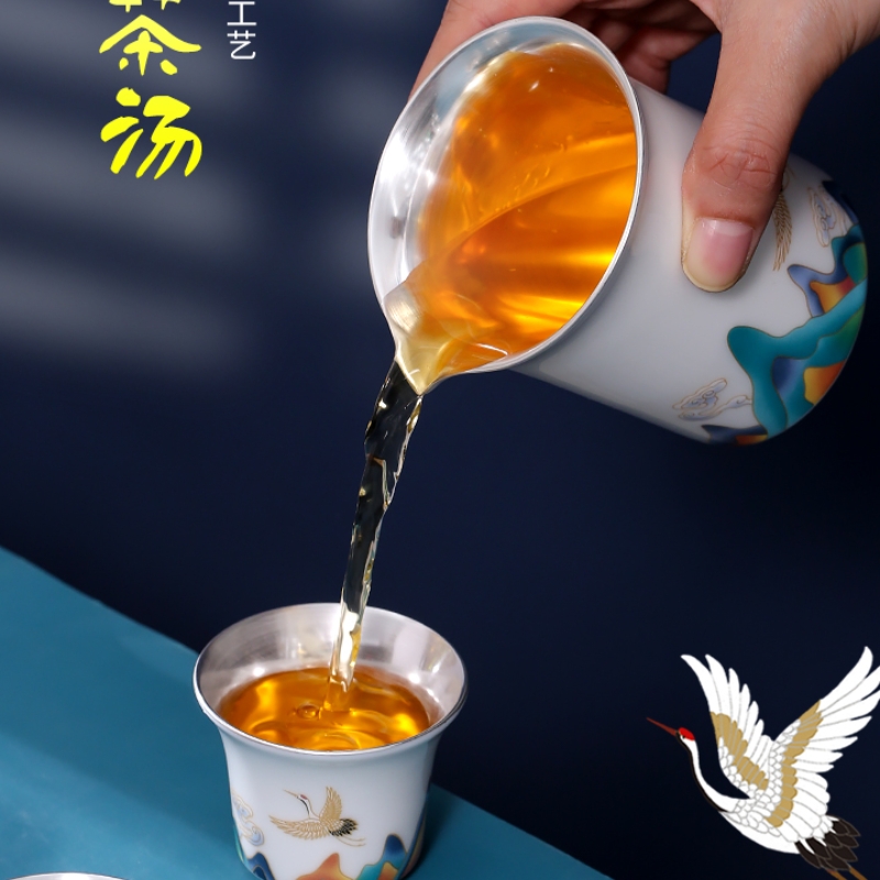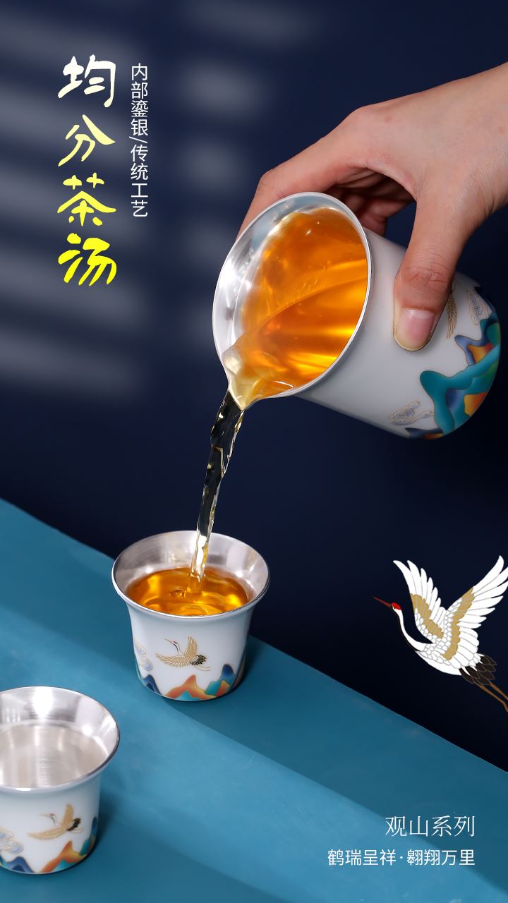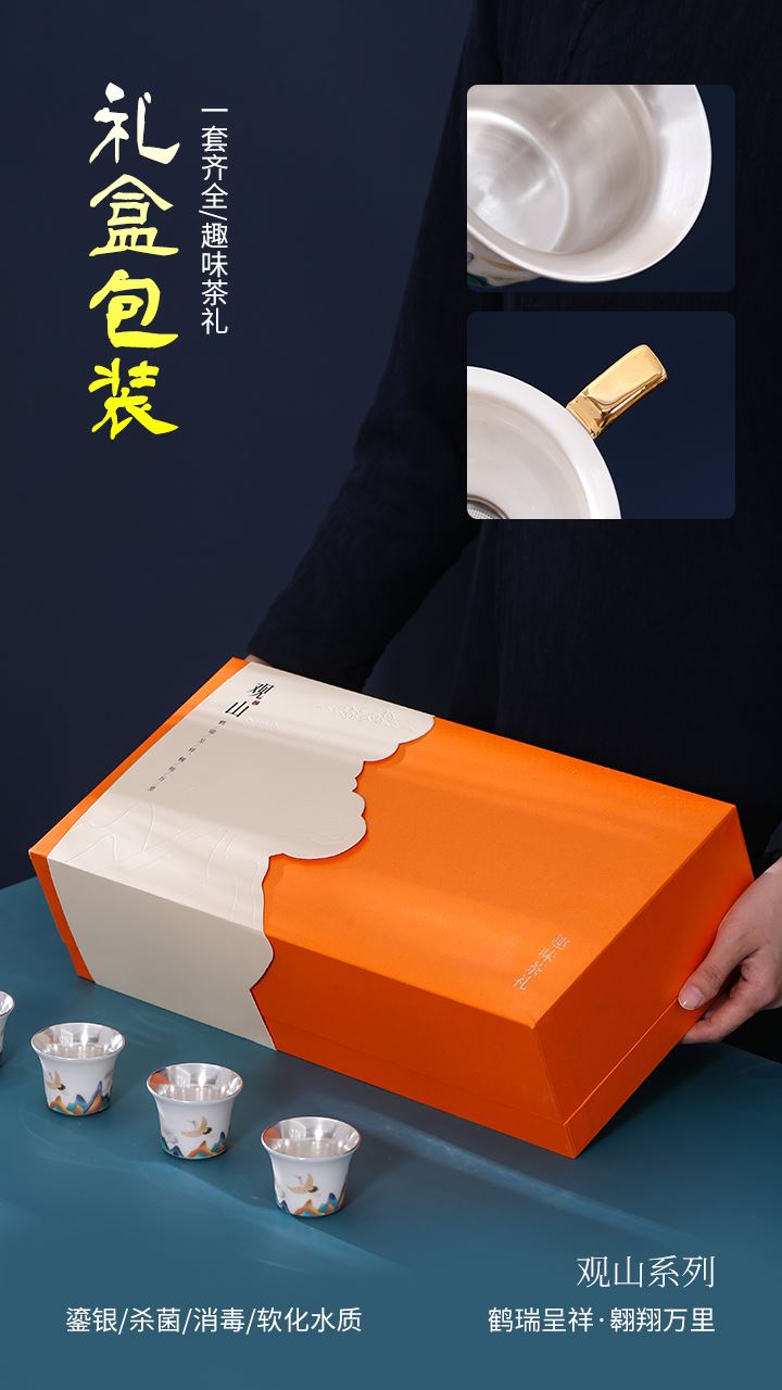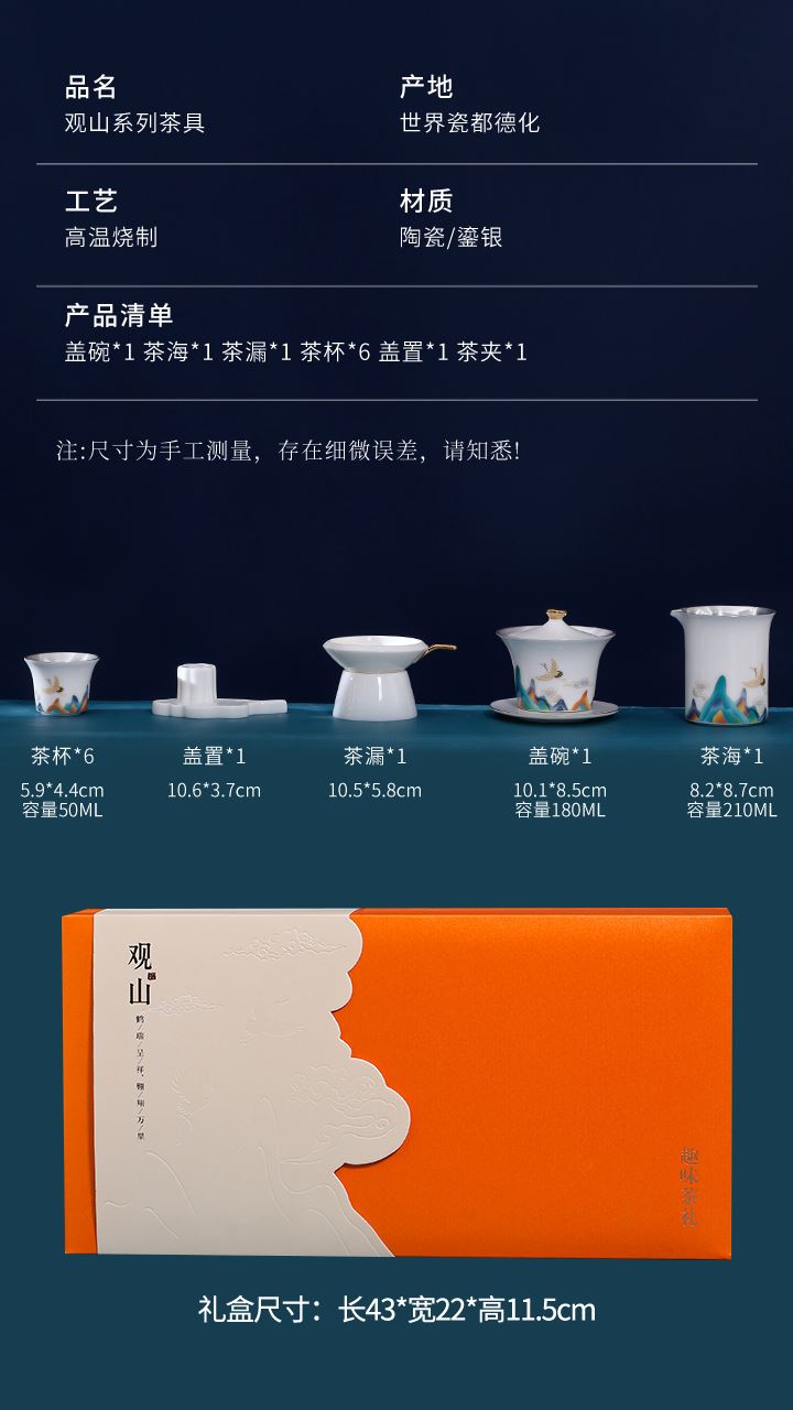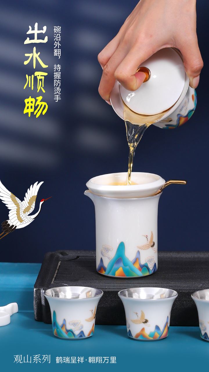 《鹤瑞呈祥-鎏银》 鎏银工艺是指银度达999以上的银块提炼成银膏,在杯子包银的工艺成为鎏银。 仙鹤在中华文化中有崇高的地位,是长寿,吉祥和高雅的象征。设计师以“仙鹤”飞过万重山,山的颜色大胆配色,搭配德化羊脂玉瓷,整套茶具呈现大气! 配置:盖碗*1+茶海*1+茶杯*6+茶漏*1+底托*1+竹夹+盖置 材质/工艺:羊脂玉瓷 箱礼盒尺寸:43X22X11.5cm 手提袋尺寸:44.3X24.3X12.3cm