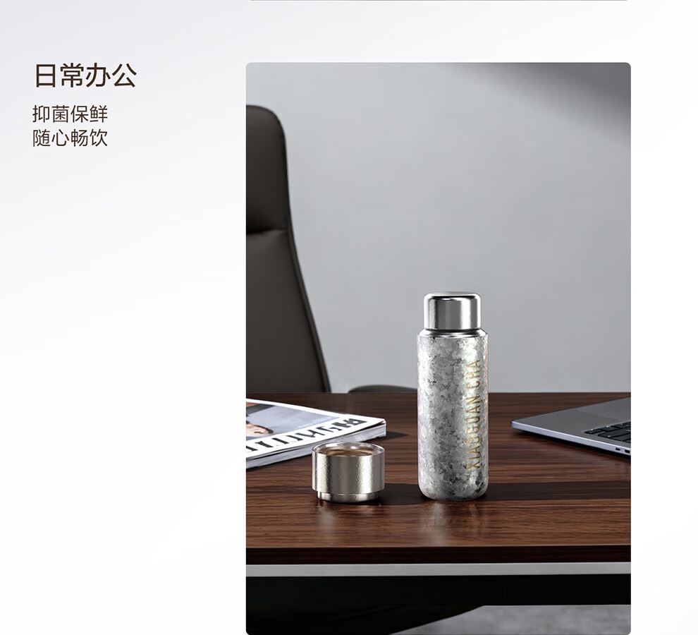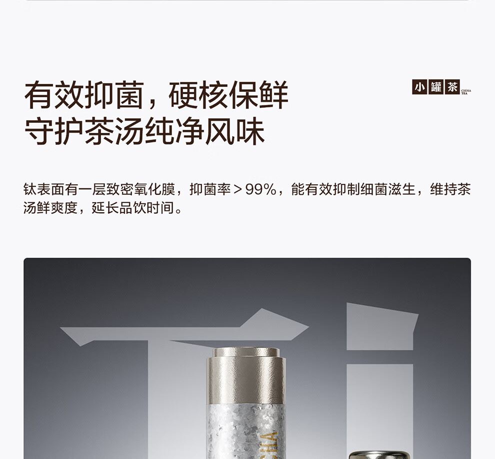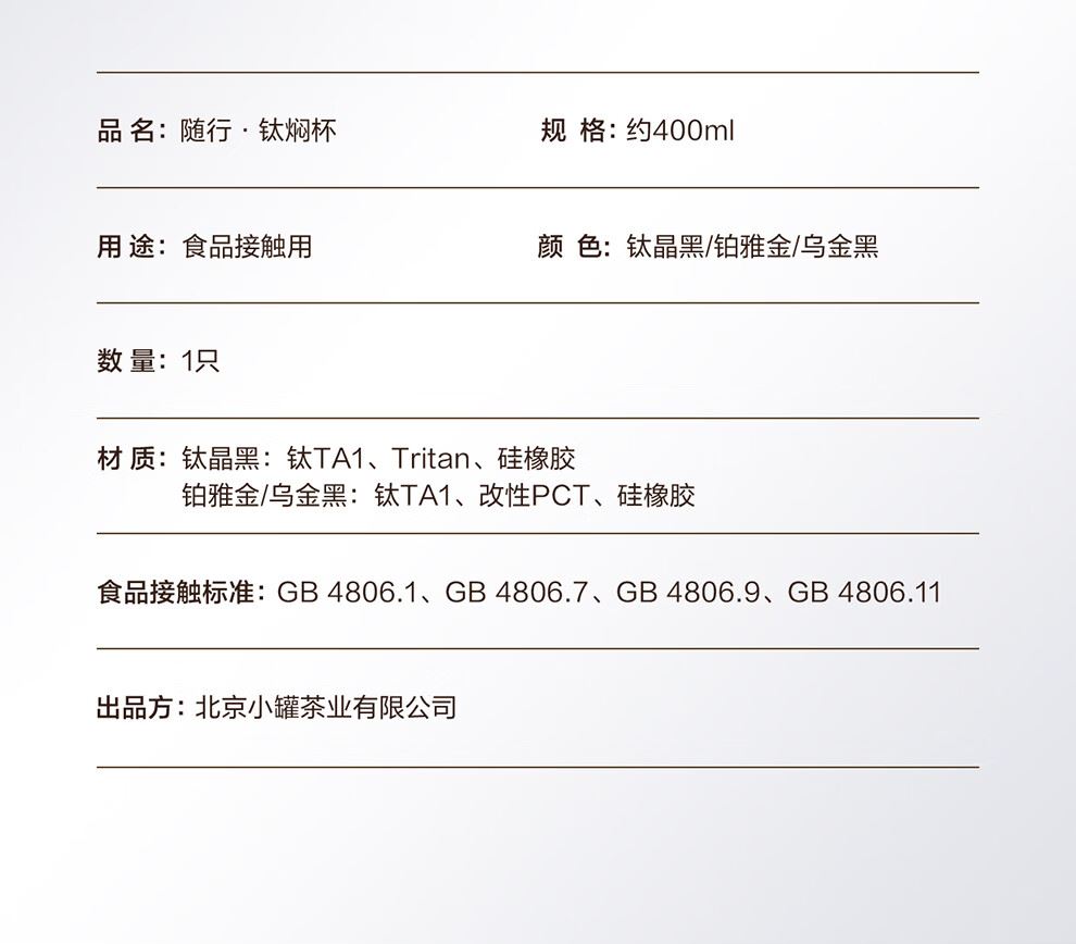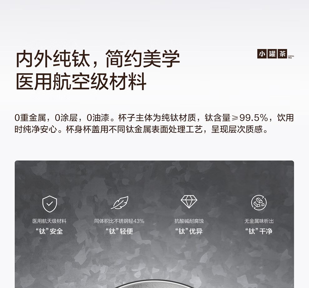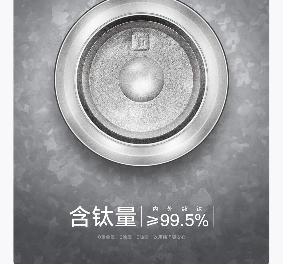 内外纯钛,简约美学 医用航空级材料 0重金属,0涂层,0油漆。杯子主体为纯钛材质,钛含量≥99.5%,饮用时纯净安心;杯身杯盖用不同钛金属表面处理工艺,呈现层次质感。