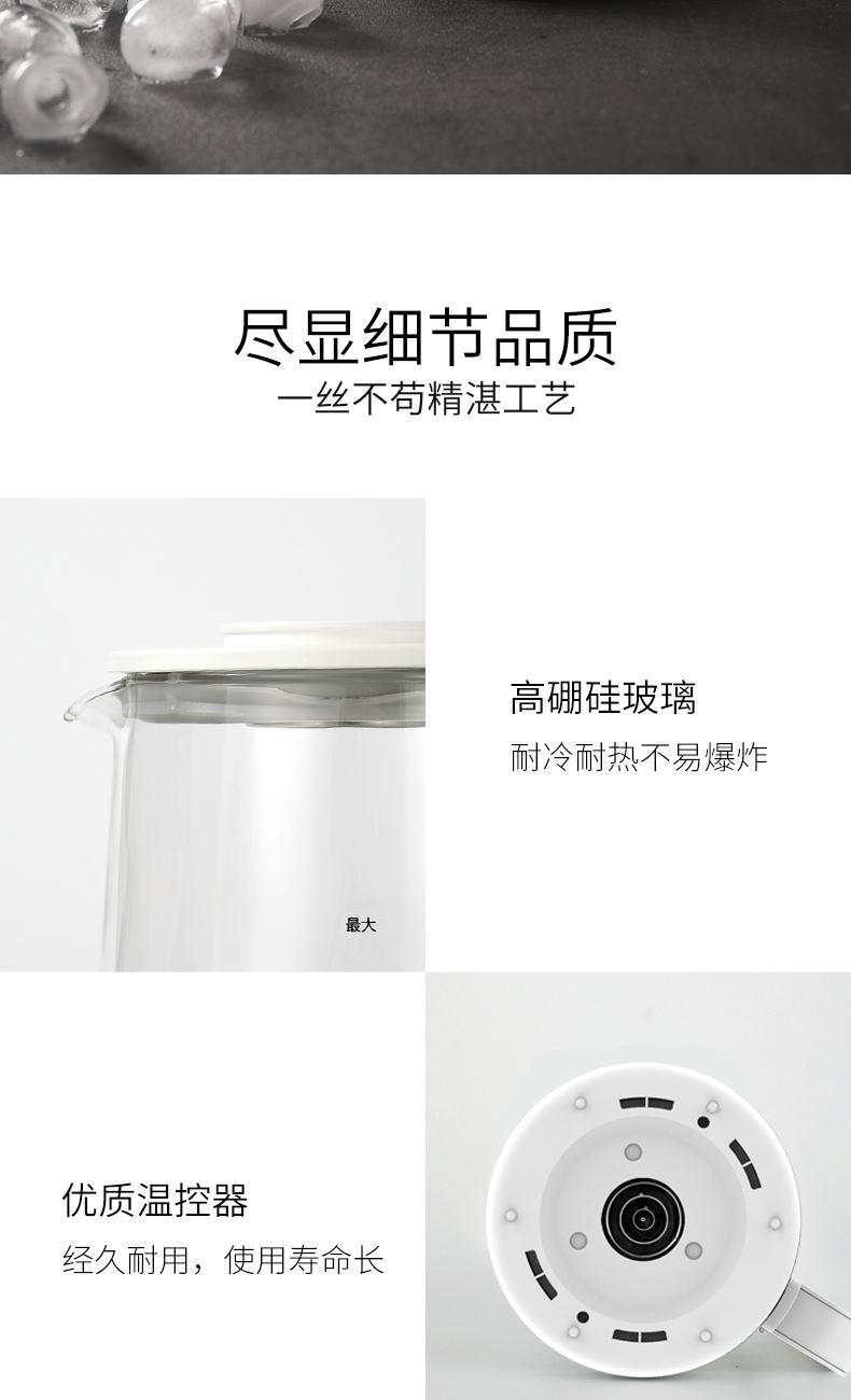 额定功率:800W 产品容量:1.5L 额定电压:220V~ 产品频率:50Hz 产品净重:1.0kg 产品毛重:1.4kg 整箱重量:18.0kg 高硼硅玻璃壶身高硼硅玻璃冷热交替不易裂 食品级不锈钢发热体食品级不锈钢发热体,长久耐用 触控菜单选择22大触控菜单选择,数码显示 功率可调、时间可调功率可调,180分钟定时,24小时预约