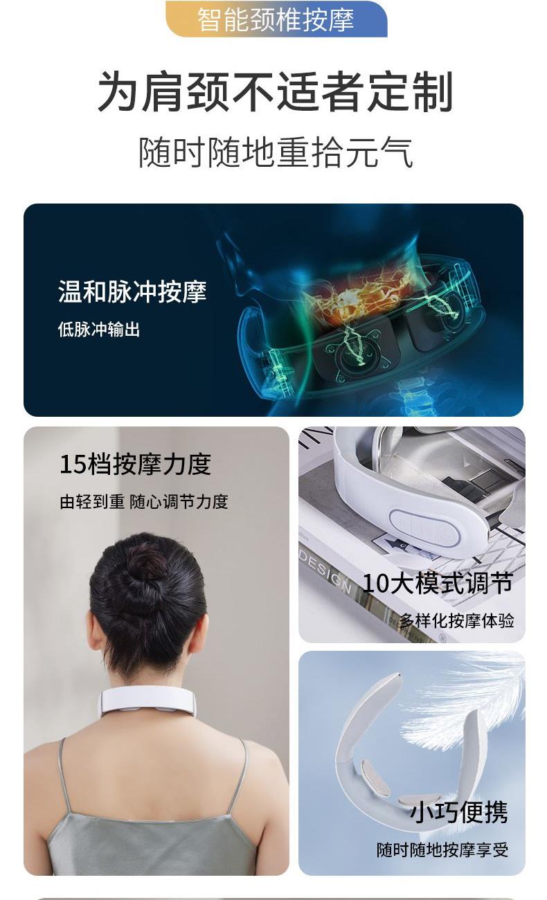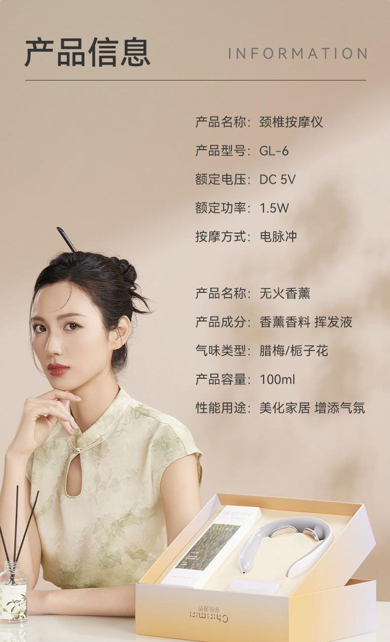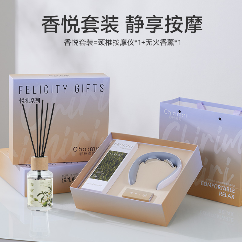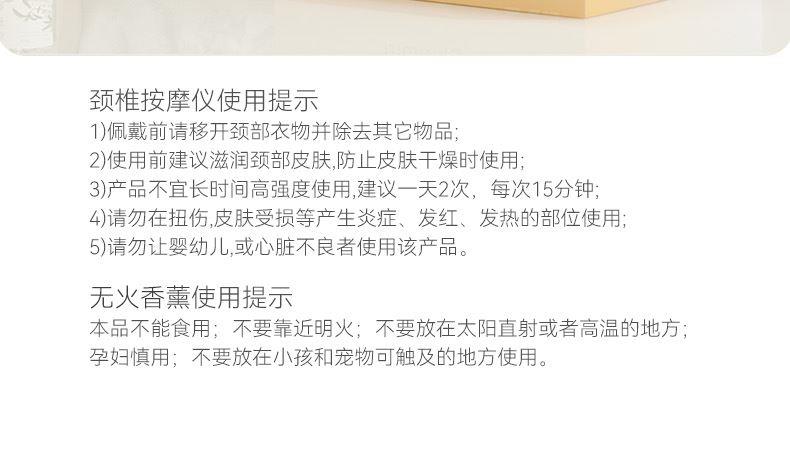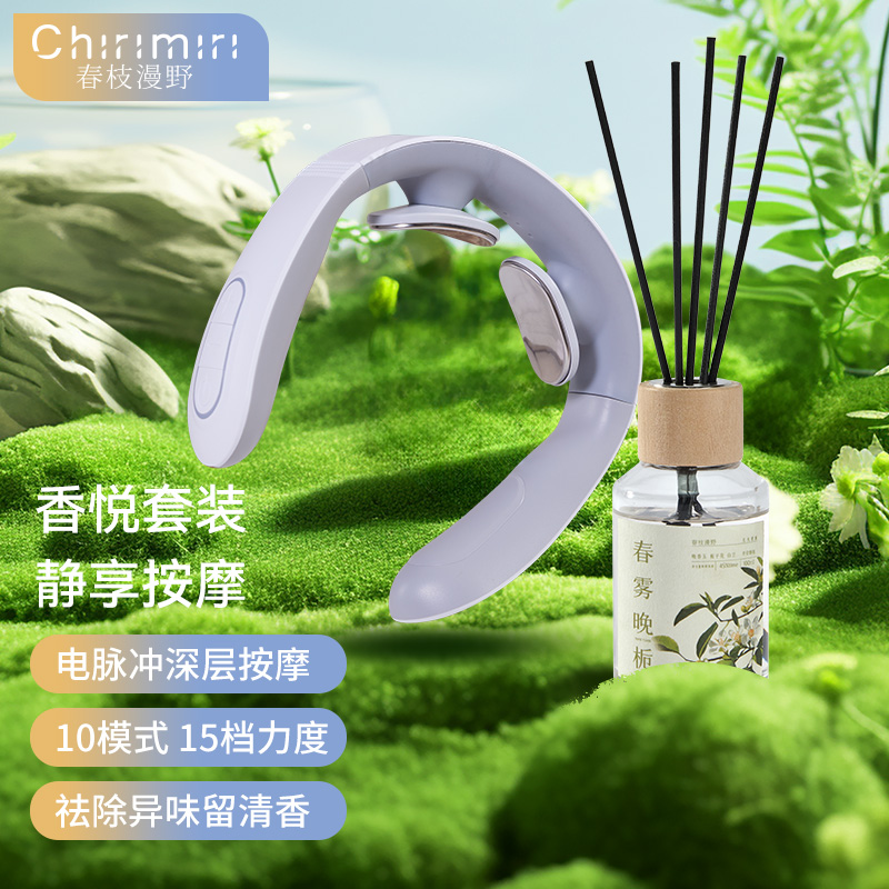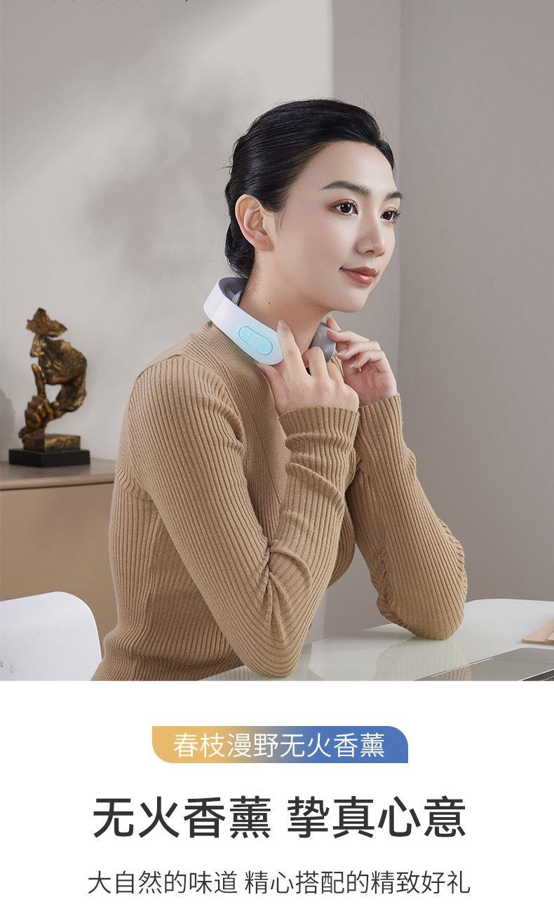 智能颈椎按摩仪: 微电流脉冲按摩,助力每日元气满满 人体工程学设计,给你更好的体验 重新定义EMS智能微电技术 轻巧便携,走到哪按到哪儿 风铃春早无火香薰: 香气在弥漫 清新野花香调 与细腻的朝露气息 用气味 牵动情绪