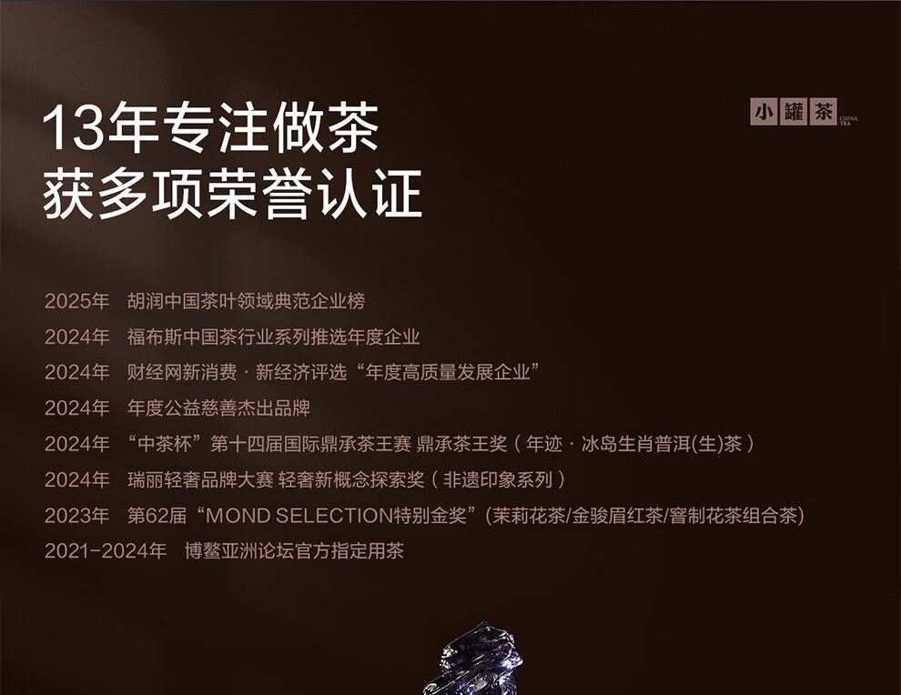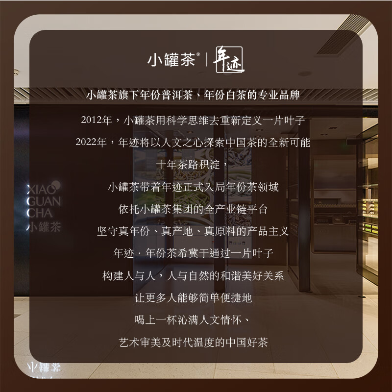 轻奢商务茶叶pin牌-小罐茶 小罐茶全国线下2000+实体门店 小罐茶 x 敢保真(产地保真、年份保真、安全保真) 档次商务送礼就送小罐茶 年迹 · 寿眉茶(紧压白茶)2018 净 含 量:510克(5g*102饼) 形态:紧压茶(小饼) 木盒尺寸:26.3*10.7*5.8cm 蕴藏寿眉白茶的年份美 三枚封贴 专业认证 科学做茶 让好茶有标准 年份年迹茶 精致木盒包装,送礼体面彰显尊贵;宜礼宜饮 适用多种社交场景传递美好情谊,一盒满足礼赠贵宾、商务会面、重要答谢等需求。 出品方:北京小罐茶业有限公司