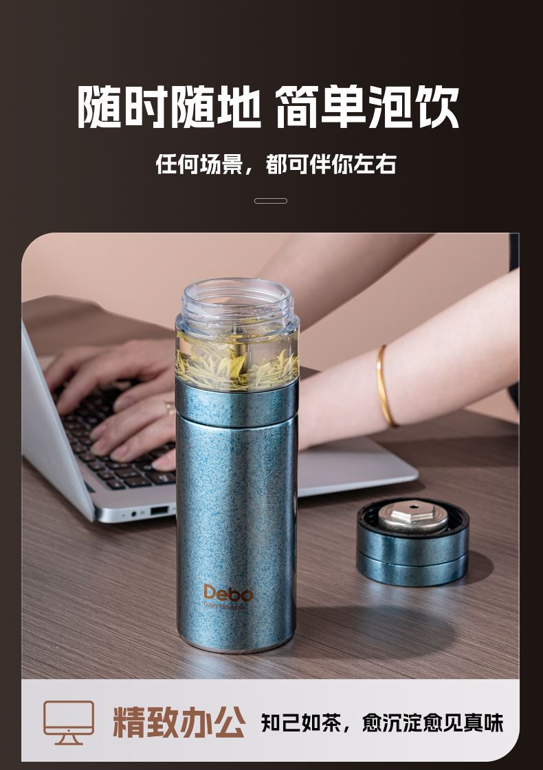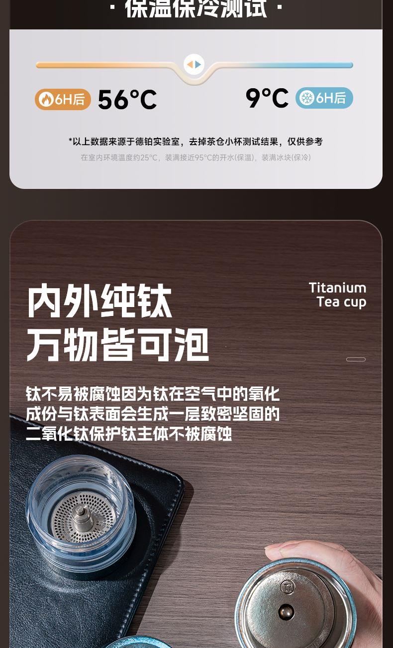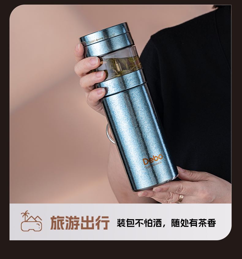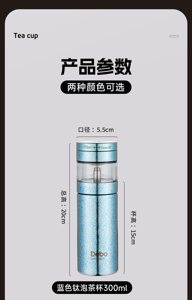 型号:DEP-DS455 容量:300ml 颜色:蓝色/本色 材质:钛、高硼硅玻璃、改性PCT(Tritan) 包装尺寸:260*188*92mm 配置:钛杯身*1、玻璃杯身*1、杯盖*1、 茶仓*1 1. 纯钛材质打造,宝石般质感,触感温润细腻纯净姿态,留住醇香原味; 2. Hold住冷热,内外纯钛,真空保温设计,长效保温保冷,突破保温性能; 3. 双层高硼硅玻璃,隔热防烫,加厚实心杯底; 4. 茶仓为Tritan材质,耐高温、耐冲击; 5. 旋压式锁水,浓淡随心掌控,泡茶新方式; 6. 一盖多用,杯盖转变茶壶和水杯,细品茶茗