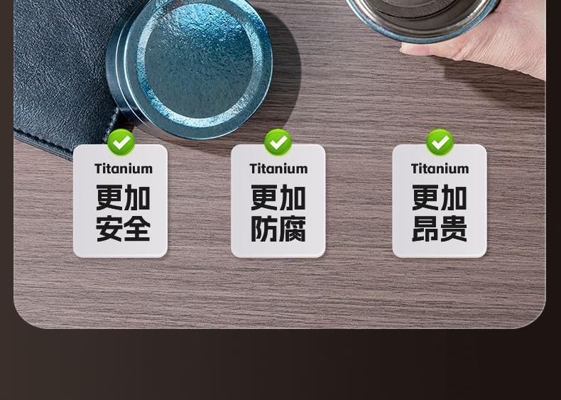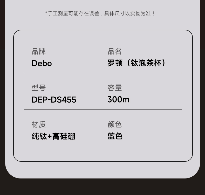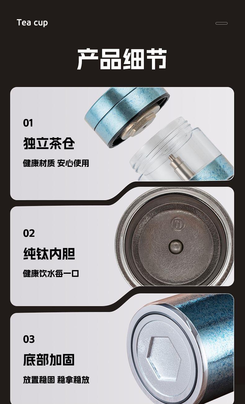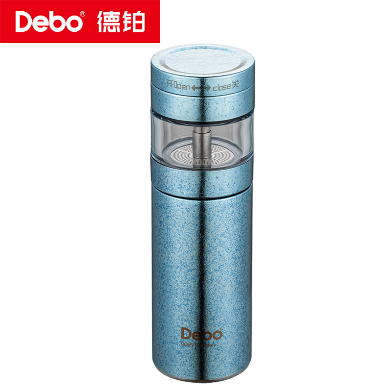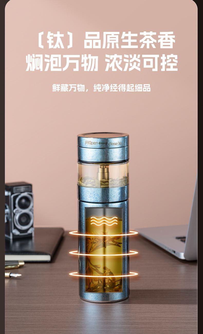 型号:DEP-DS455 容量:300ml 颜色:蓝色/本色 材质:钛、高硼硅玻璃、改性PCT(Tritan) 包装尺寸:260*188*92mm 配置:钛杯身*1、玻璃杯身*1、杯盖*1、 茶仓*1 1. 纯钛材质打造,宝石般质感,触感温润细腻纯净姿态,留住醇香原味; 2. Hold住冷热,内外纯钛,真空保温设计,长效保温保冷,突破保温性能; 3. 双层高硼硅玻璃,隔热防烫,加厚实心杯底; 4. 茶仓为Tritan材质,耐高温、耐冲击; 5. 旋压式锁水,浓淡随心掌控,泡茶新方式; 6. 一盖多用,杯盖转变茶壶和水杯,细品茶茗