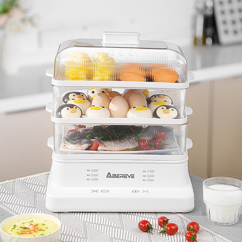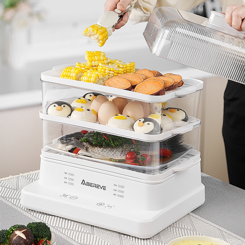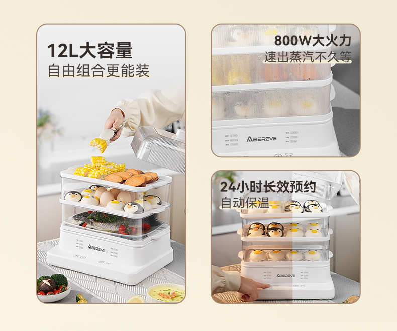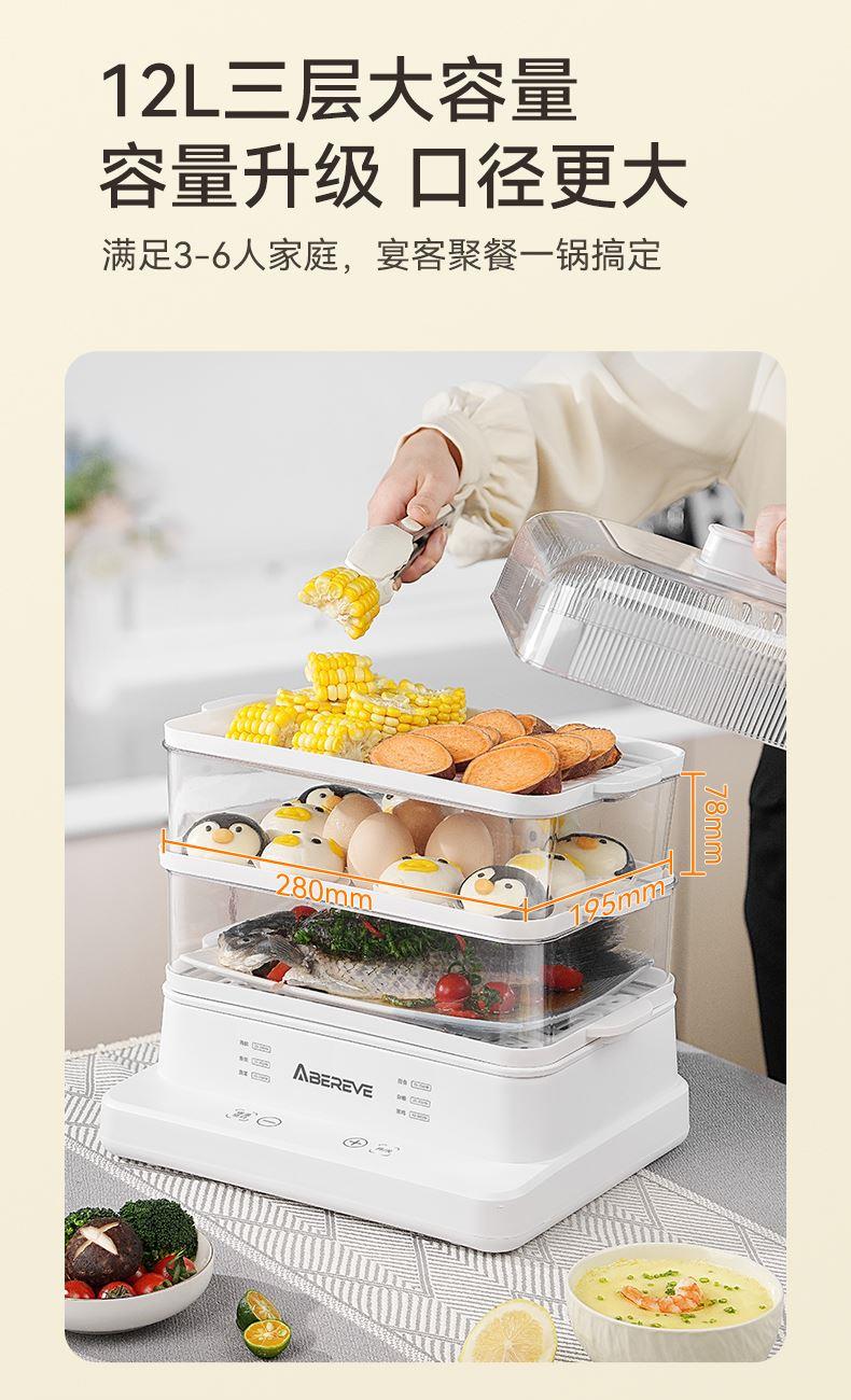 产品颜色:复古白 产品材质:PP+PC 额定电压:220V~ 额定频率:50Hz 额定功率:800W 额定容量:12L 产品净重:2.1KG 产品毛重:2.65KG 产品尺寸:310*250*365mm 包装尺寸:355*306*290mm 外箱尺寸:938*365*595mm 单台为彩盒包装;6台/箱 三层超级大容量,可根据食材需求灵活切换空间 ◁800W大功率蒸煮,蒸汽直达食材内部,热力十足 ◁多功能菜单选择,智能触控简单操作,省心做大厨 ◁长效预约保温功能,定时免看管更省心 ◁全景透明可视,告别频繁揭盖,蒸煮过程一目了然