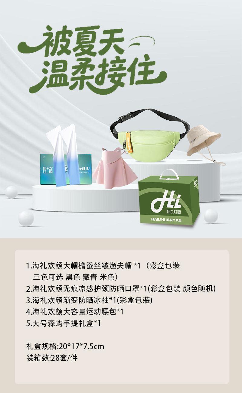 1.海礼欢颜大帽檐蚕丝皱渔夫帽 *1 (彩盒包装 三色可选 黑色 藏青 米色) 2.海礼欢颜无痕凉感护颈防晒口罩*1(彩盒包装 颜色随机) 3.海礼欢颜渐变防晒冰袖*1(彩盒包装) 4.海礼欢颜大容量运动腰包*1 5.大号森屿手提礼盒*1