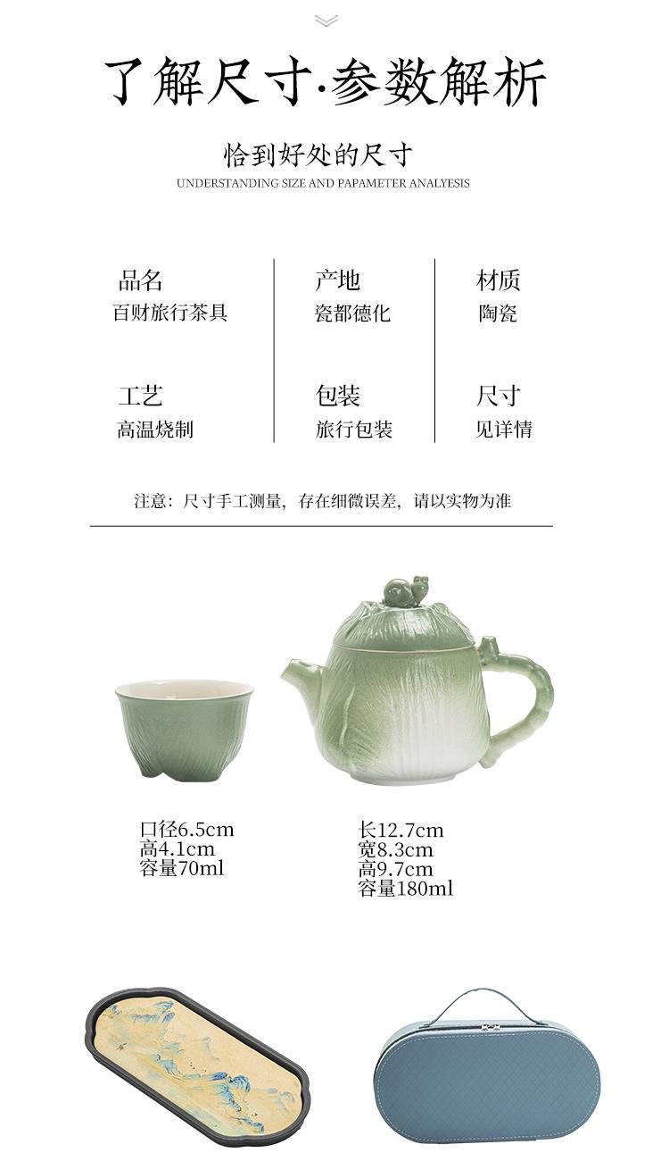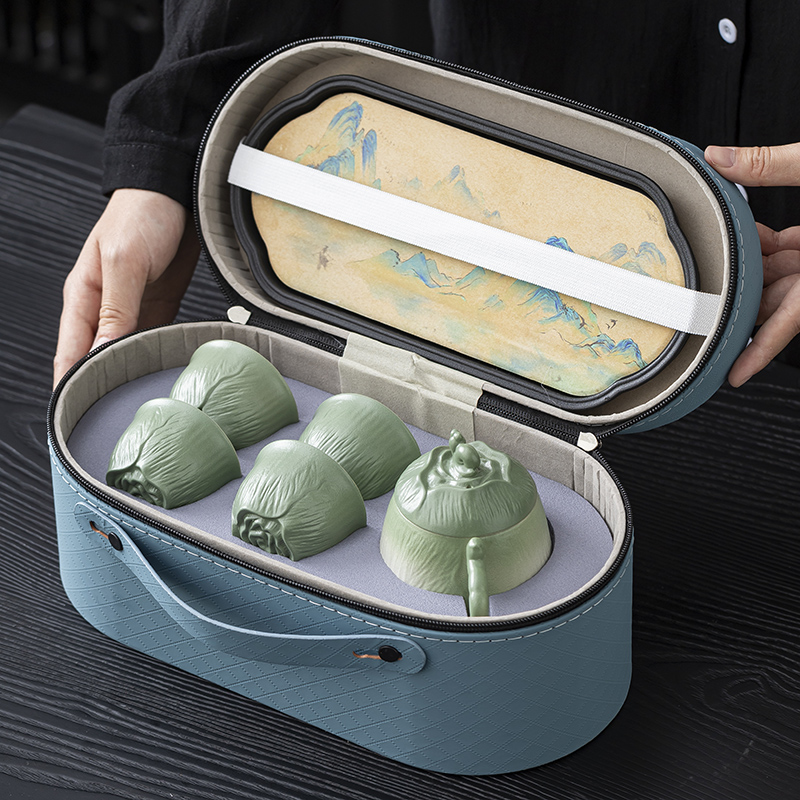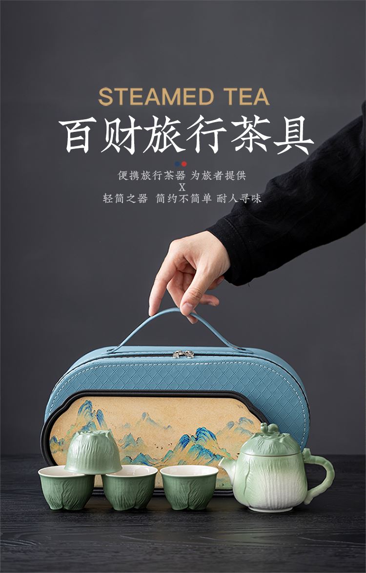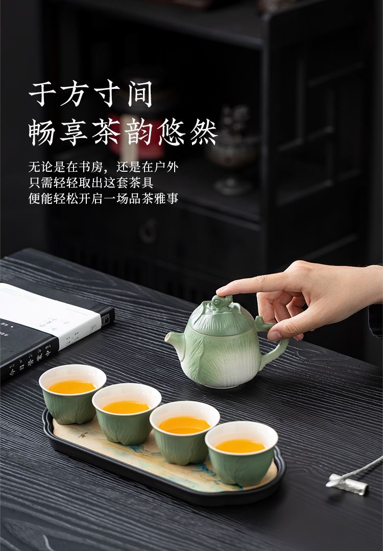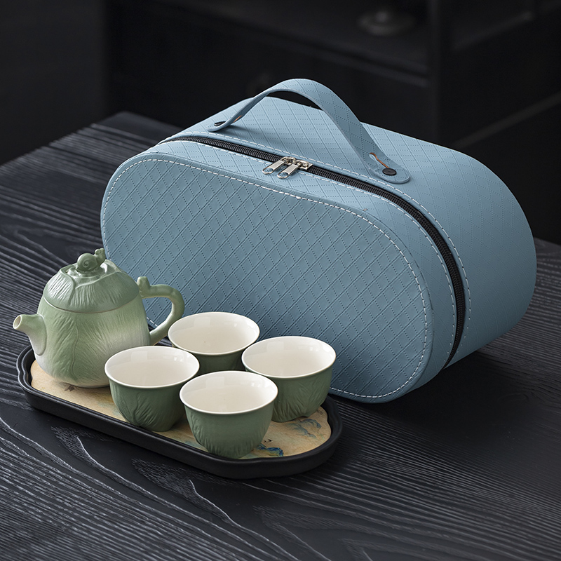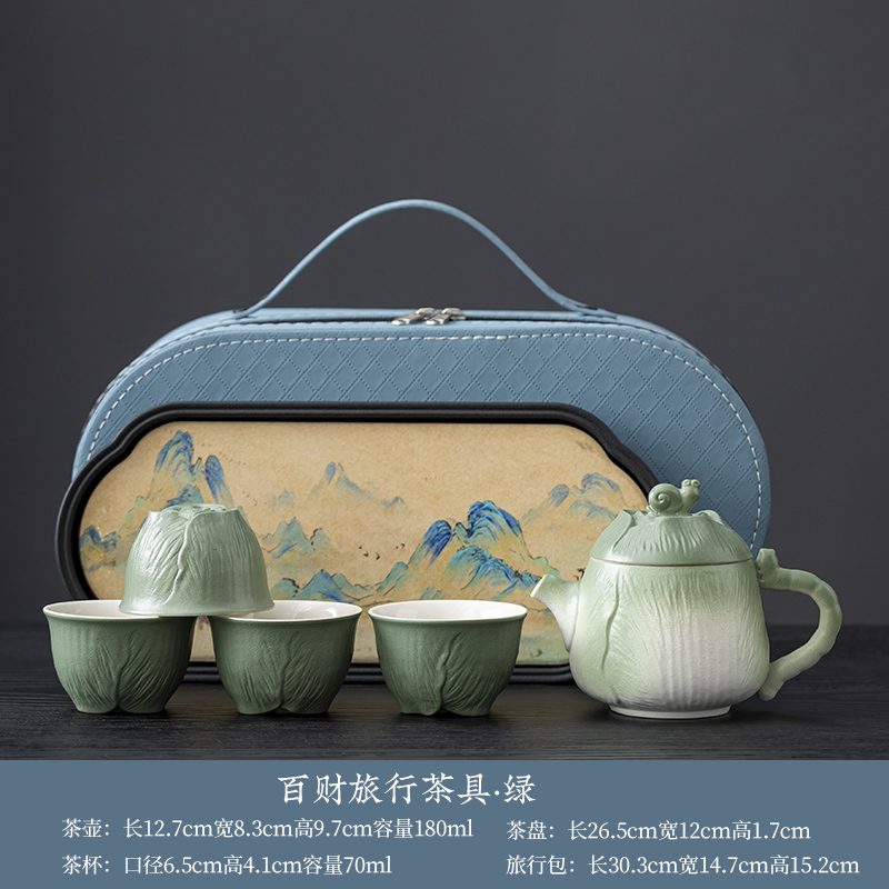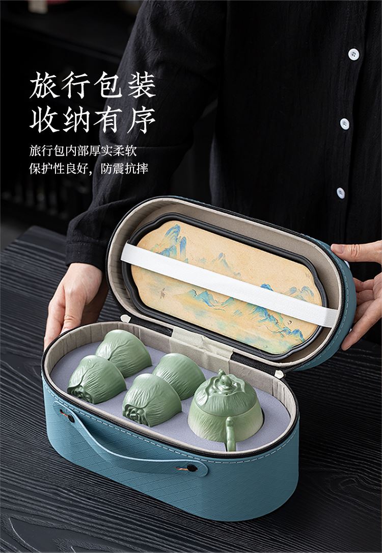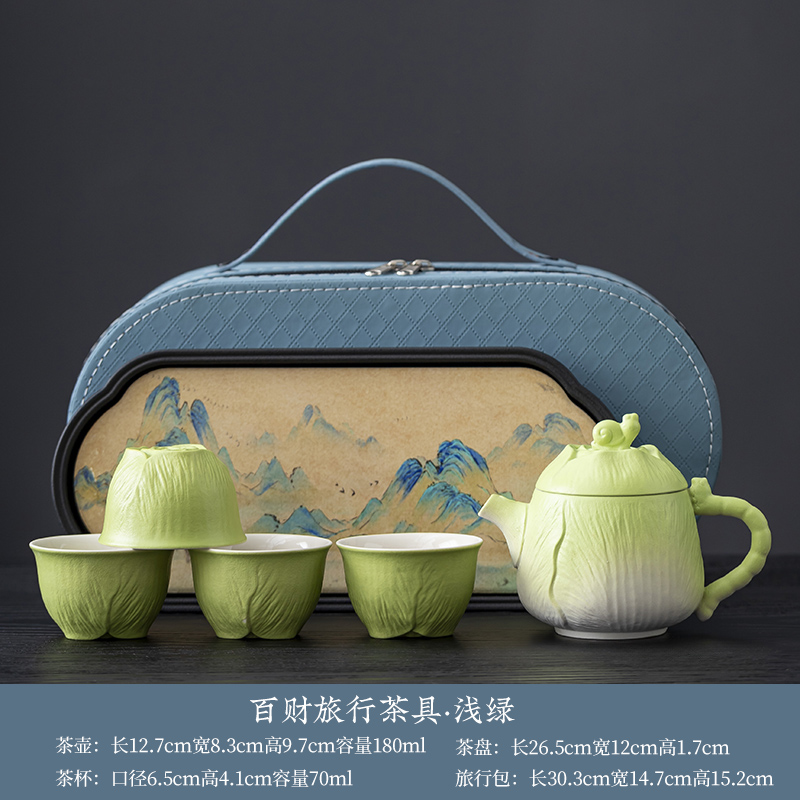 云博陶瓷大白菜粗陶一壶四杯旅行皮盒带千里江山茶盘户外茶具