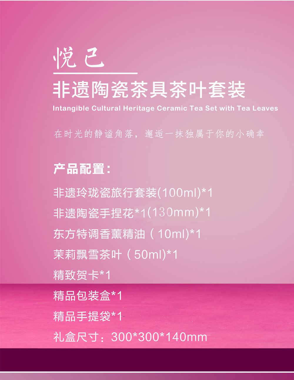 【产品配置】 茉莉飘雪茶叶(50g)*1 菱烟非遗玲珑快客杯旅行套组*1 非遗手捏花摆件(直径90mm)*1 特调香薰精油*1 贺卡*1 礼盒*1 礼袋*1 【产品说明】 纯手工捏花扩香器,传统玲珑瓷技艺,瓷胎透光如玉,展现千年非遗文化精髓; 手捏花扩香器+特调香薰,一器两用,打造雅致生活氛围; 便携快客杯搭配茉莉飘雪茶,享受茶道仪式感; 全套精致包装(礼盒+贺卡+手提袋),开箱有仪式感。