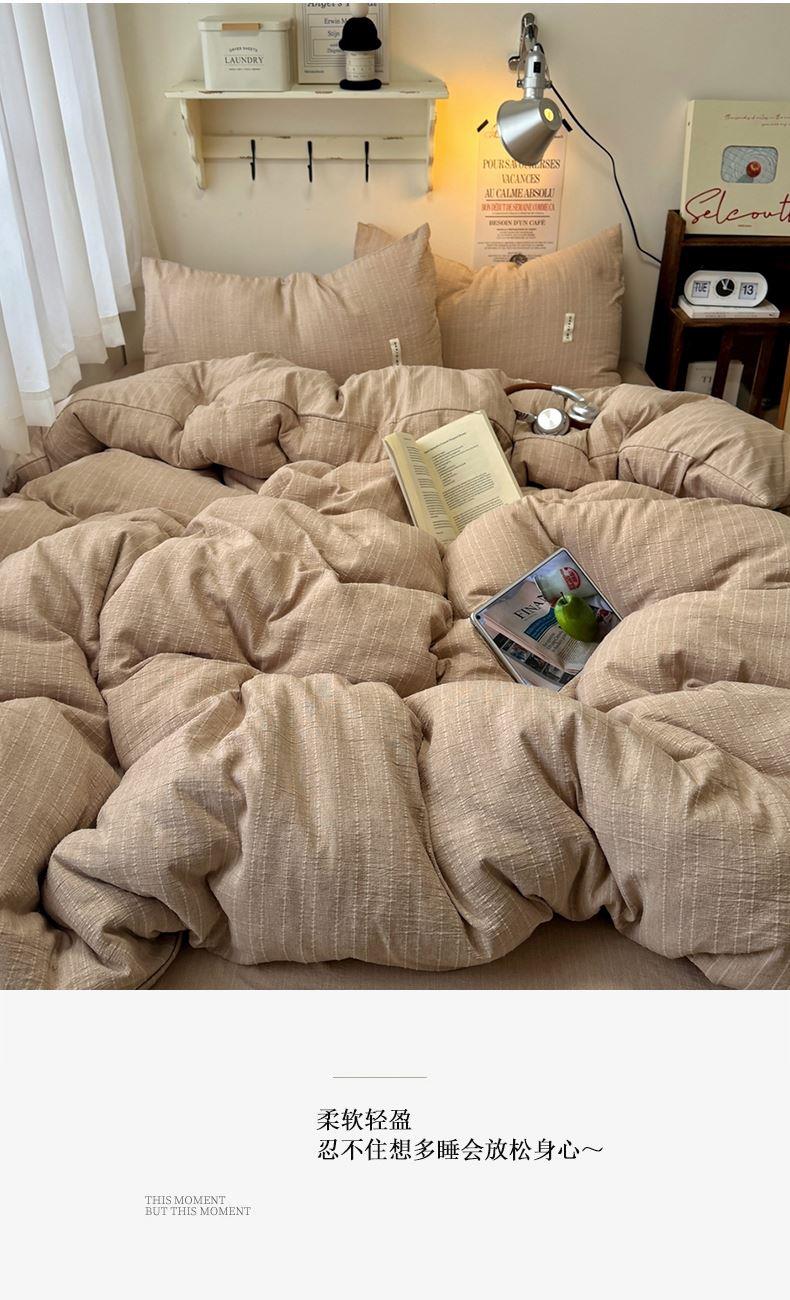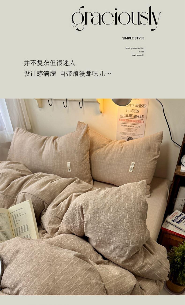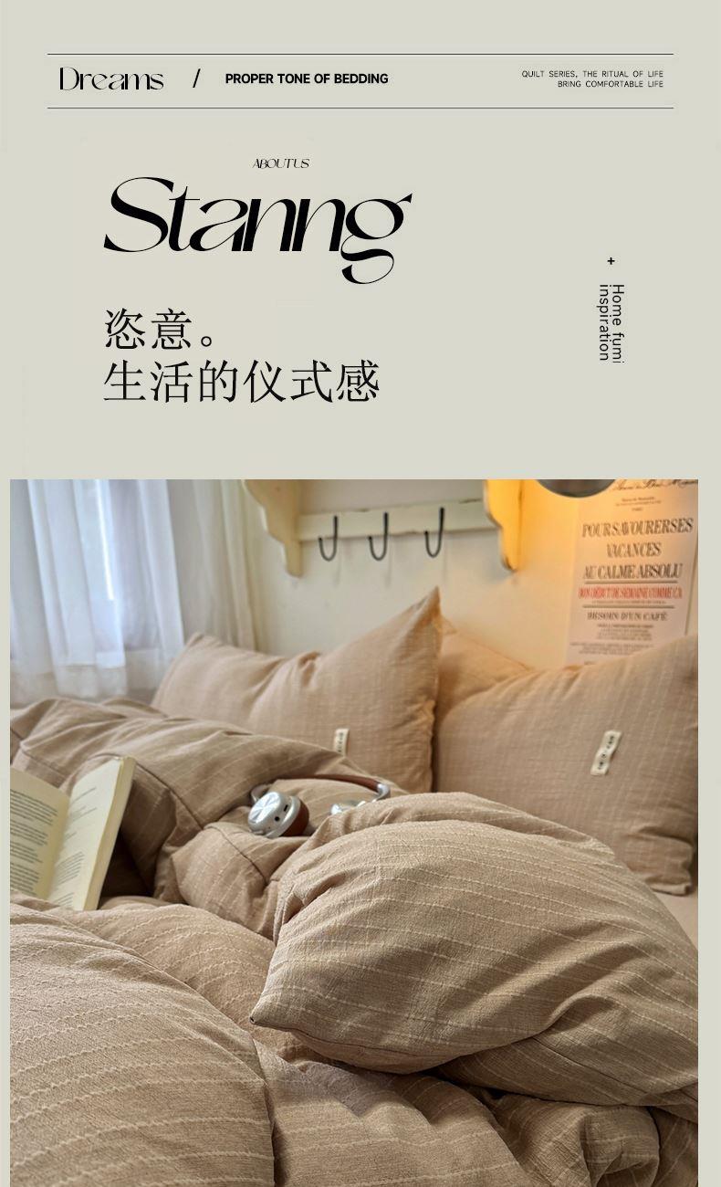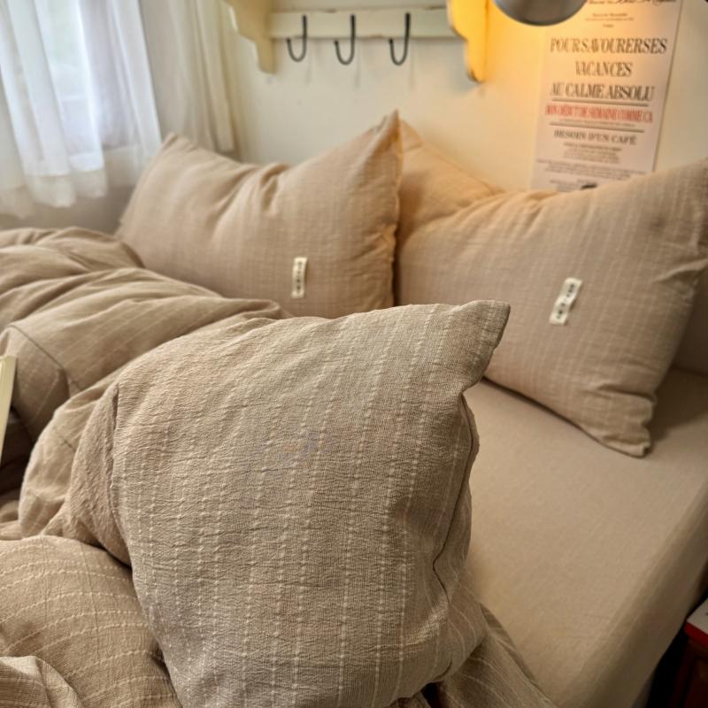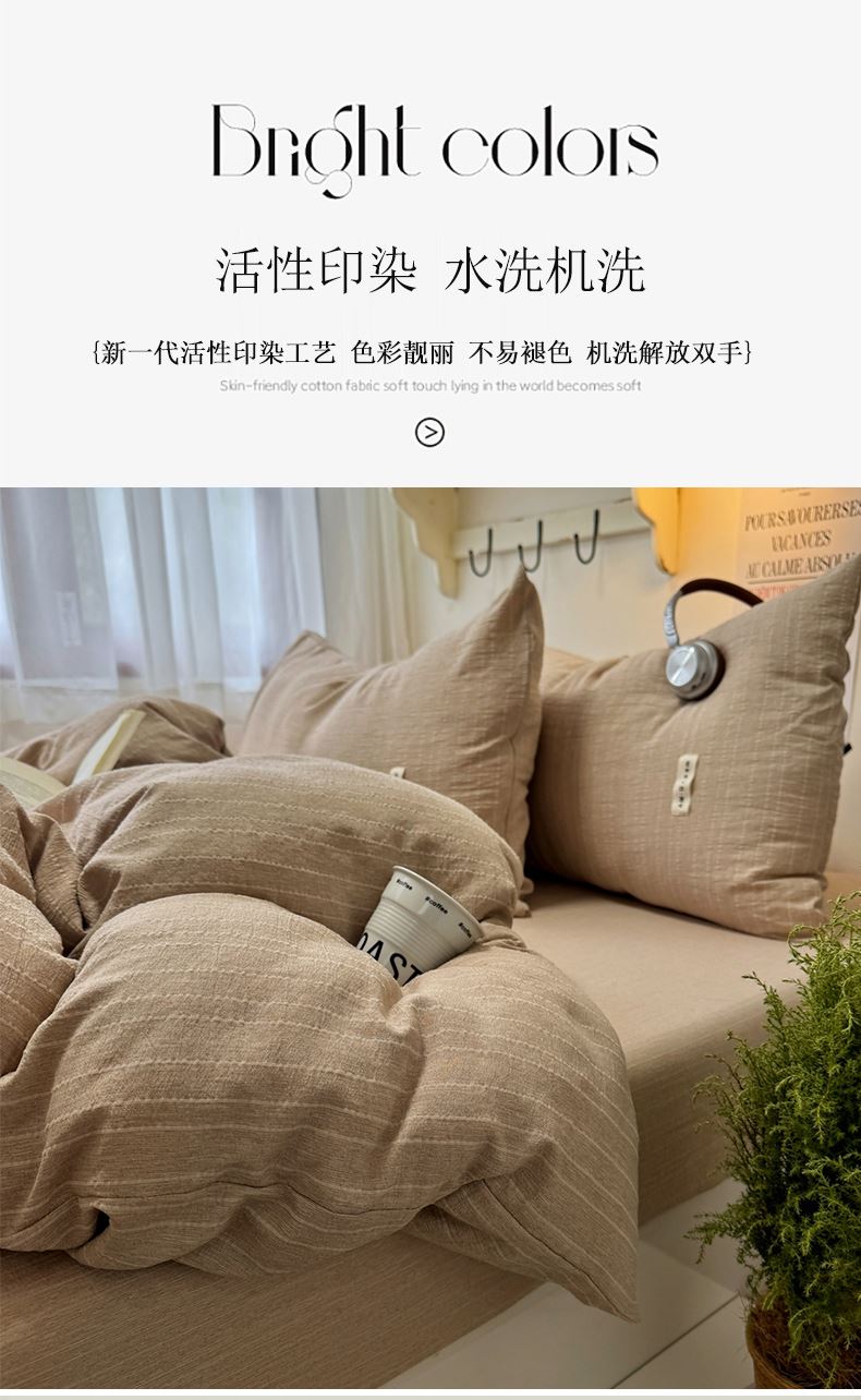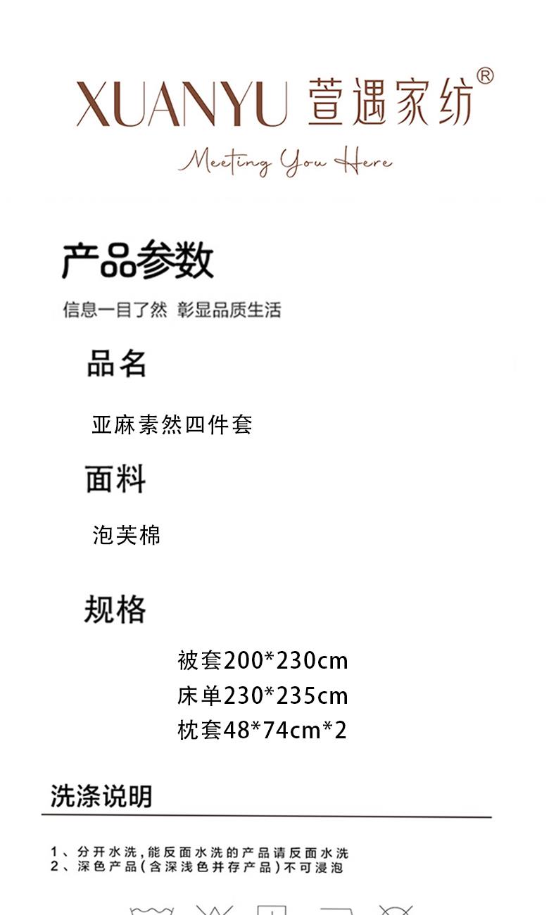 被套:200*230cm 床单:230*235cm 枕套:48*74cm*2 面料:泡芙棉 执行标准:GB/T22796-2021 安全类别:GB18401-2010 B类 1.面料采用生态亲肤棉,新型环保浆料活性印染,不褪色,不缩水,其生态环保理念在很大程度上满足了消费者对床品舒适度的高要。 2.生态棉面料,手感柔软,舒适质感丰厚,而且有厚重感,容易打理。整体套件,色彩丰富自然,阵线细致密实,错落有序,更显档次。