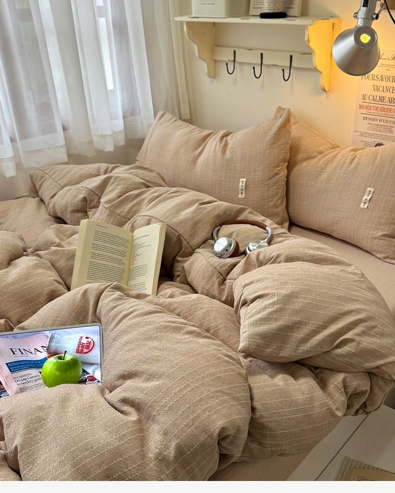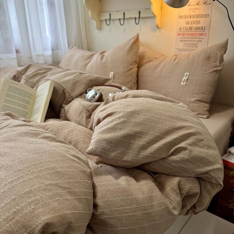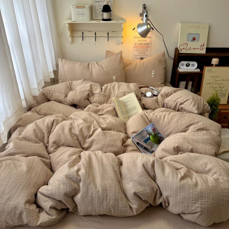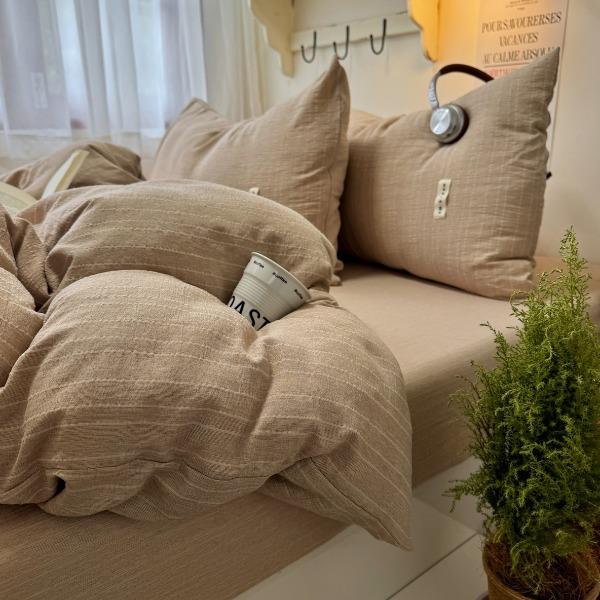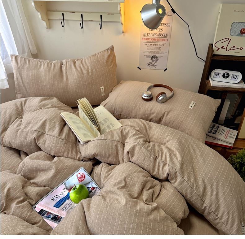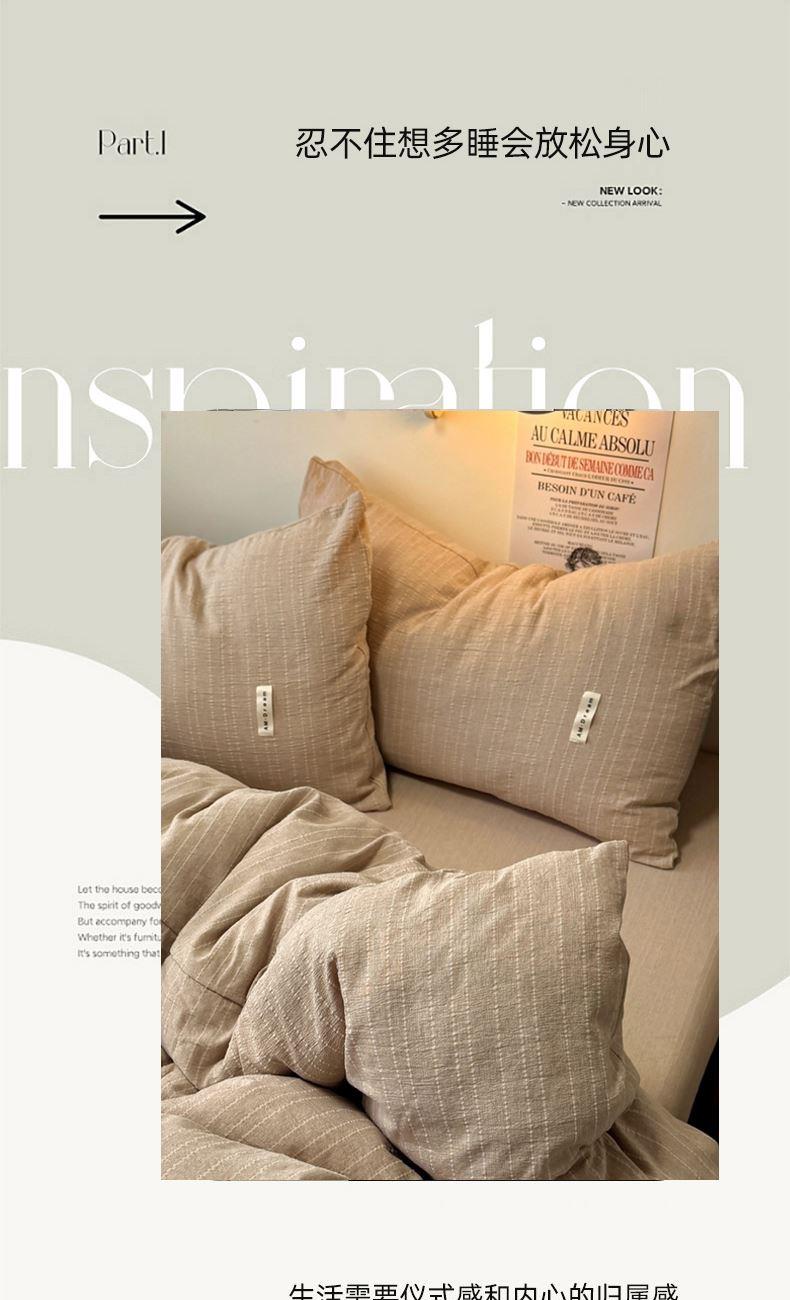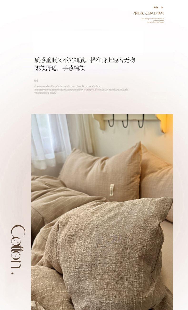 被套:200*230cm 床单:230*235cm 枕套:48*74cm*2 面料:泡芙棉 执行标准:GB/T22796-2021 安全类别:GB18401-2010 B类 1.面料采用生态亲肤棉,新型环保浆料活性印染,不褪色,不缩水,其生态环保理念在很大程度上满足了消费者对床品舒适度的高要。 2.生态棉面料,手感柔软,舒适质感丰厚,而且有厚重感,容易打理。整体套件,色彩丰富自然,阵线细致密实,错落有序,更显档次。