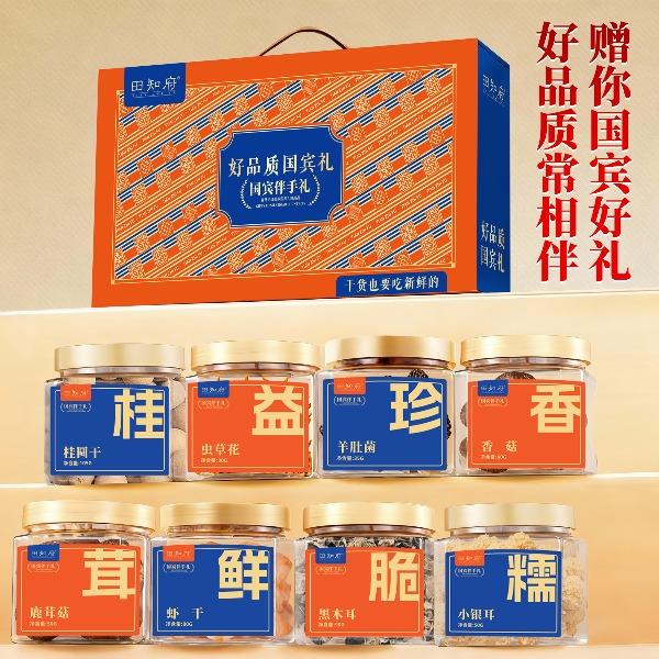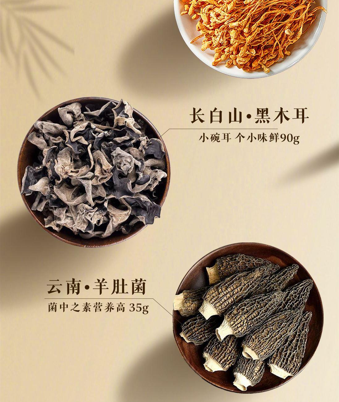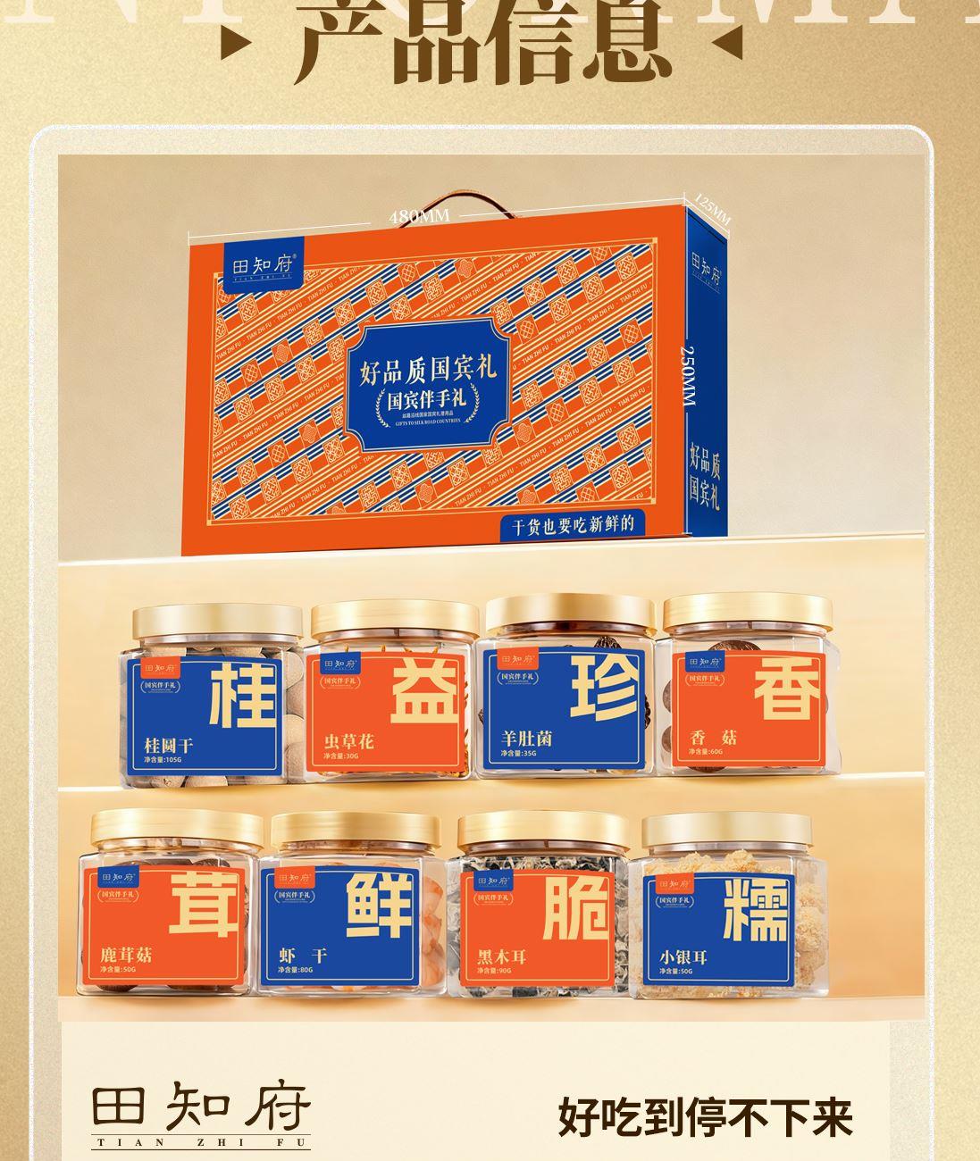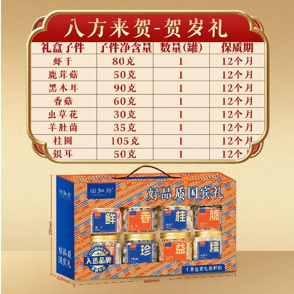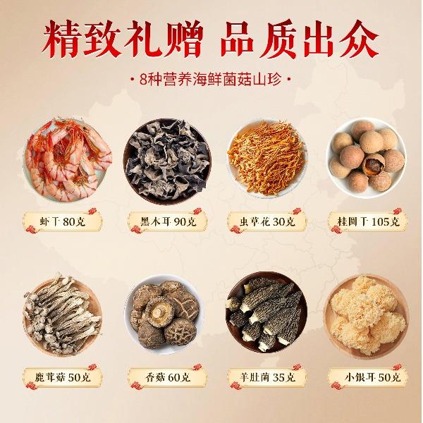 配置:银耳50g、鹿茸菇 50g、黑木耳90g、香菇60g、桂圆105g、虫草花30g、羊肚菌35g、虾干 80g 商品规格:500g/盒 产品尺寸:450*250*125mm 保质期:12个月 京东自营销量好评1w+,源头工厂,支持项目授权,项目保护