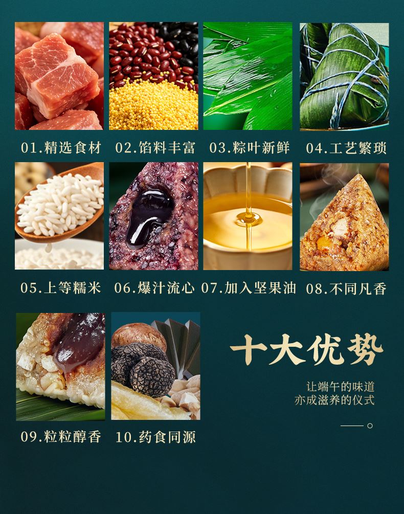 120g东坡肉爆汁粽*1 100g香糯紫薯粽*1 100g金丝蜜枣粽*1 100g清香原味粽*1 60g海鸭蛋*2