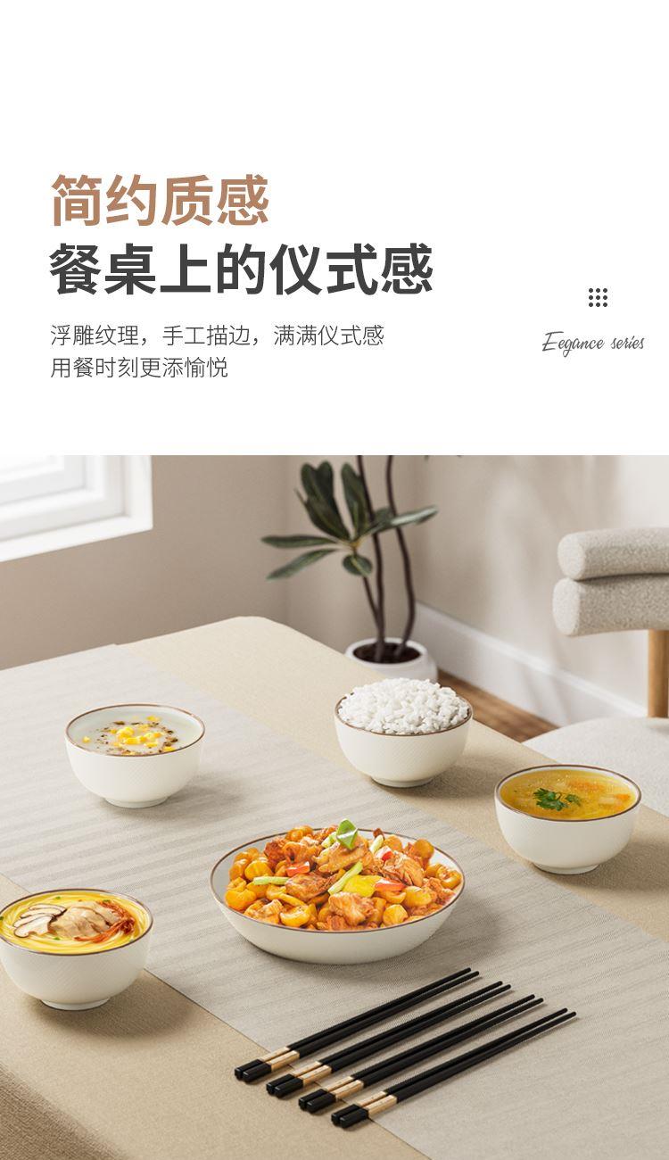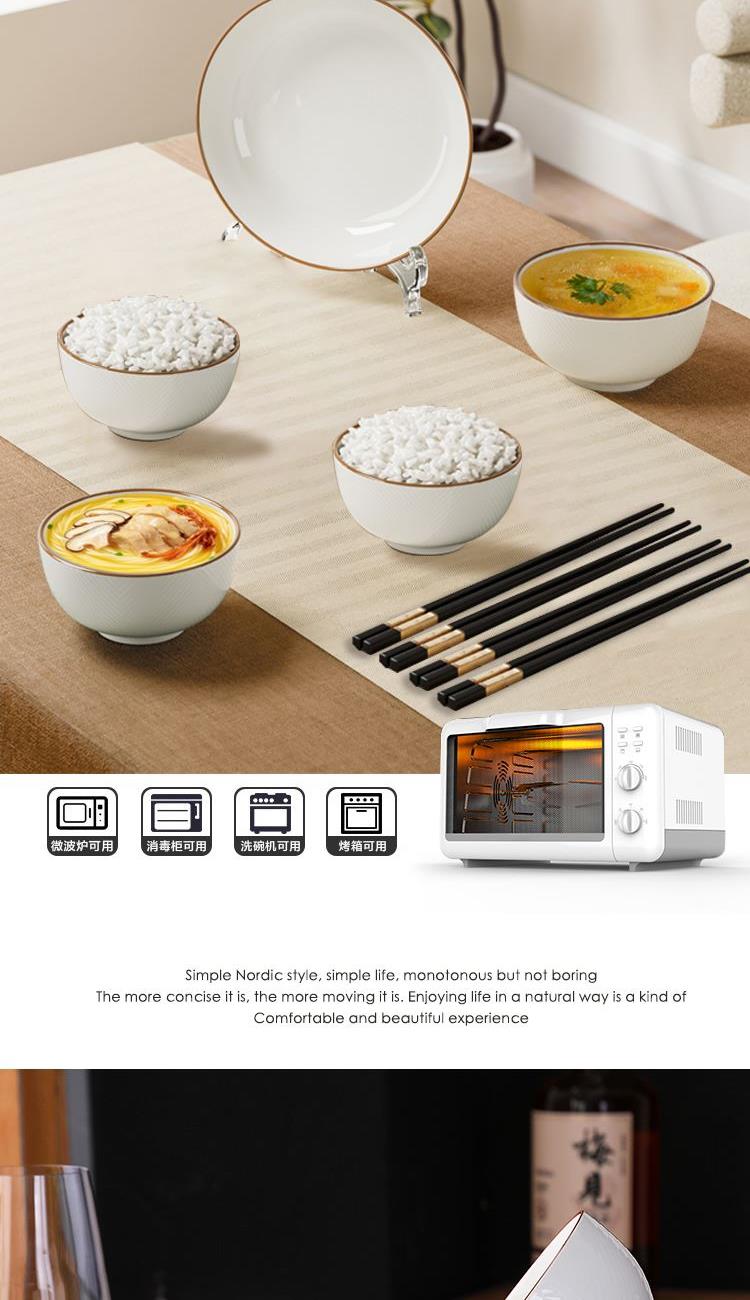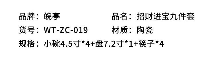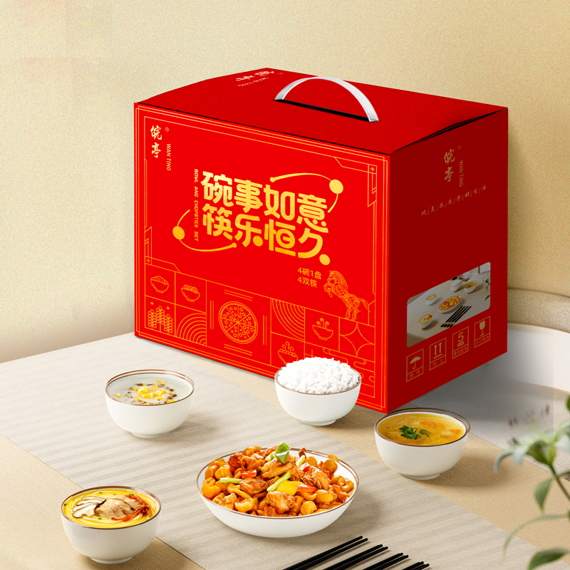 【产品材质】:陶瓷+合金筷 【产品规格】:4.5寸X4小碗+7.2寸*1盘+4合金筷 【彩盒尺寸】:25.5*12.5*24cm 【外箱尺寸】:53*39.5*50cm 陶瓷餐具造型简单、细腻光滑、且便于清洗。 瓷质厚实,端拿不烫手,起防滑作用,表面釉层保护,光洁明亮。