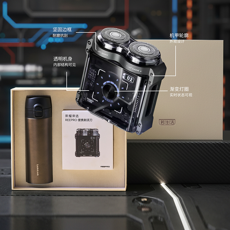 产品组合:乐扣保温杯+荣耀机甲剃须刀 产品规格:礼盒26*23*7.8cm 剃须刀:5.3*2.9*6.3cm 乐扣保温杯:6*6*18.cm,340ml 材质:316L不锈钢、PP 包装:精装礼盒