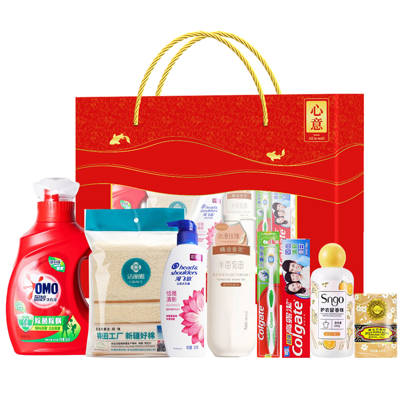 礼盒尺寸:32*8.5*24.5cm 包装尺寸:66*46.5*51CM 产品配置:(香型随机) 海飞丝洗发水-300ml 半亩花田沐浴露-500ml 奥妙洗衣液-950g SNGO护衣留香珠-220g 高露洁牙膏-90g 高露洁牙刷 蜂花檀香皂-125g 洁丽雅毛巾-69*33cm 精美礼盒