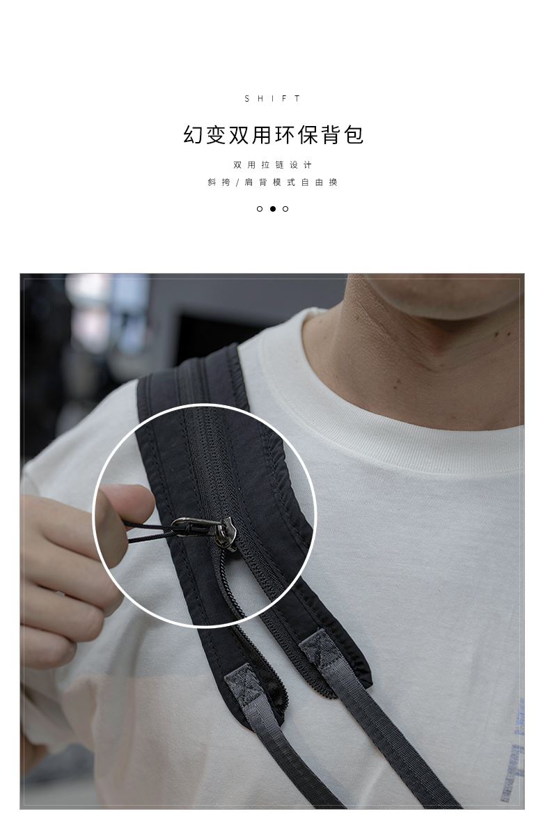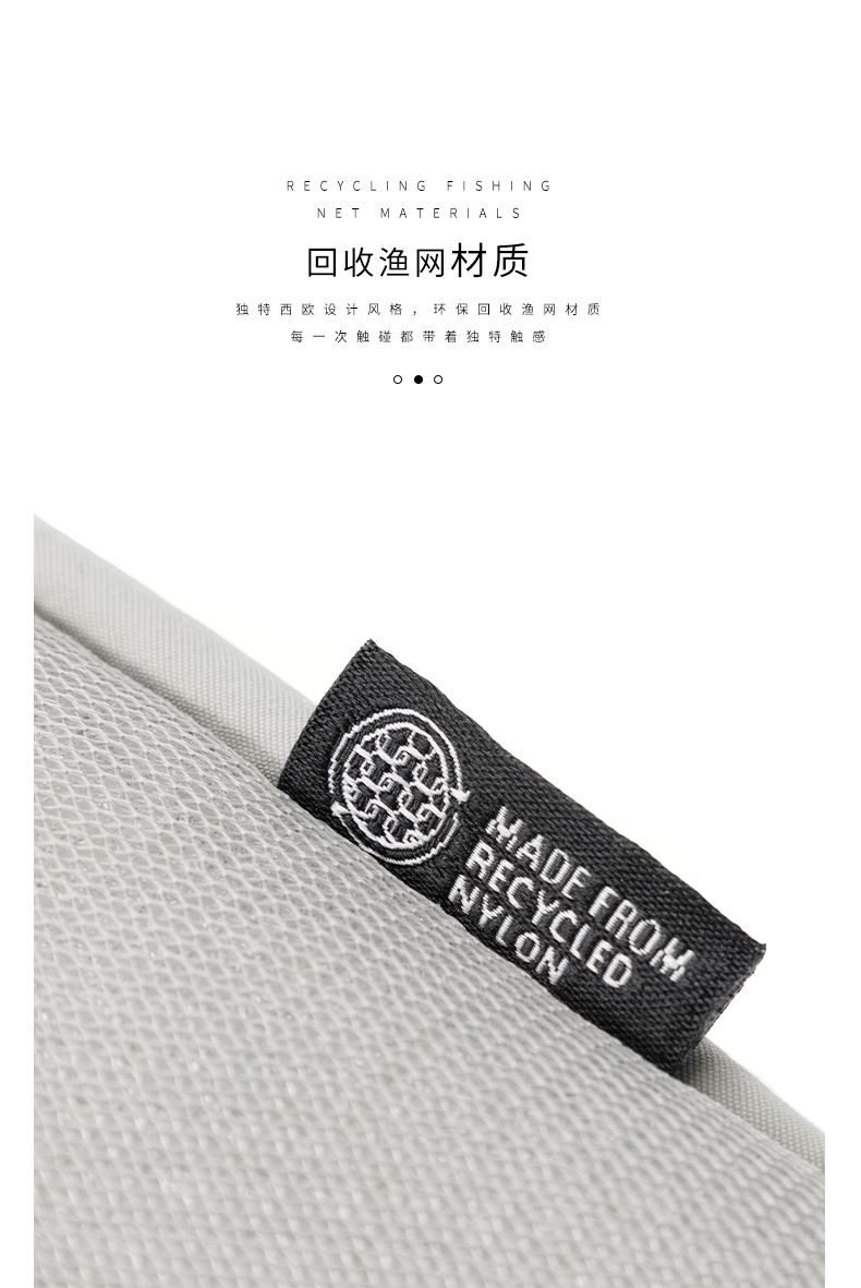 · 由回收渔网制成,独特耐磨纹理面料· 防水防污功能,无惧雨雪天气· 拉链一拉斜挎包变双肩包—几秒内切换风格。创新式设计可双向拉链· 配备衬垫肩垫和透气背板,舒缓减少长时间佩戴的压力· 6.6L大容量设计,容纳你的必需品· 反光条设计,保护夜晚人身安全· 拥有国际RCS回收环保认证。2种颜色可选:云灰色、哑黑色。